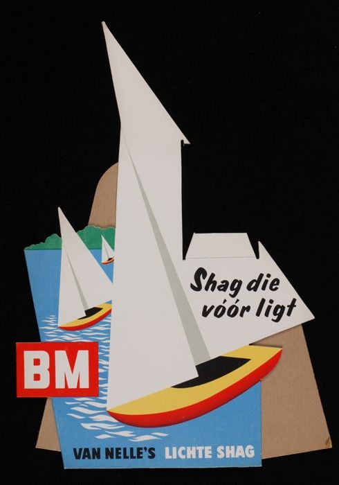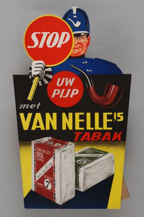 Reclamebord met pak shag en doos voor folders Van Ne...
