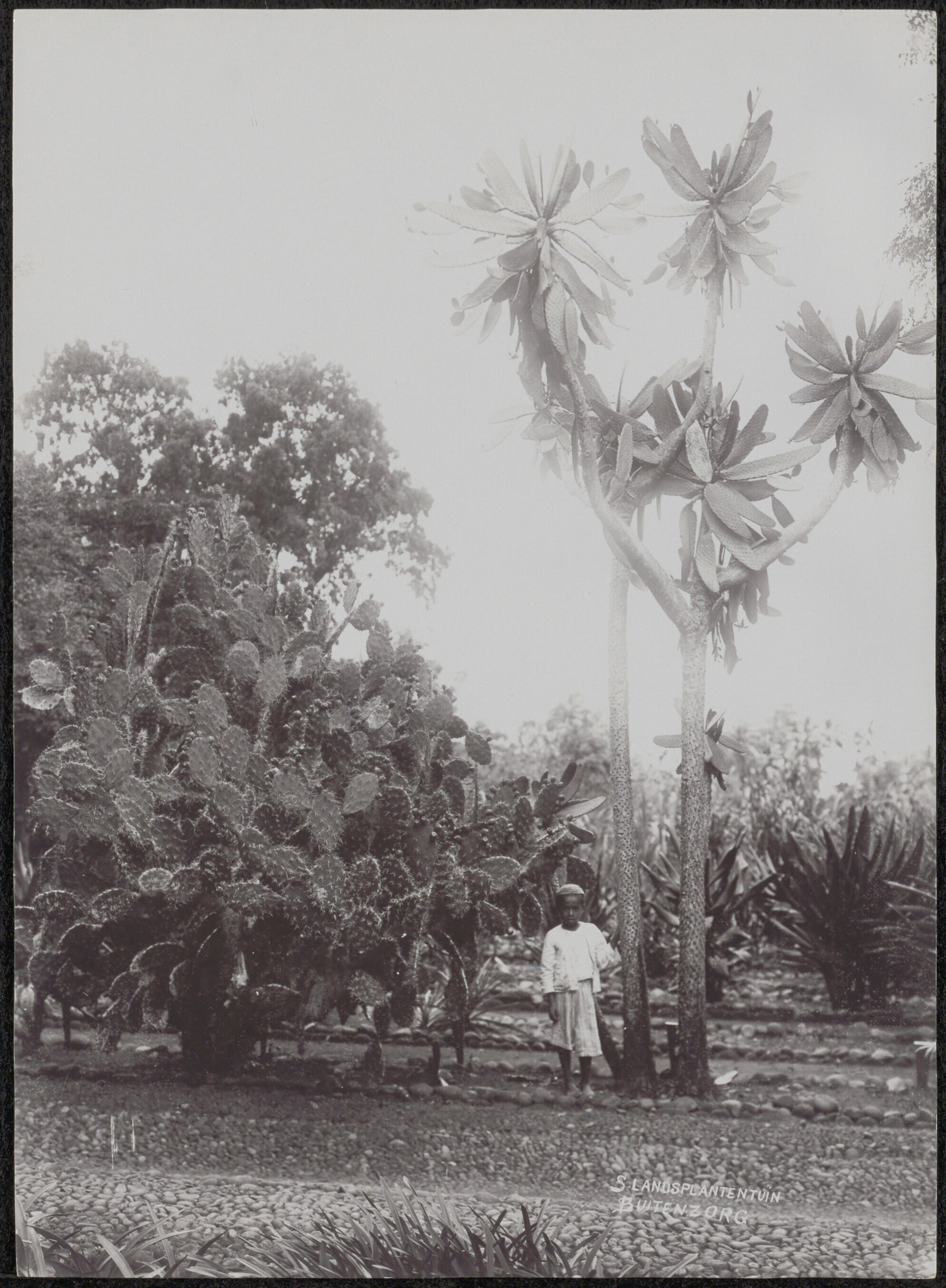 Jongen bij een cactus in 's Lands Plantentuin, Buite...