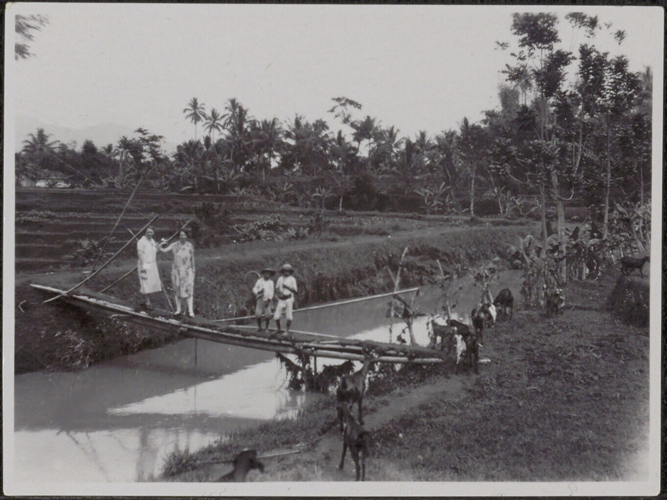 Twee vrouwen en twee jonge geitenherders op een brug