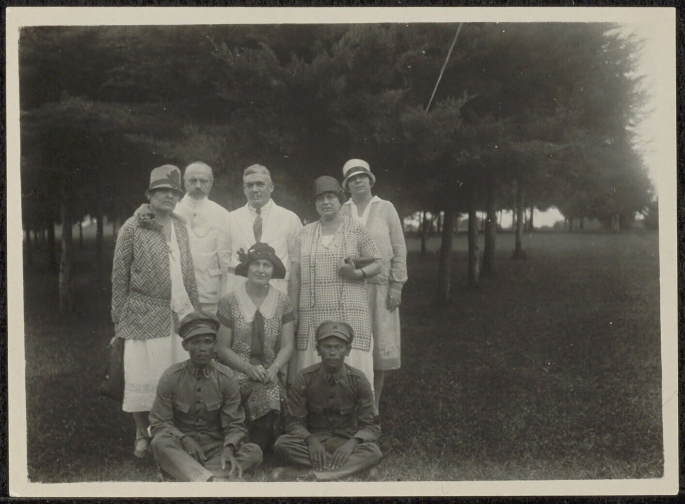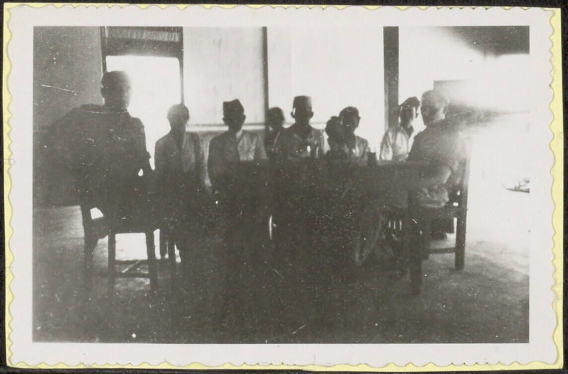 Groepsportret met twee mannen in uniform te Ngamplang