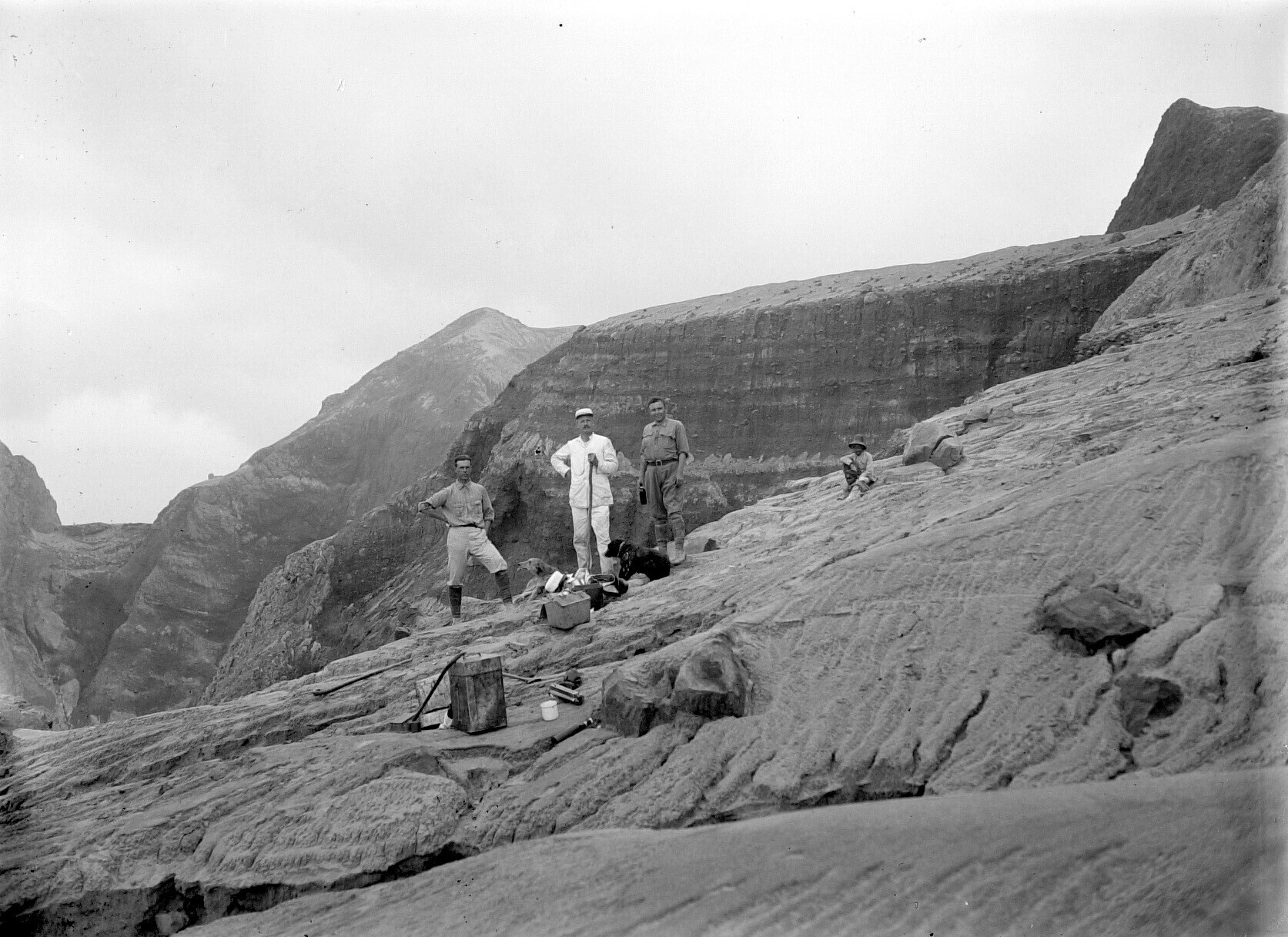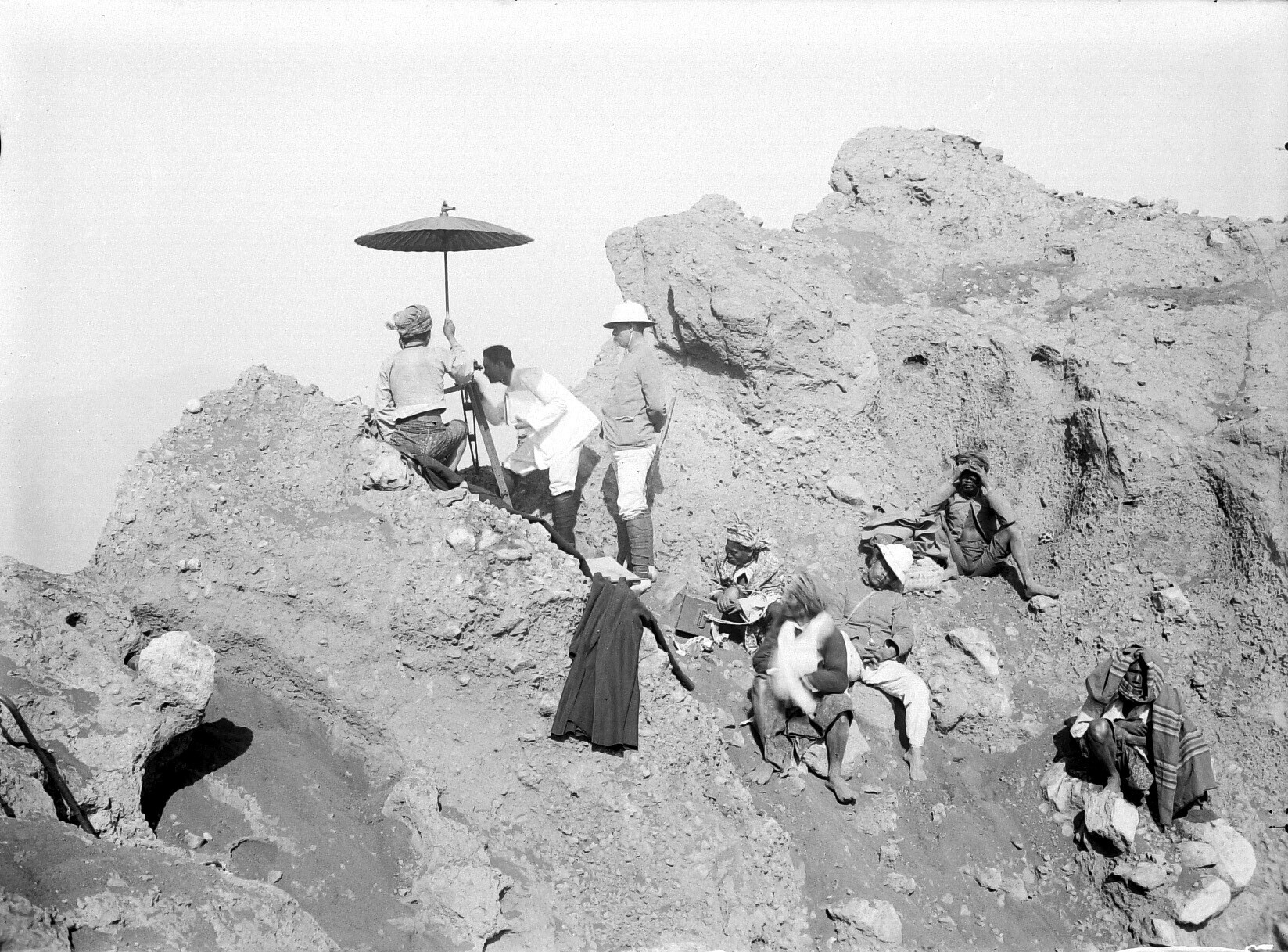 Opmetingswerkzaamheden (?) op de kraterrand van de v...
