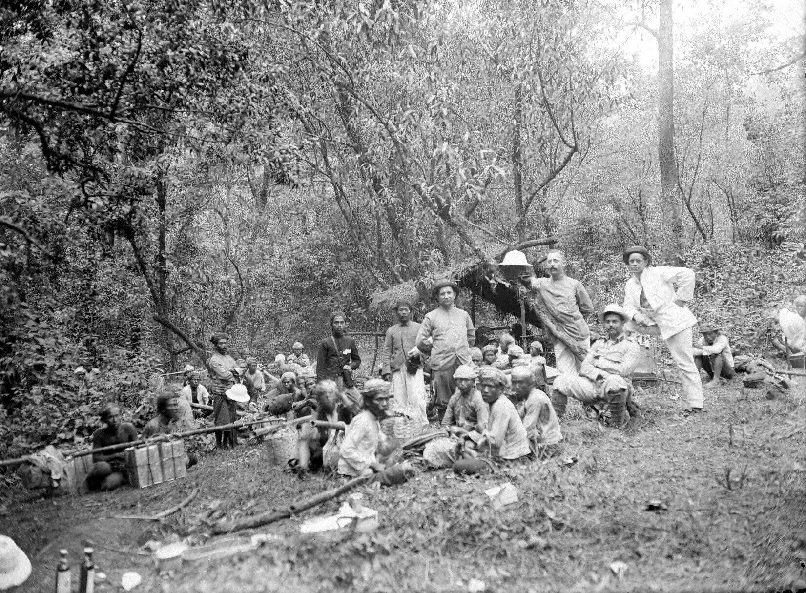 Europeaan met dragers voor een pondok van het Boschw...