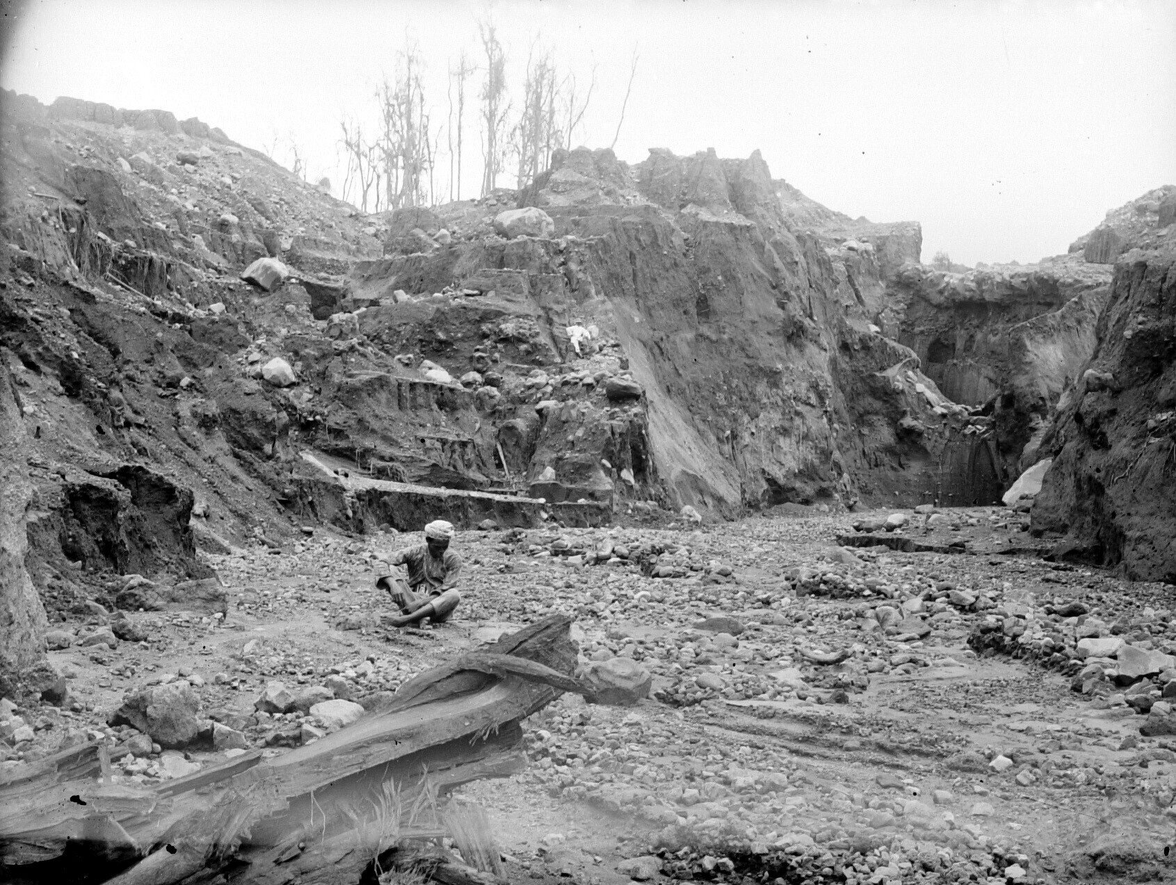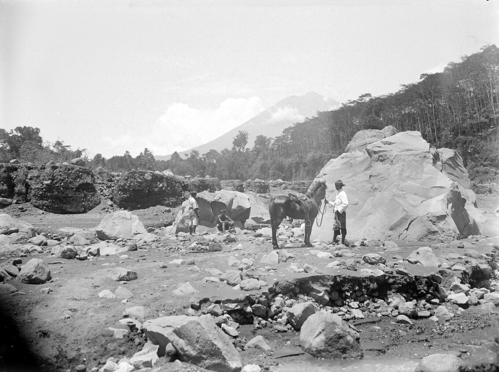 Rotsachtige rivierbedding aan de voet van de vulkaan...