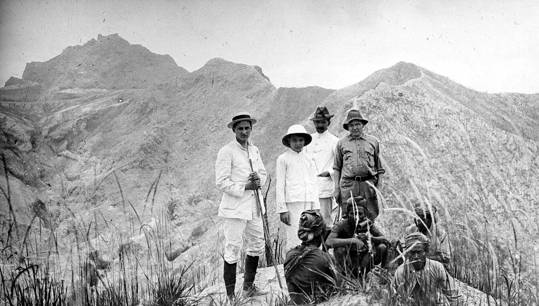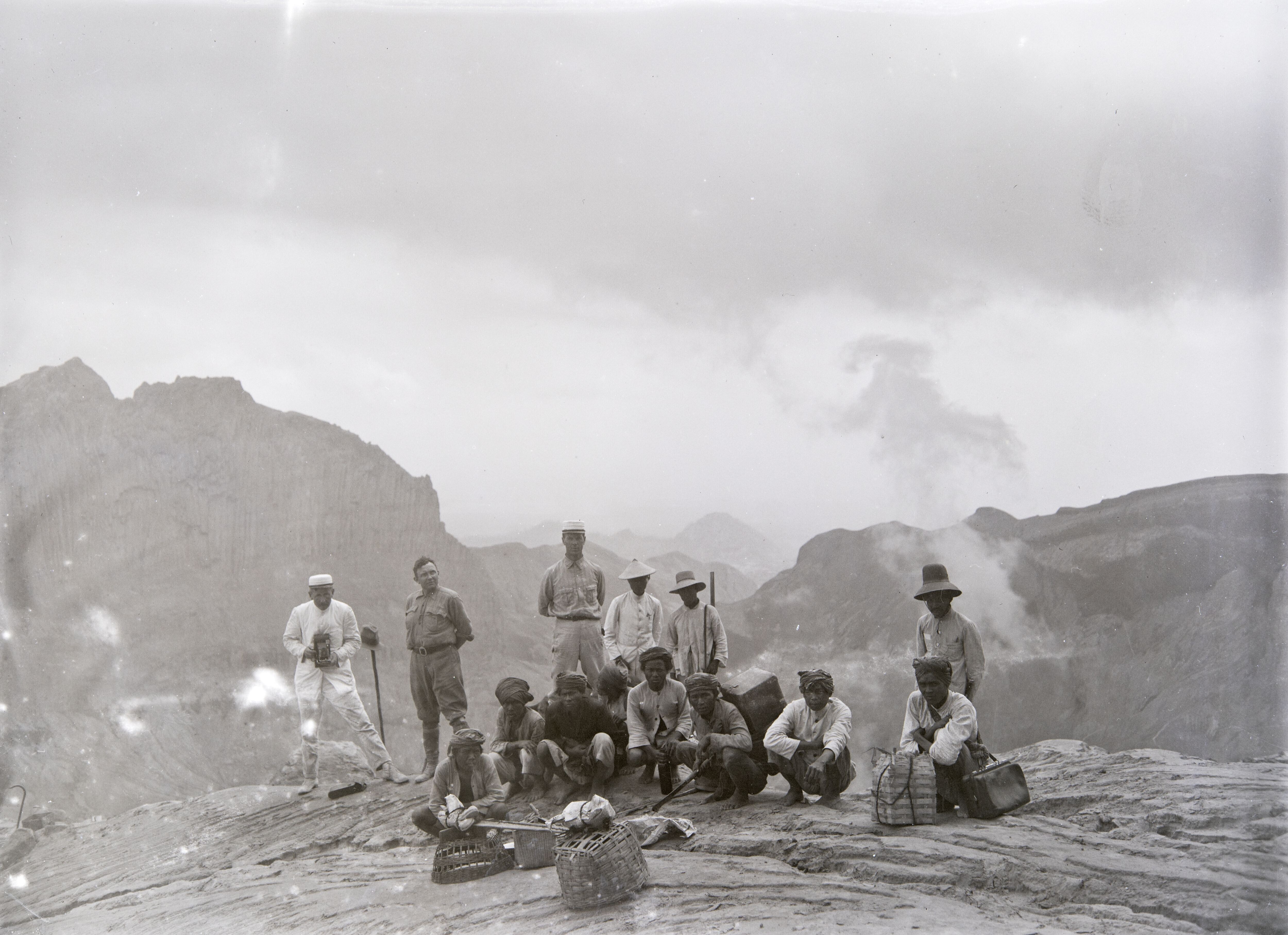 Portret van een groep dragers op de top van de vulka...