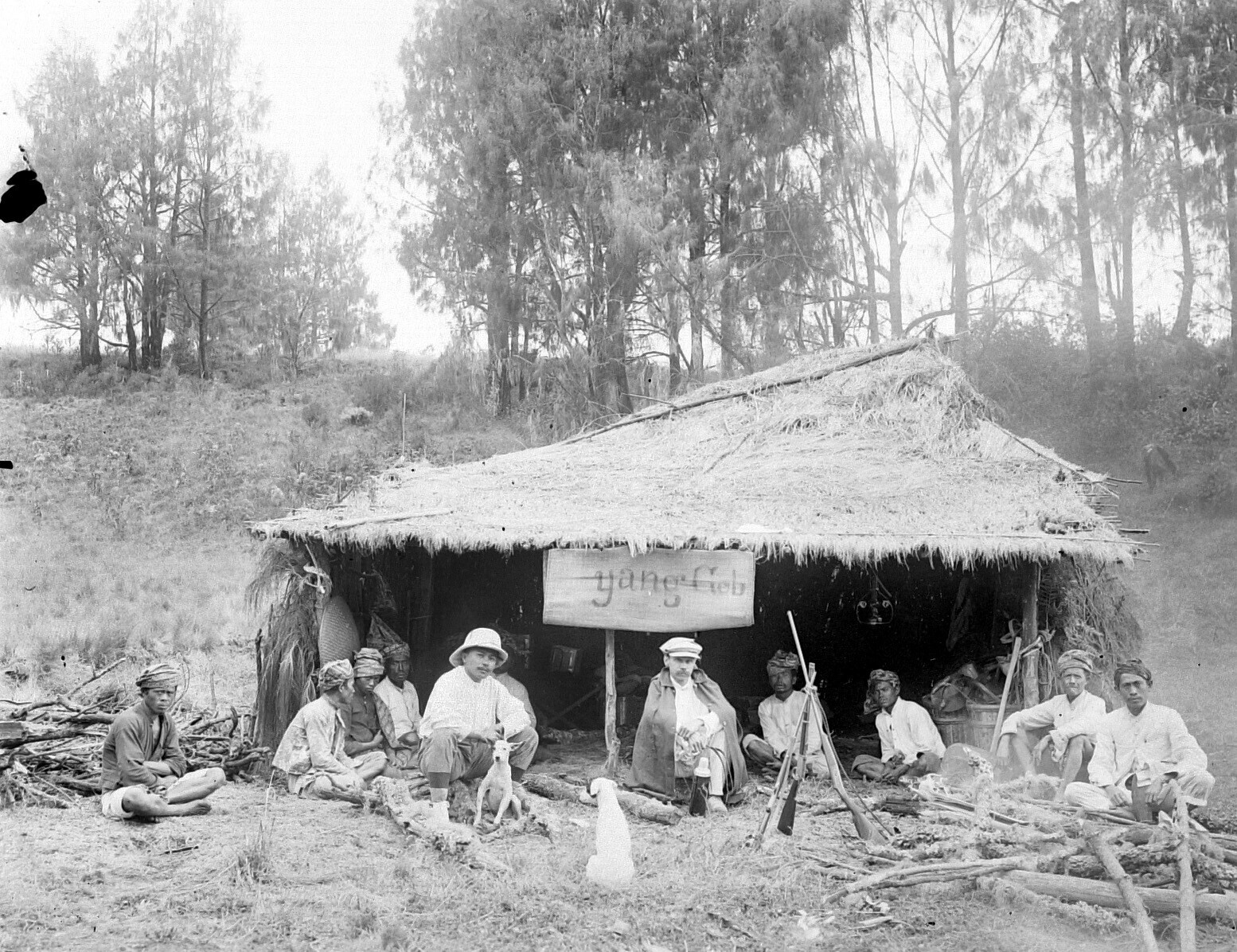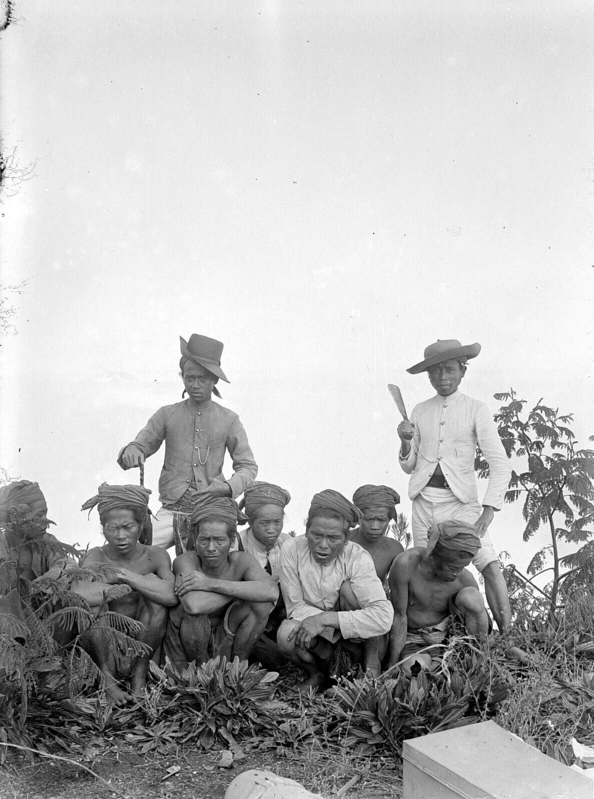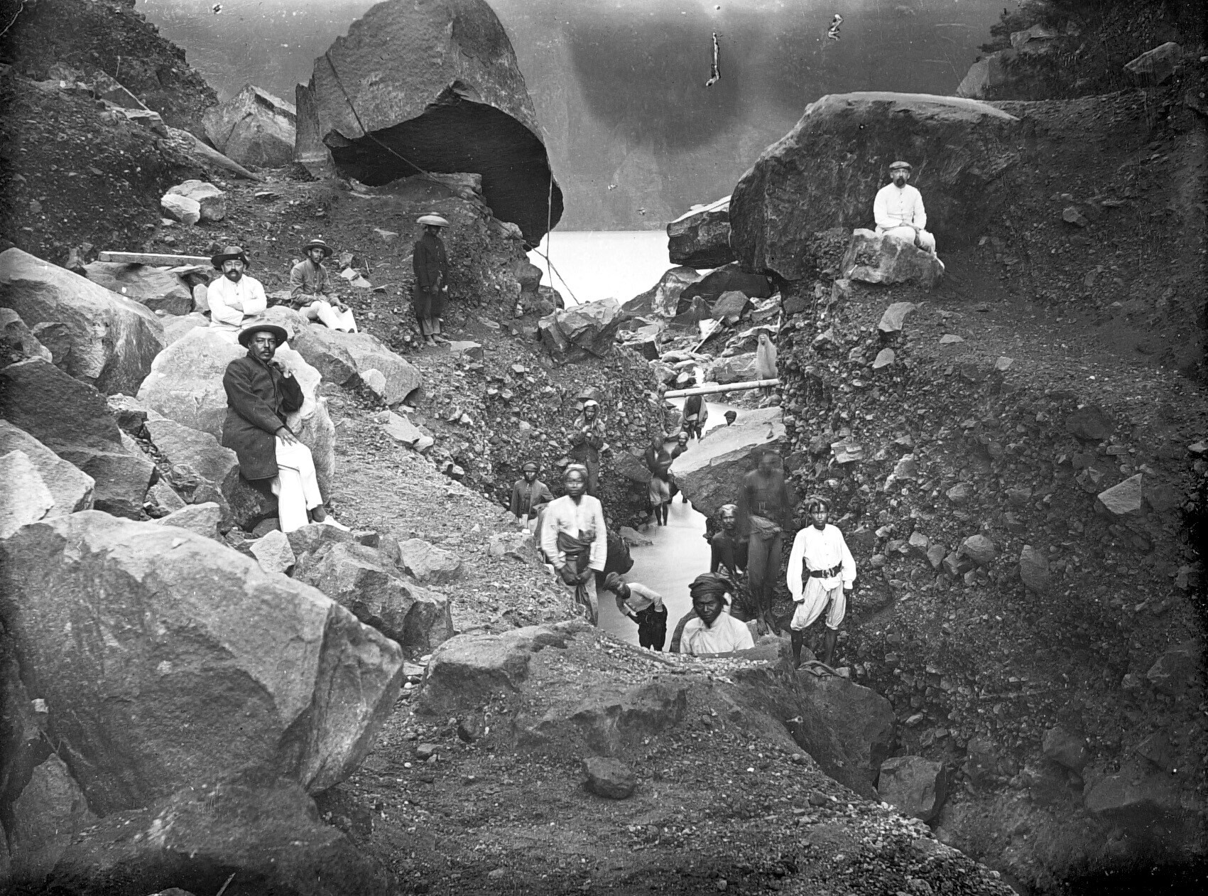 Portret van Europeanen en Javanen tussen rotsblokken...