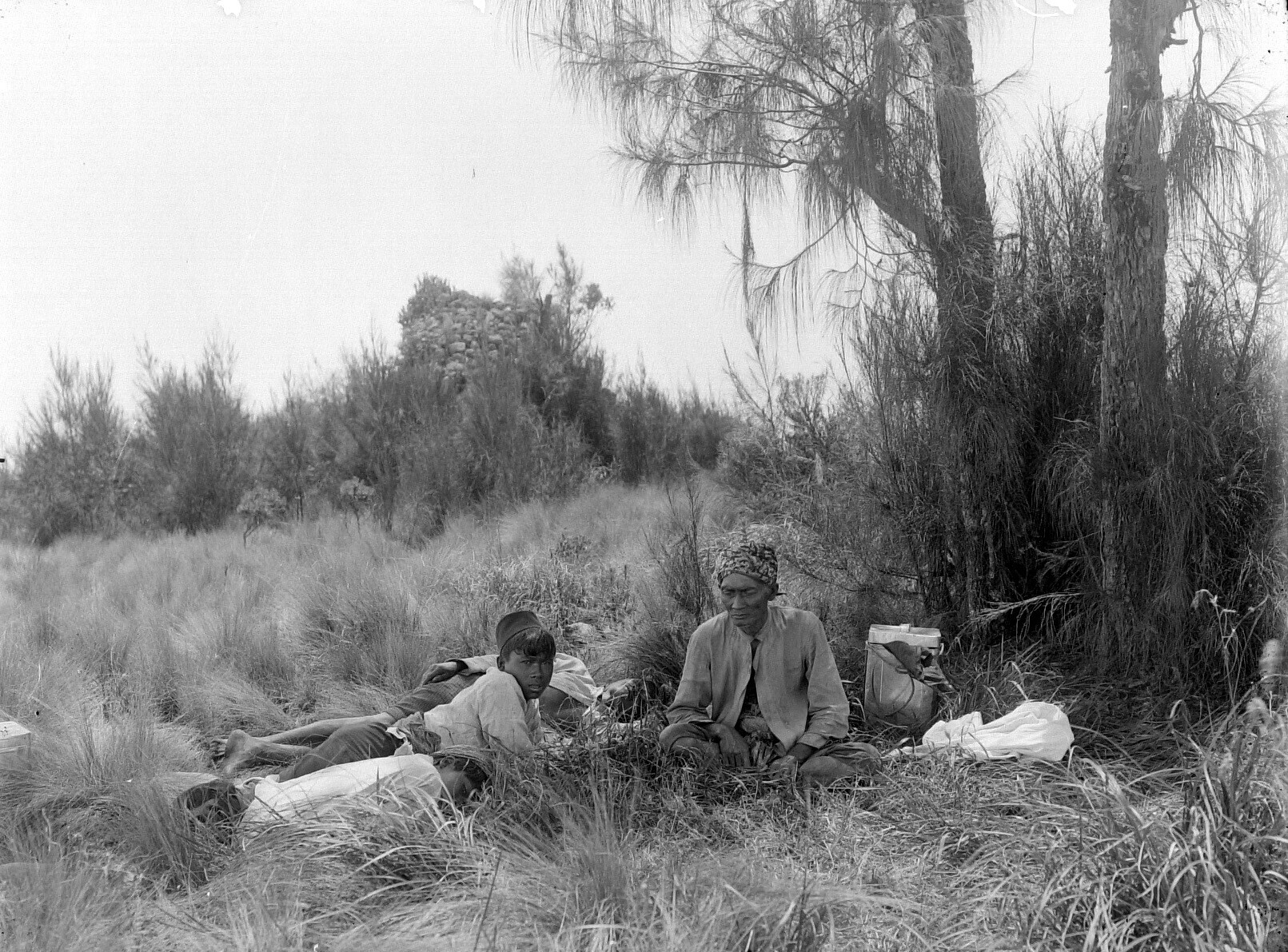 Mannen onder een Casuarina montana op de Argowulan i...