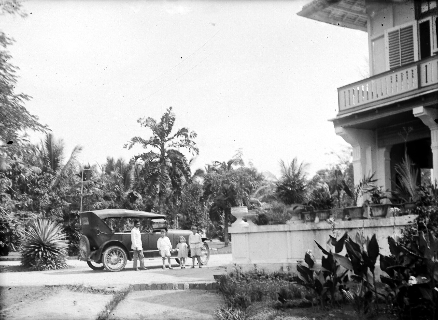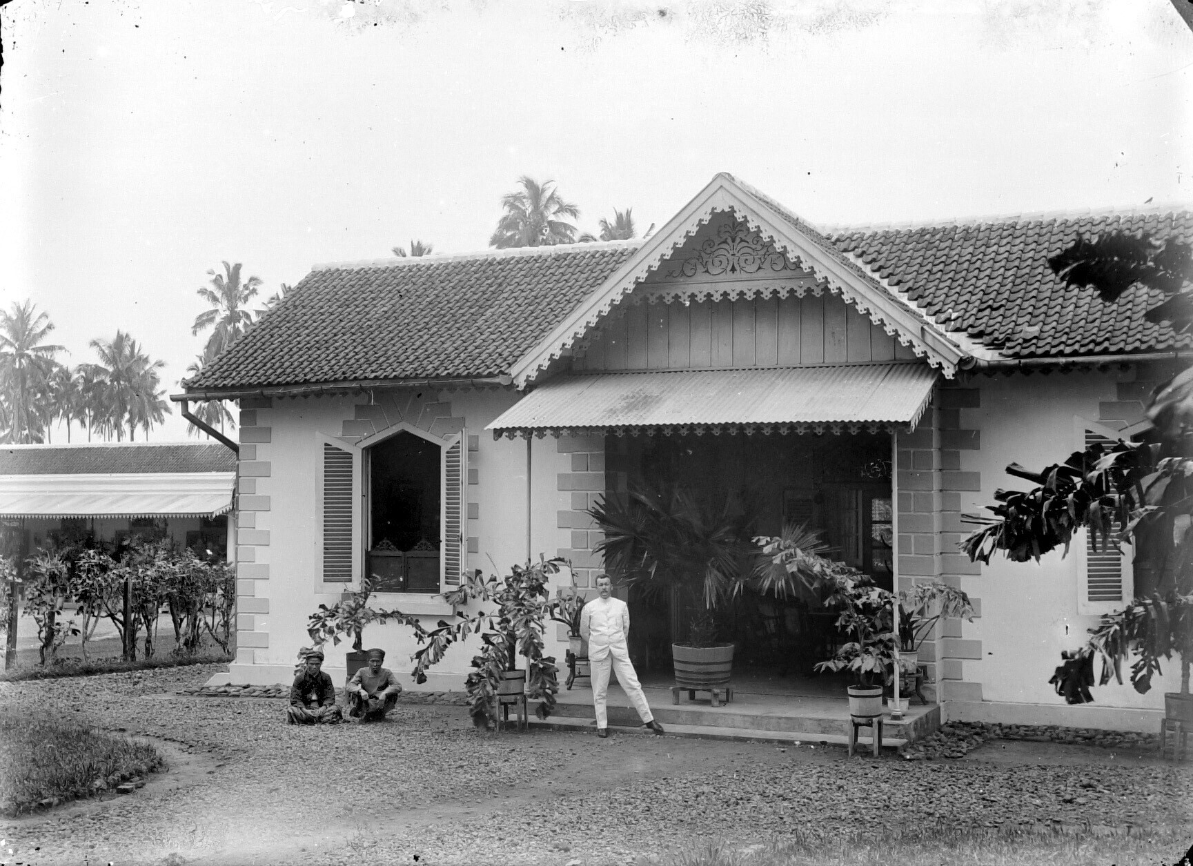 Europeaan met huispersoneel in de voortuin van een w...