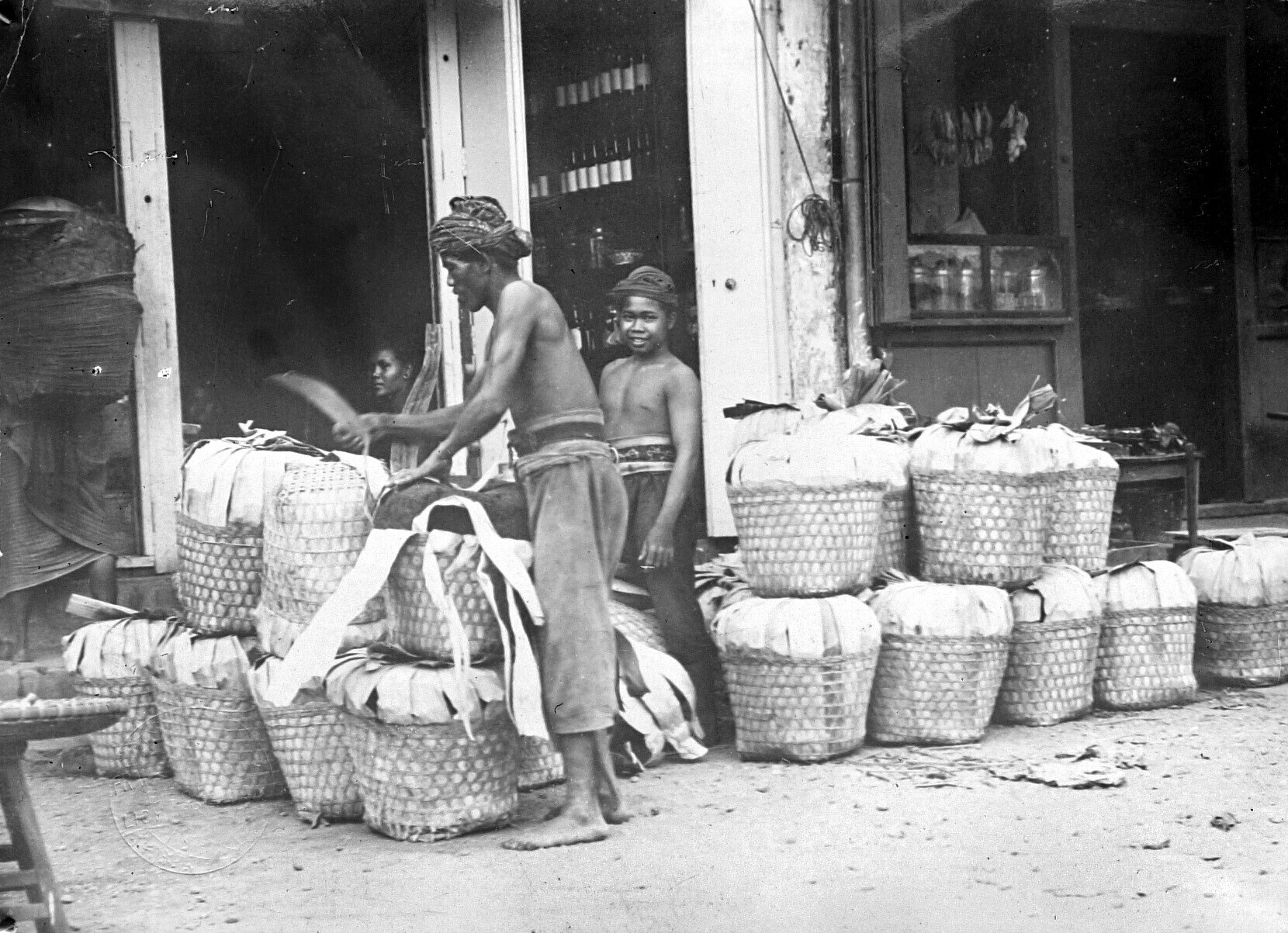 Verpakking van Inlandsche tabak in bamboemanden, de ...