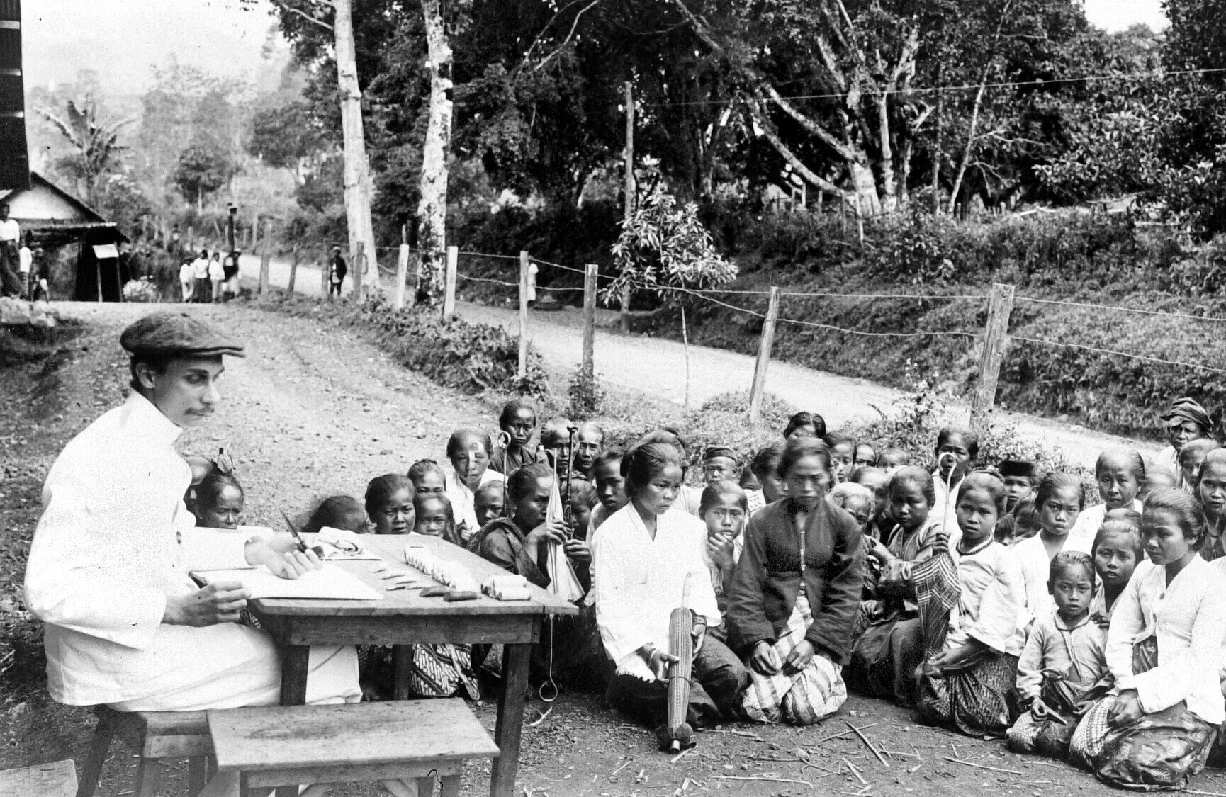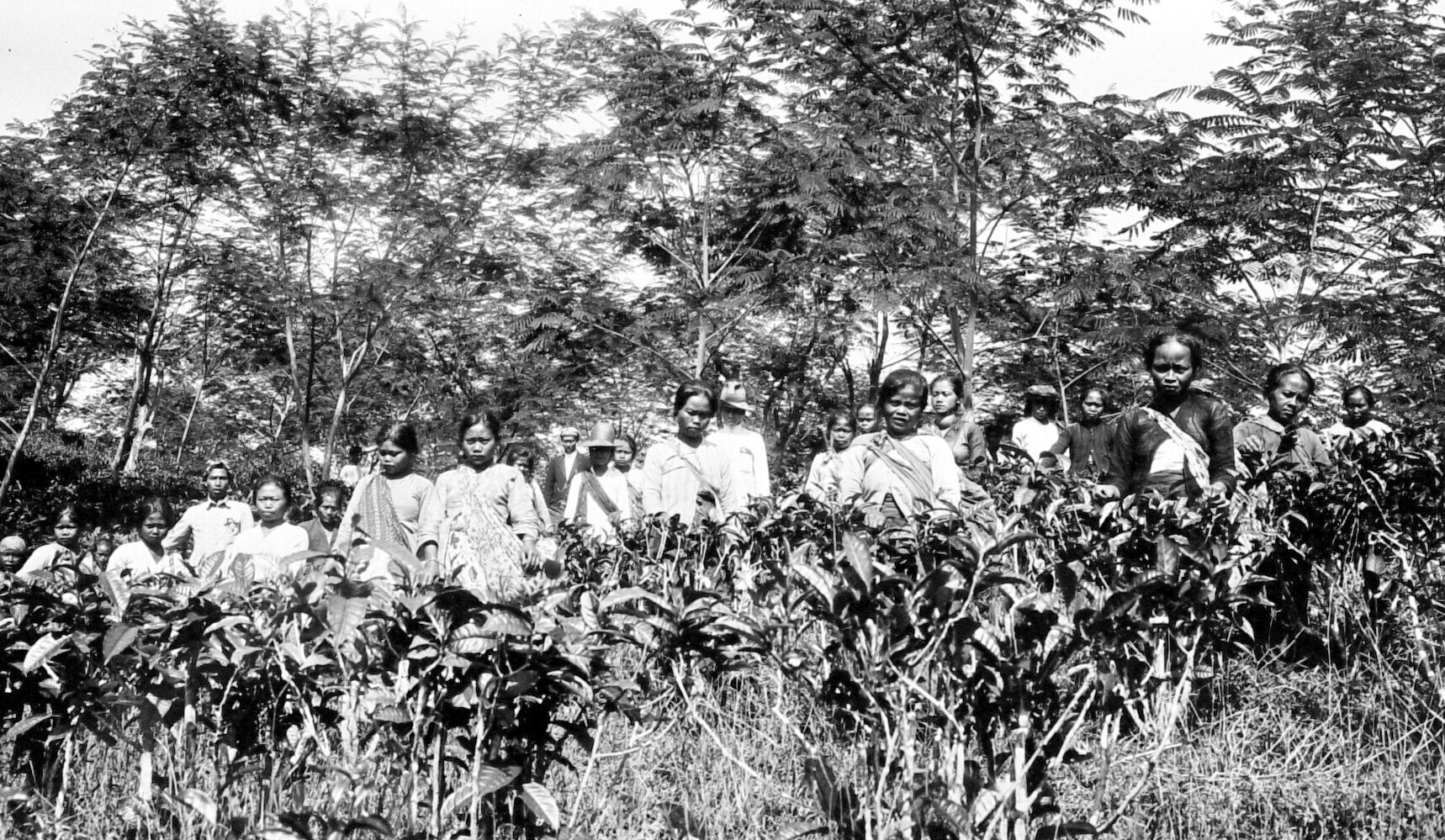 Paying wages to the tea pickers on the Tjiliwoeng pl...