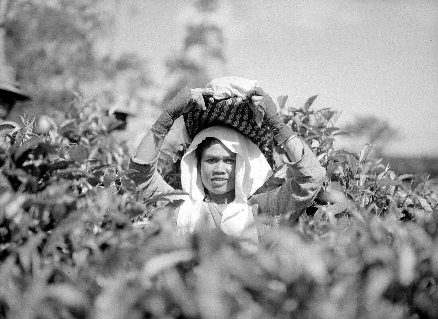 Thee: plukvrouw met plukdoek, Tanara, Preanger