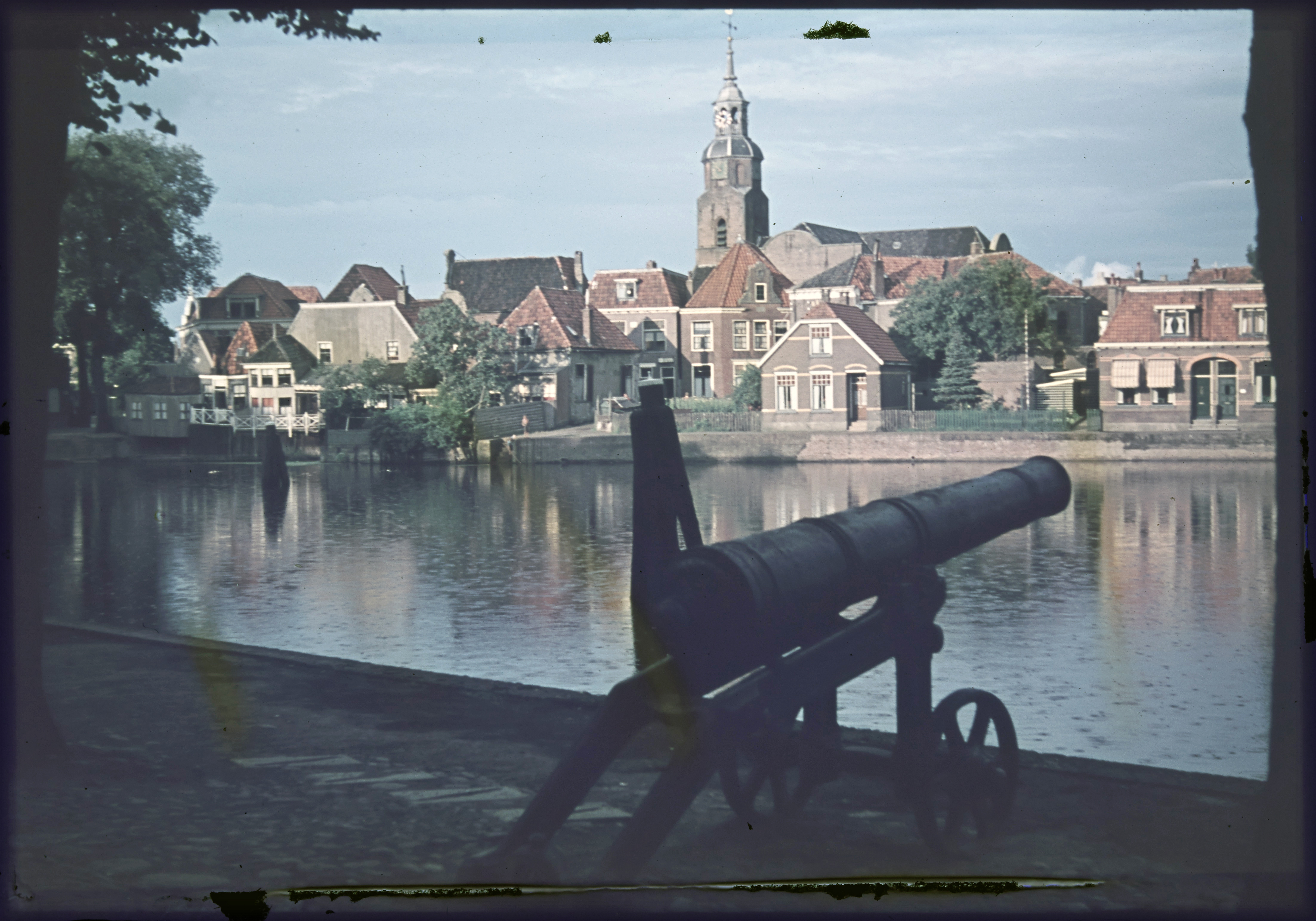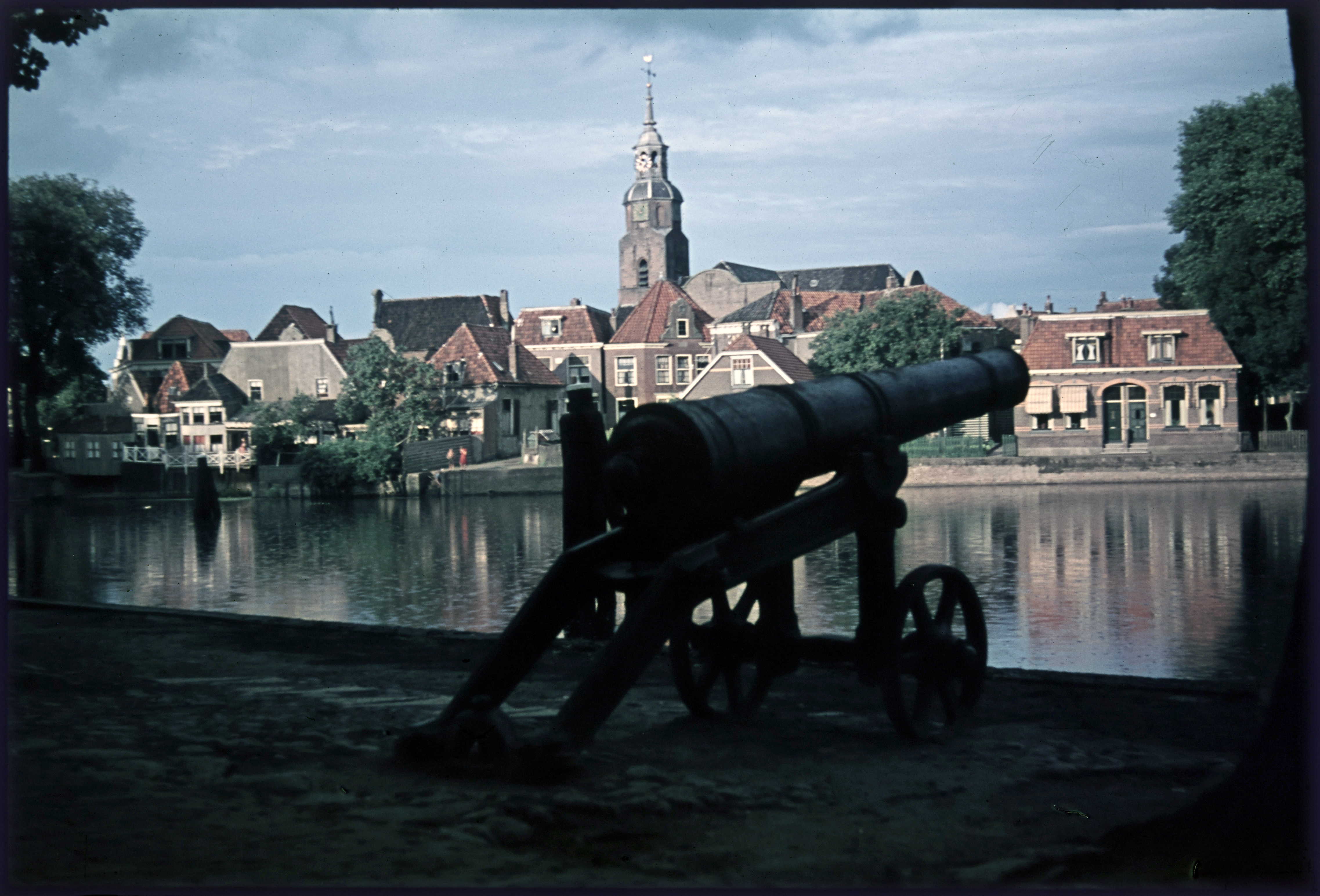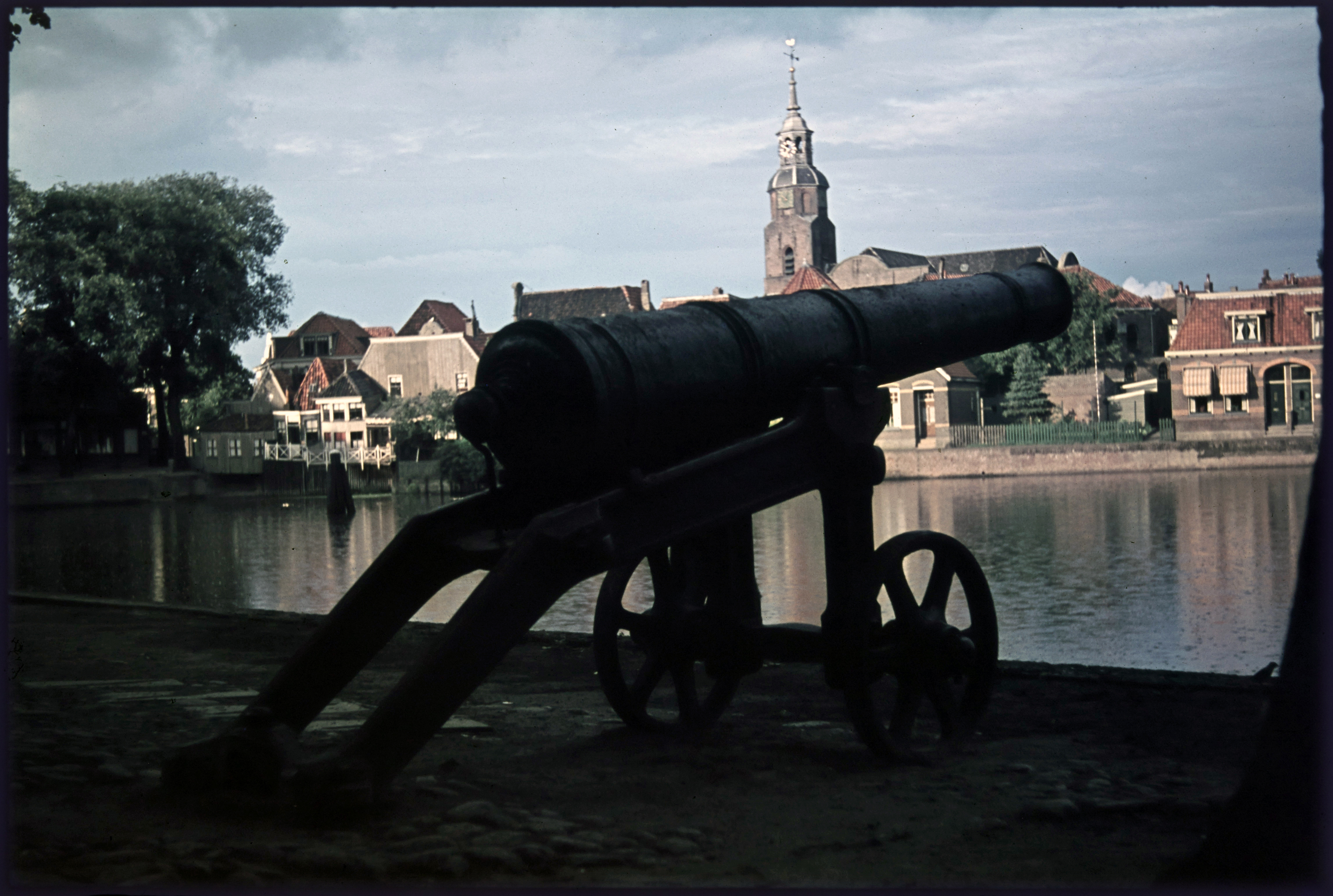 Kanon aan de haven met kerk aan overzijde