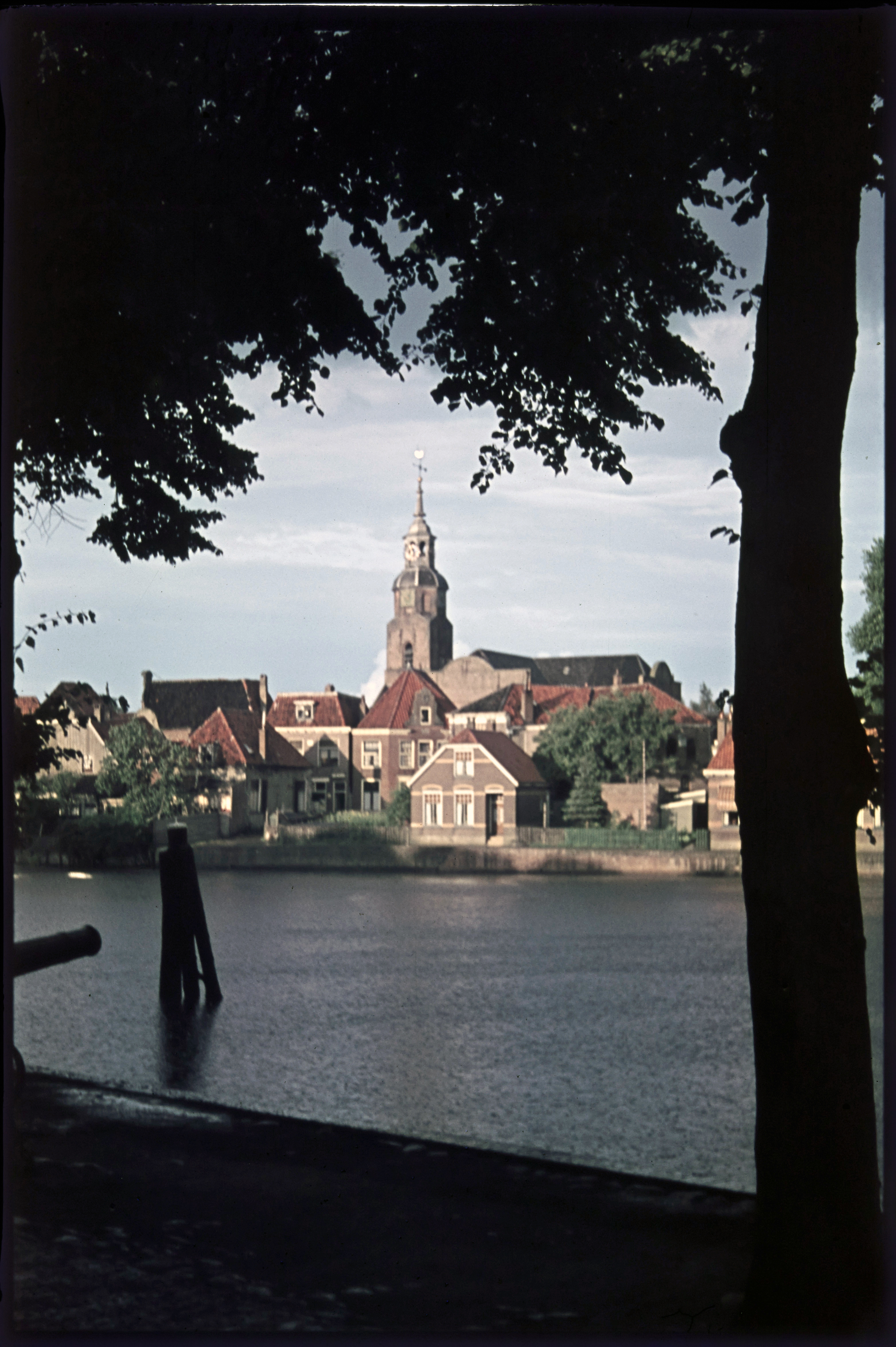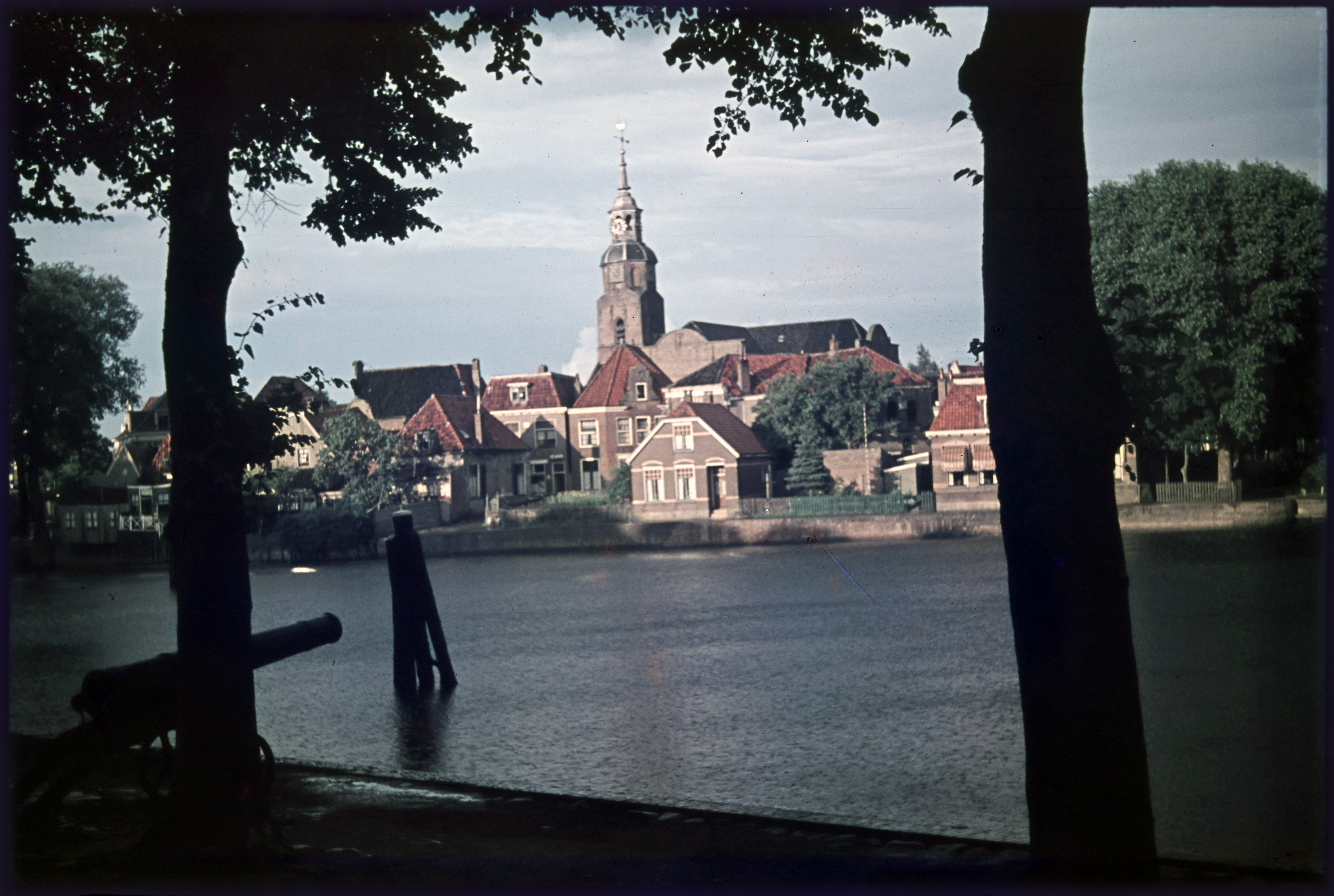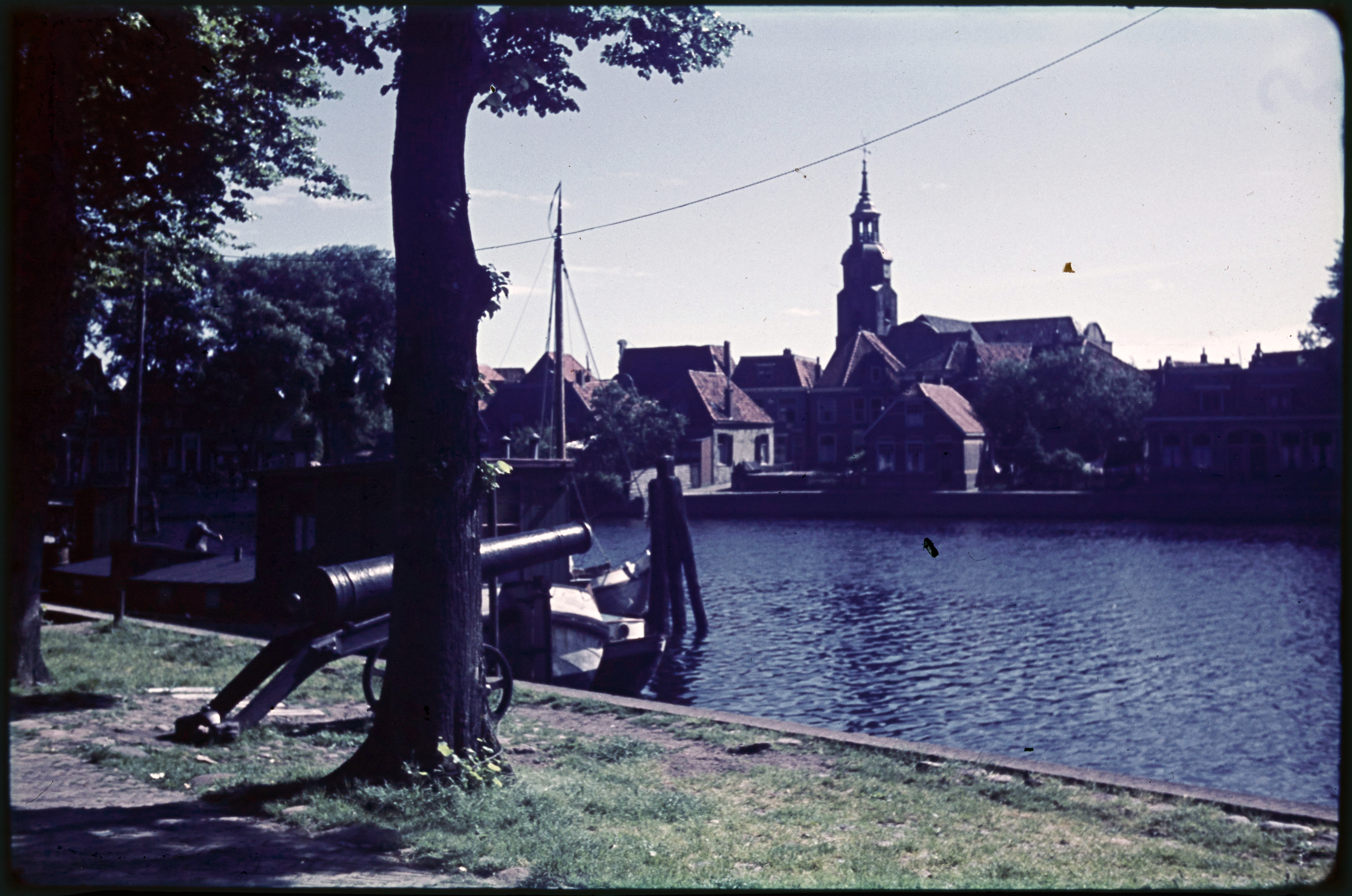 Kanon aan de haven met kerk aan overzijde