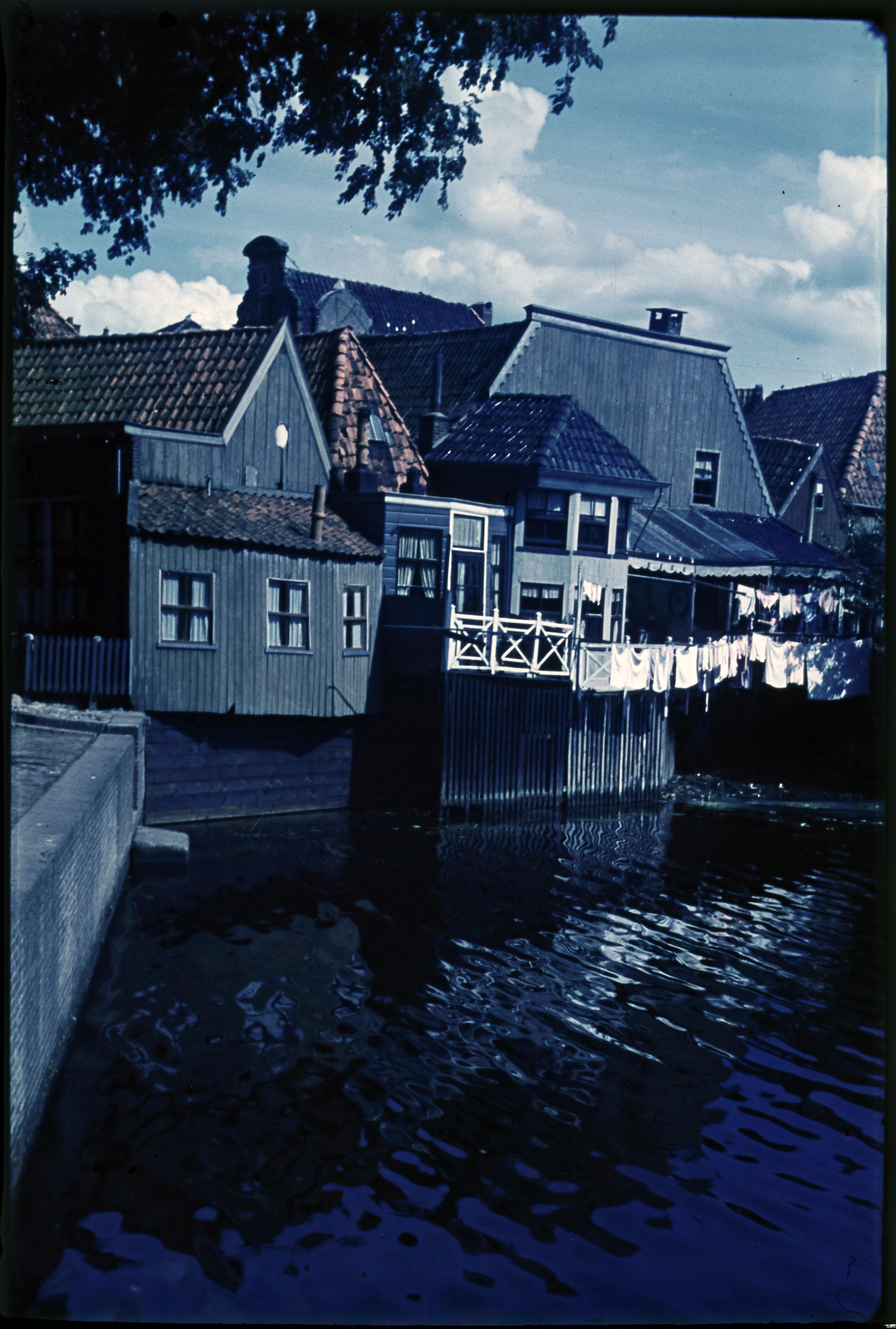 Huizen met een houten uitbouw boven het water in Blo...