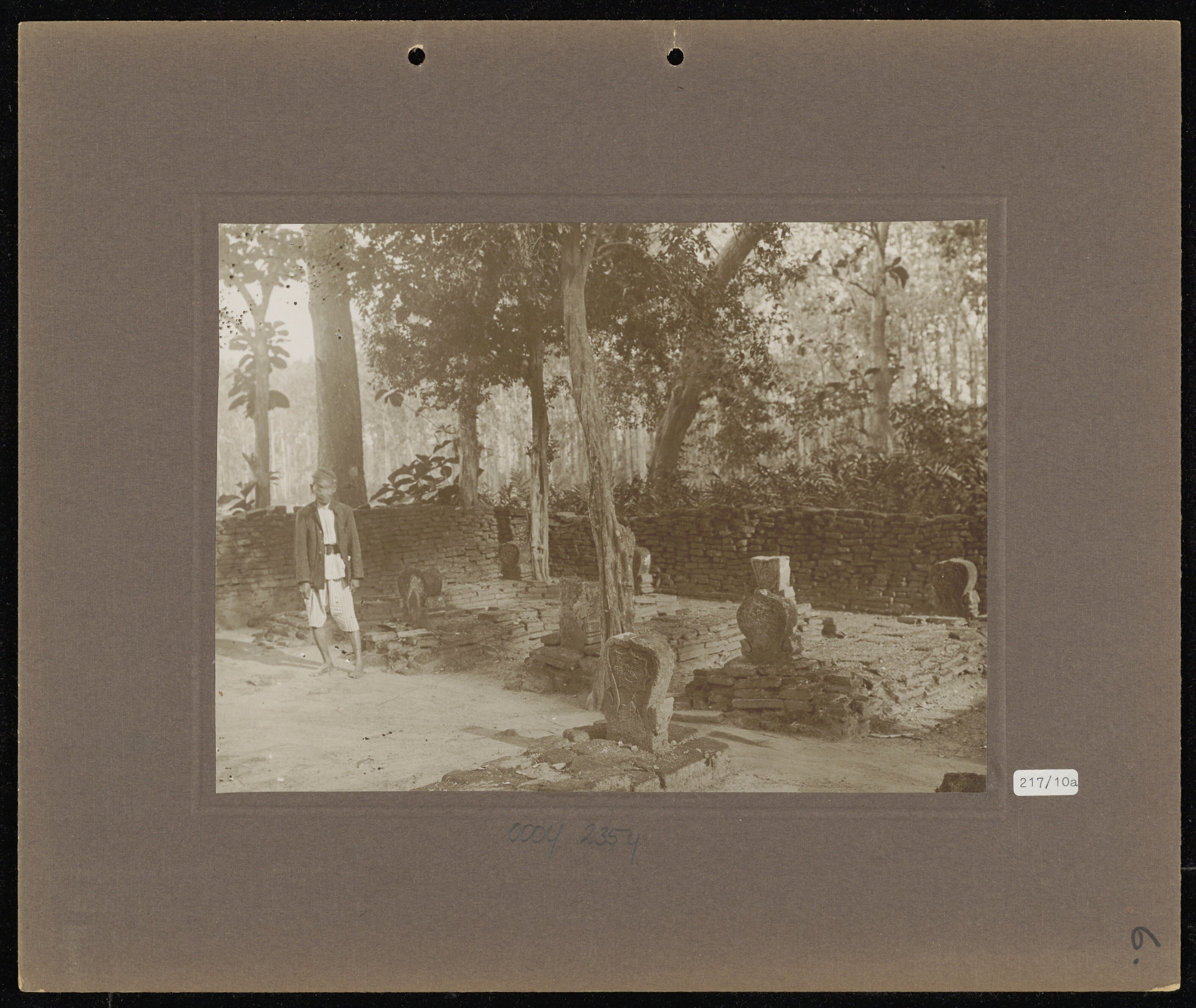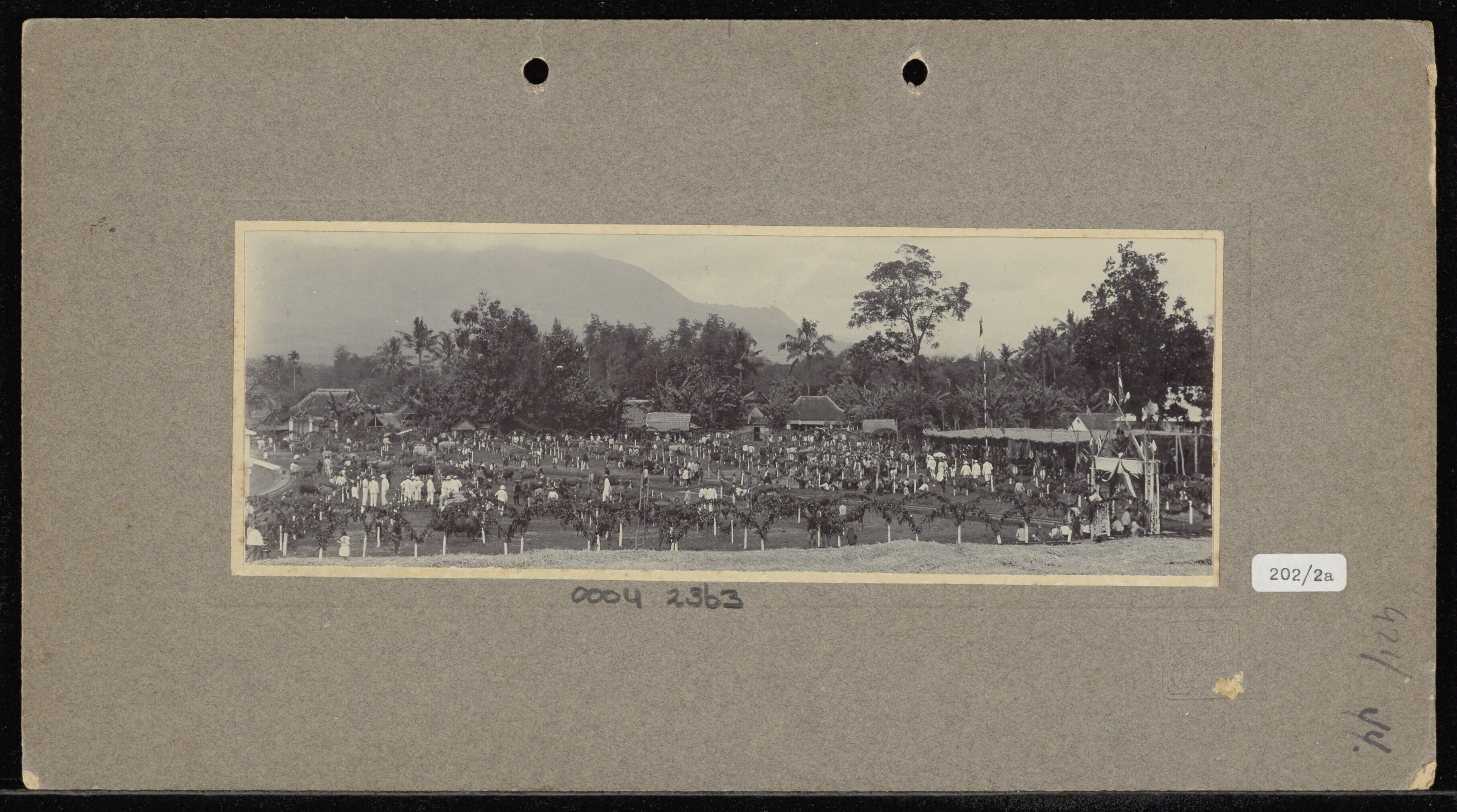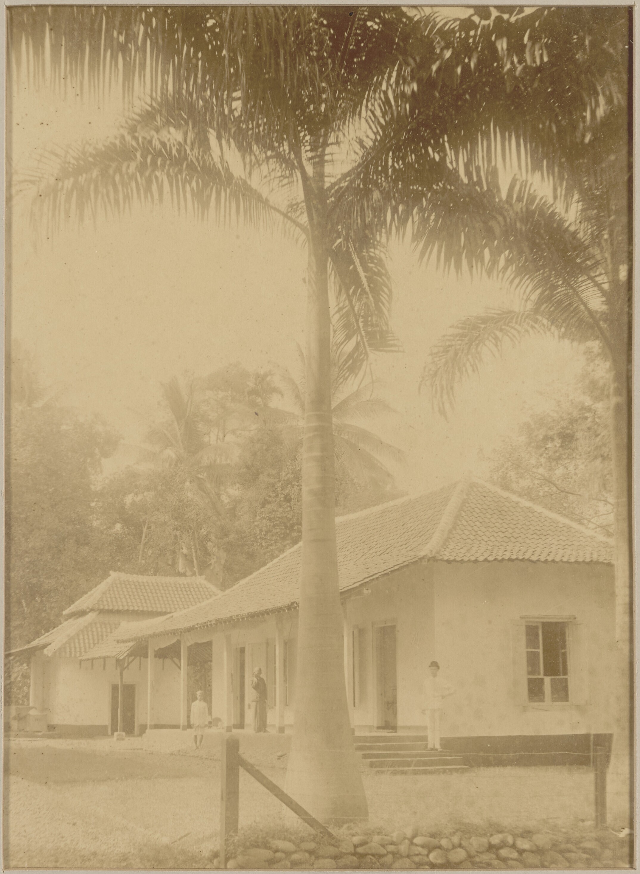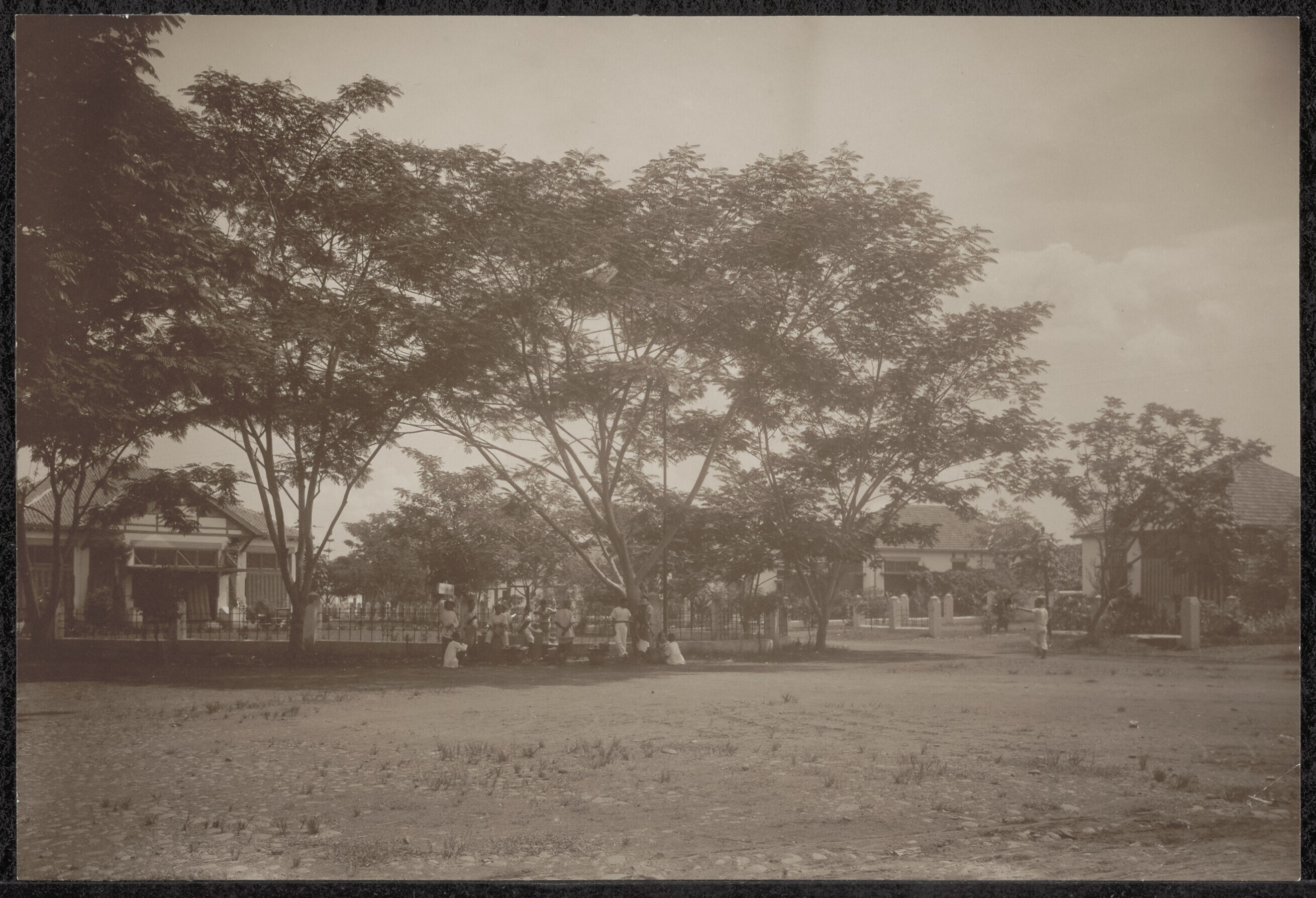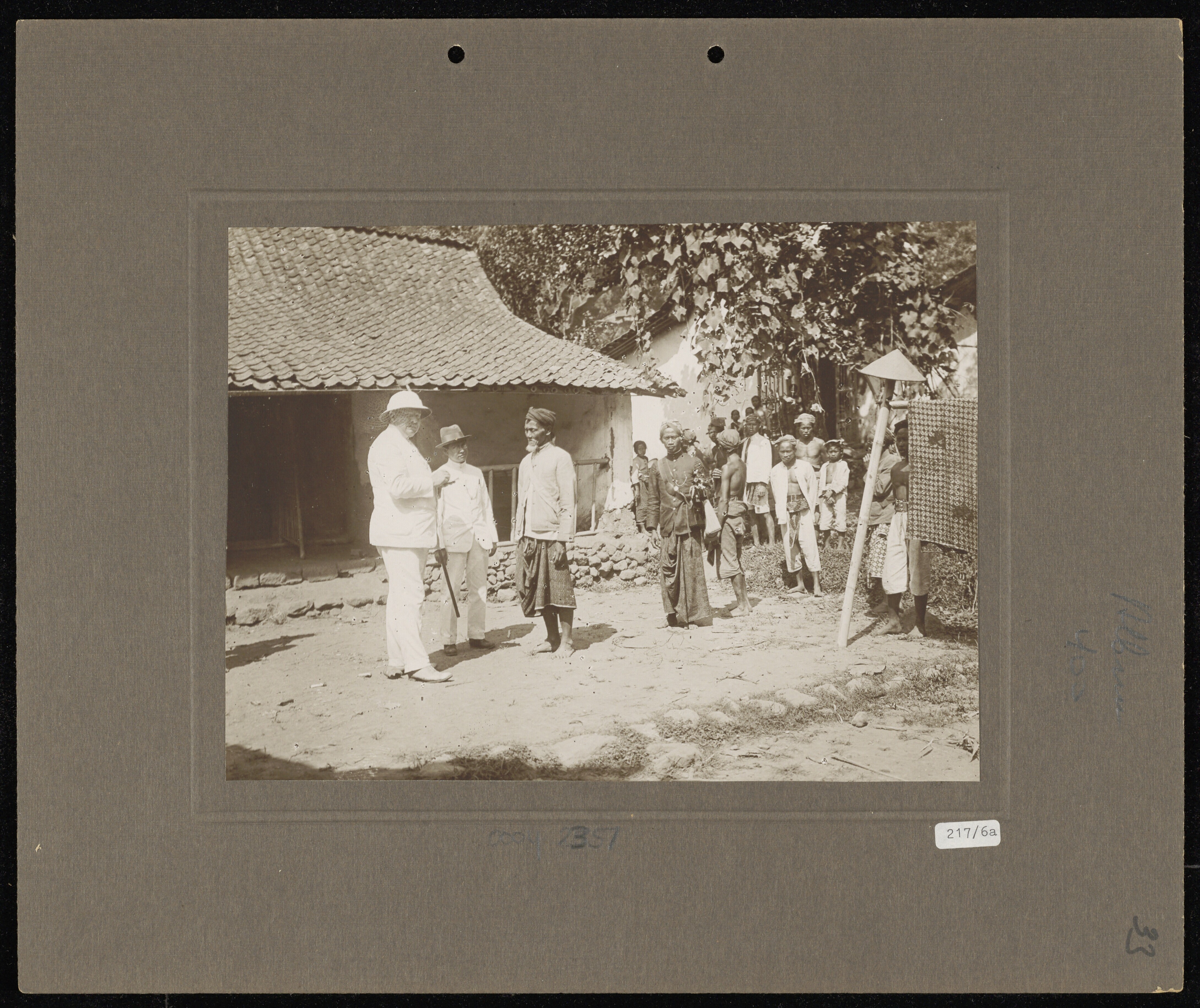 Ingang van een dessa met Javaanse (?) mannen en bote...