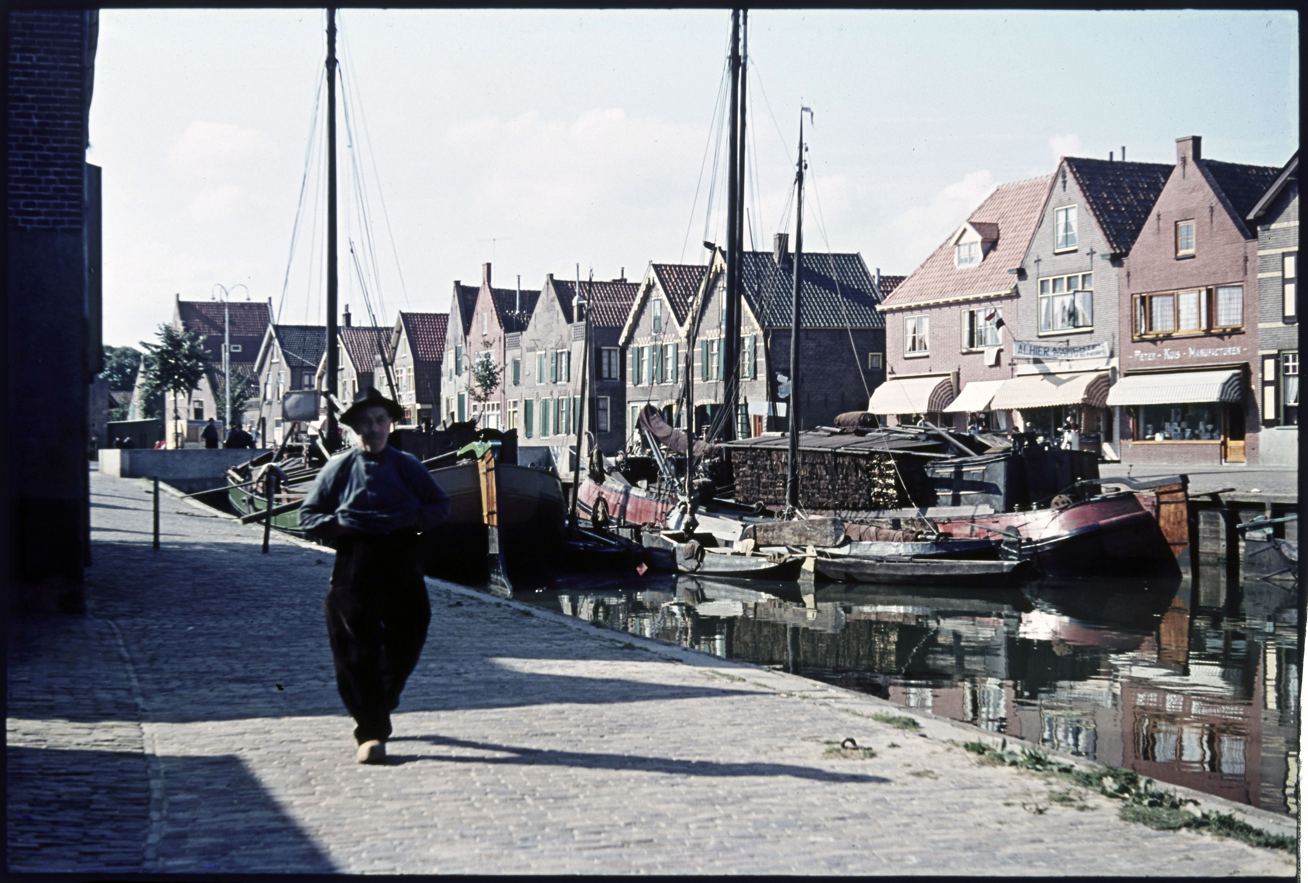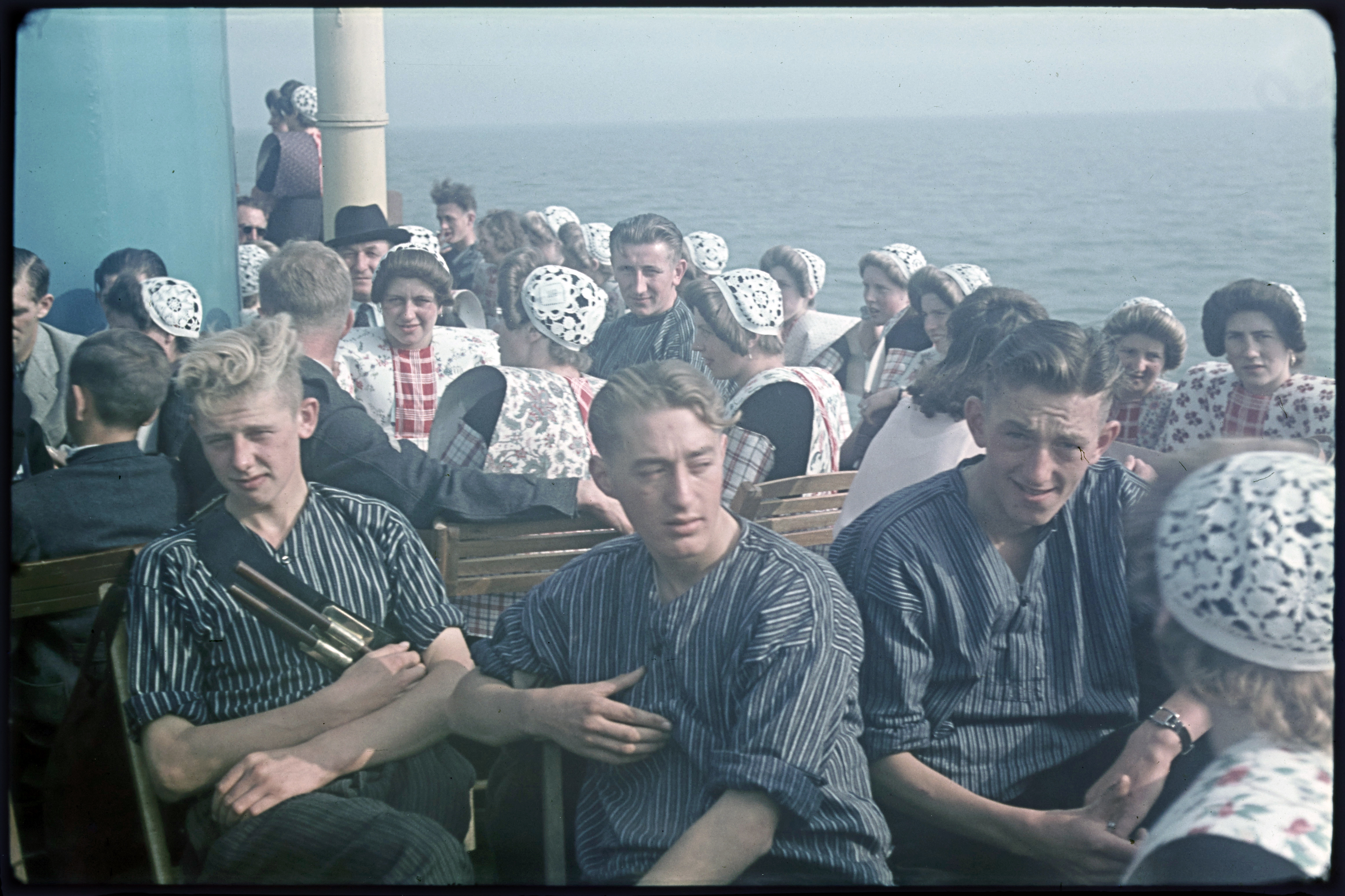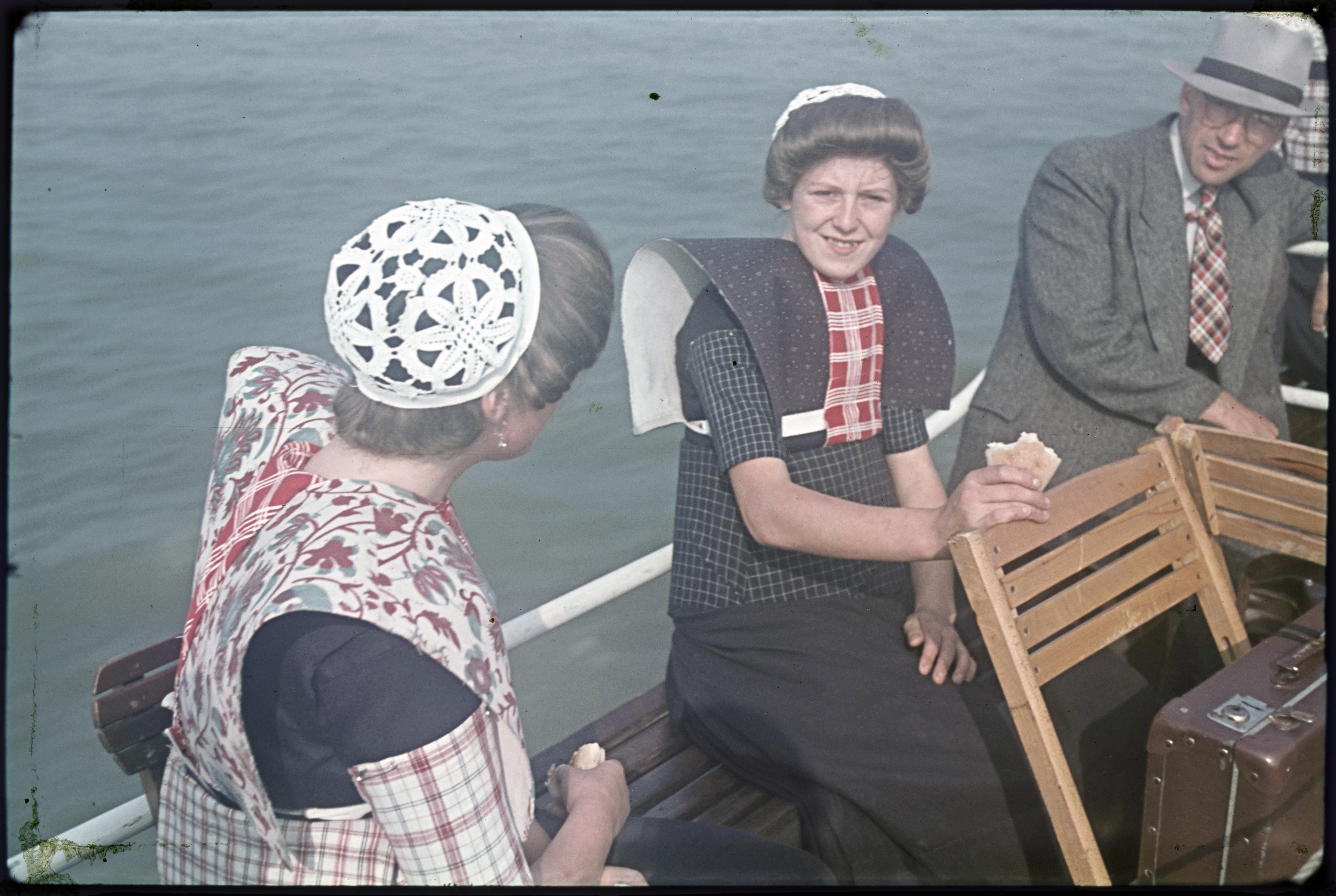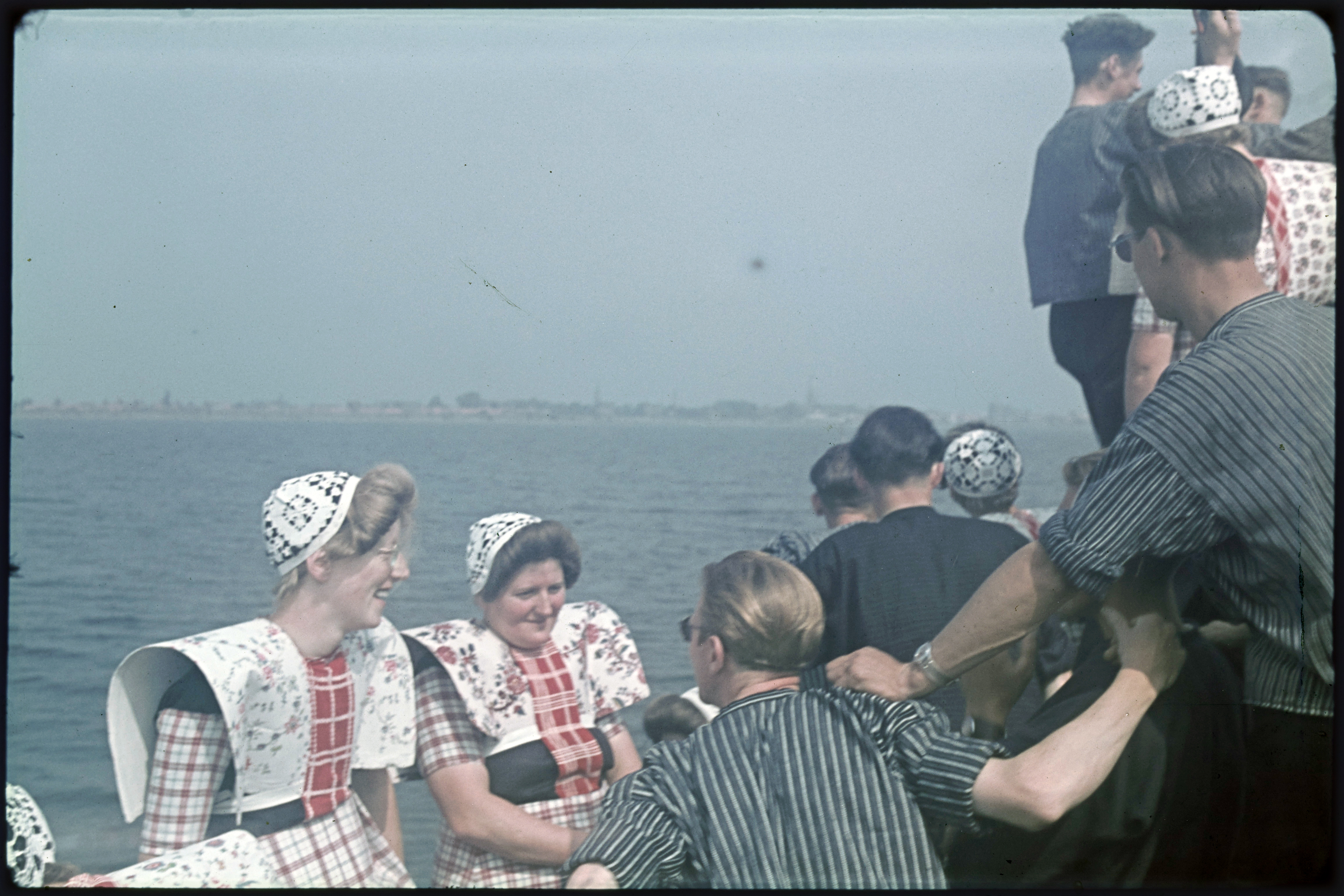 Man en vrouw in klederdracht bij de bootleuning tijd...