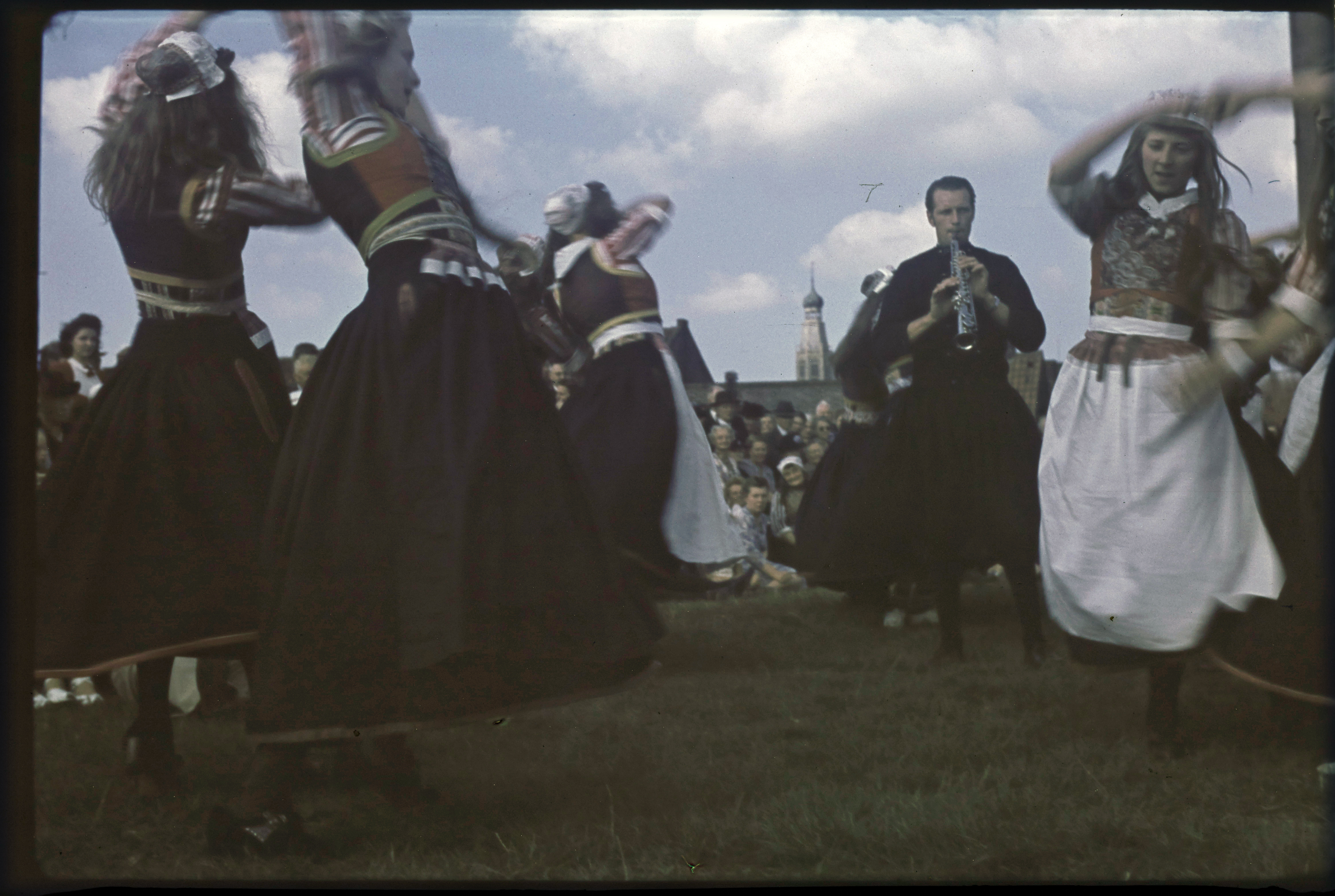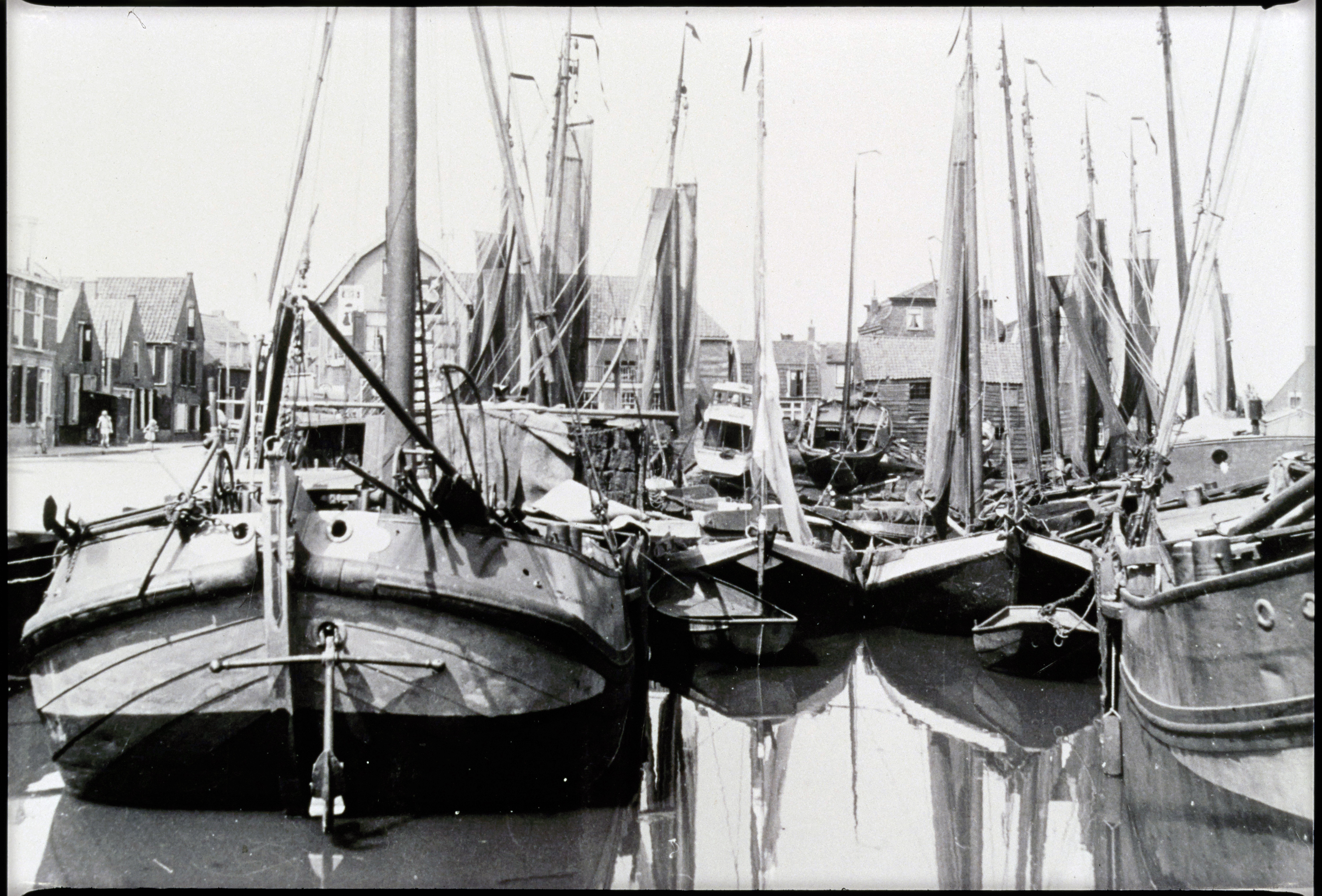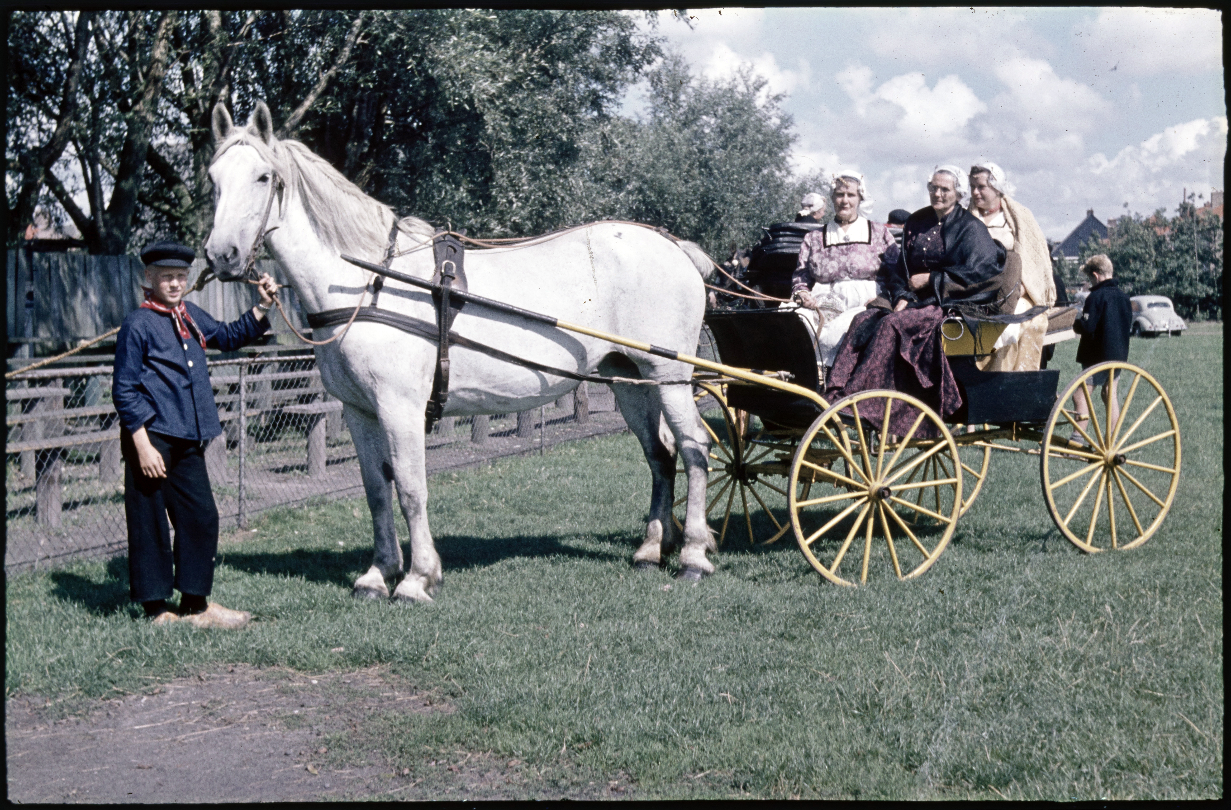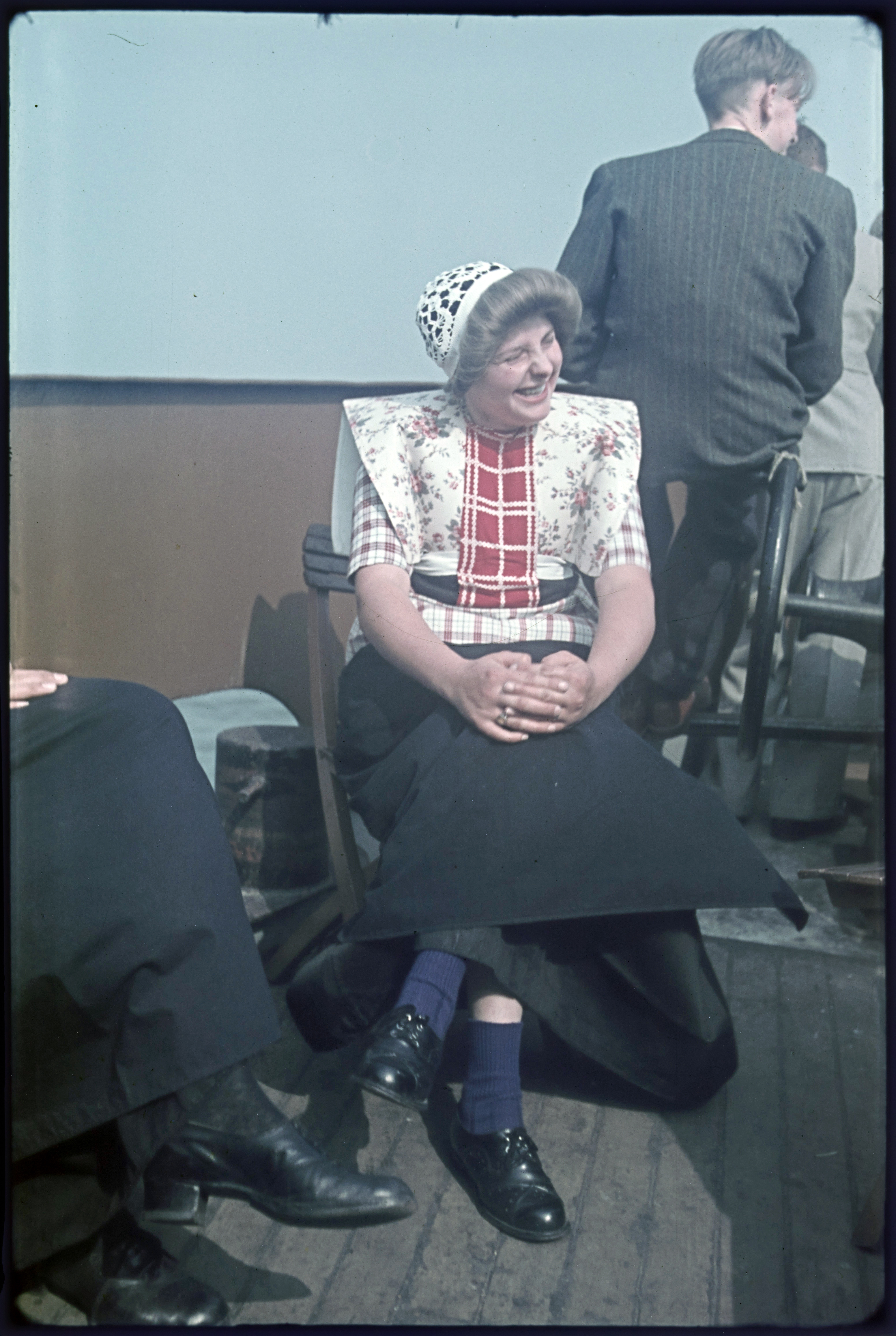 Man en vrouw in klederdracht bij de bootleuning tijd...