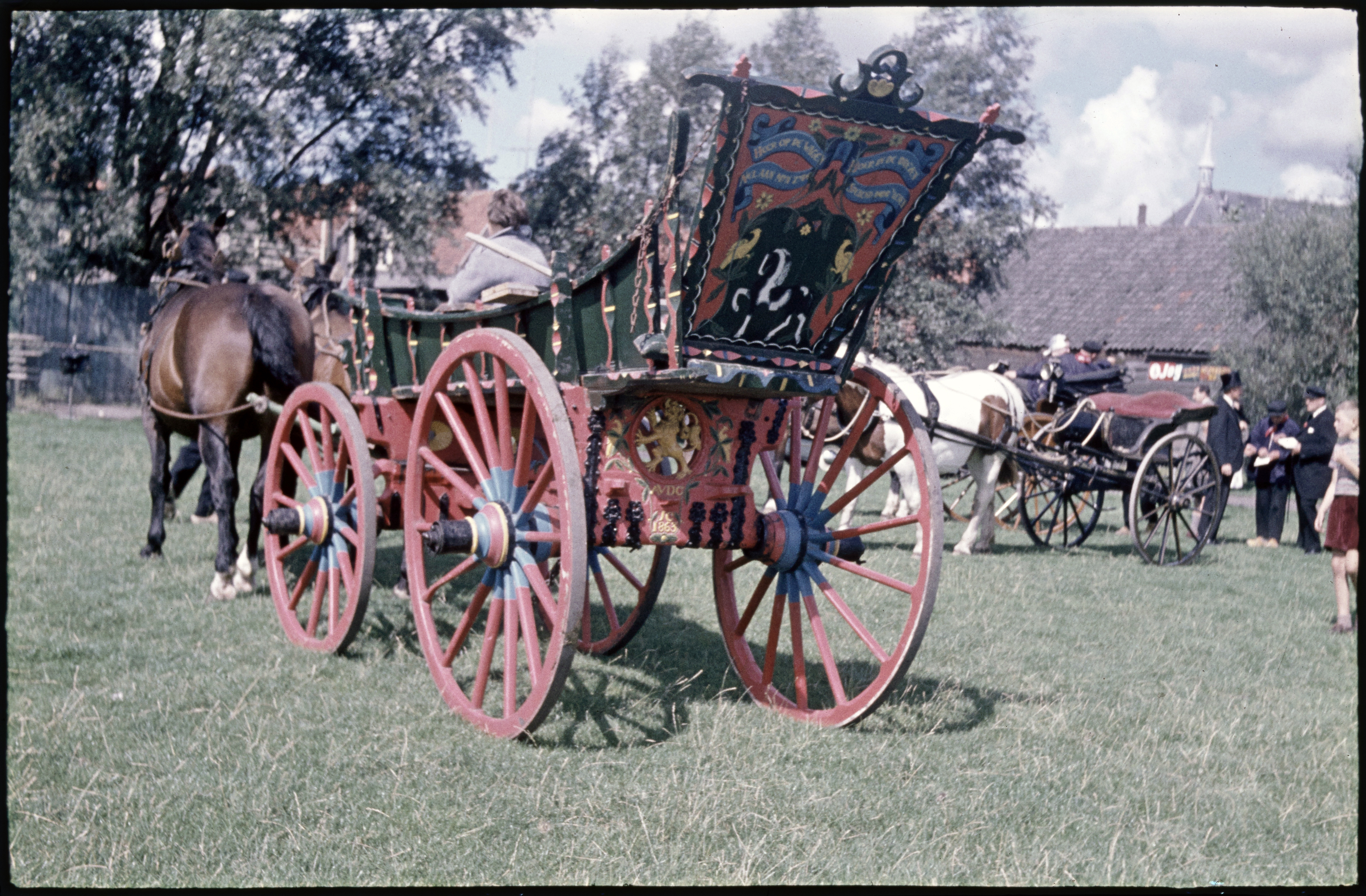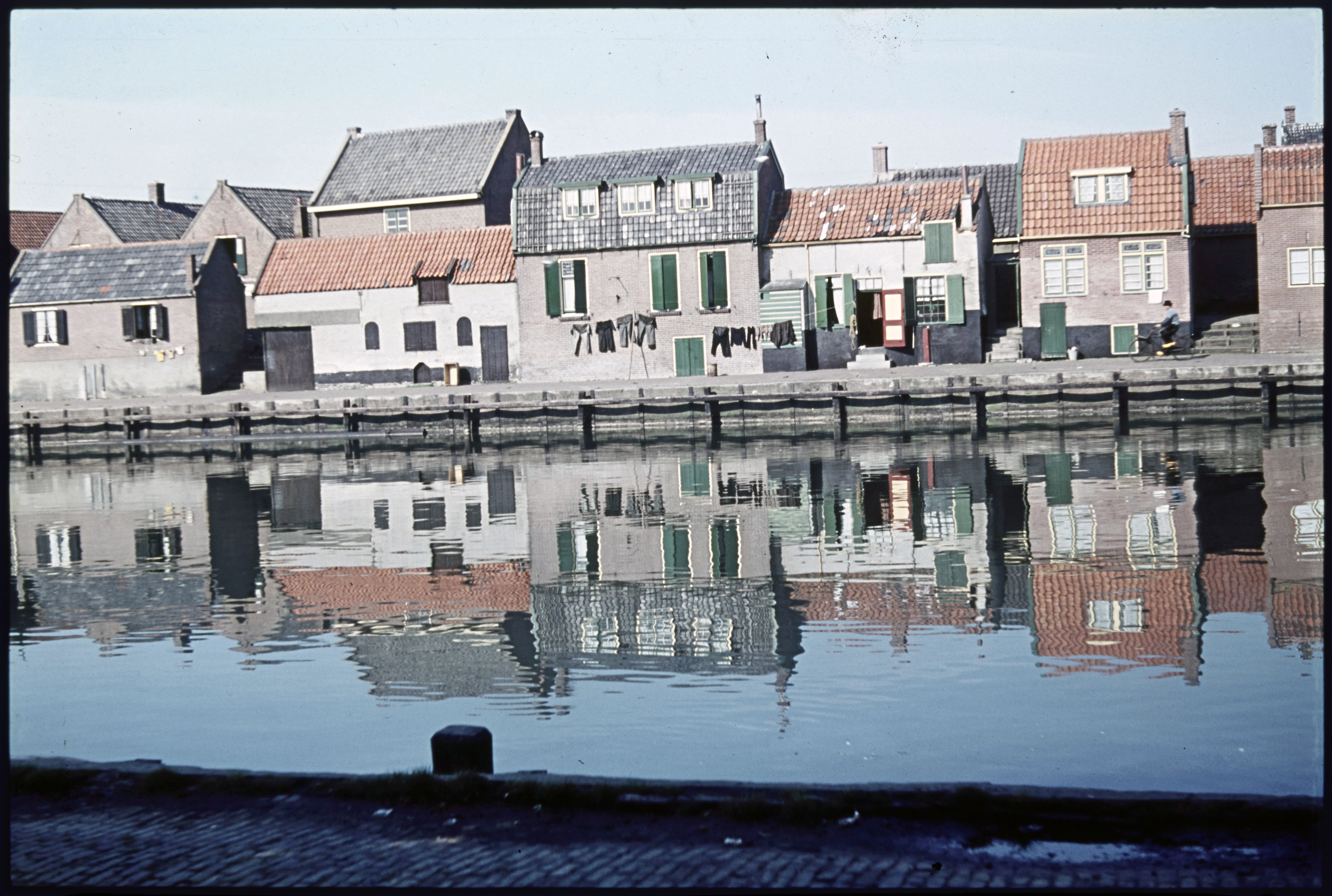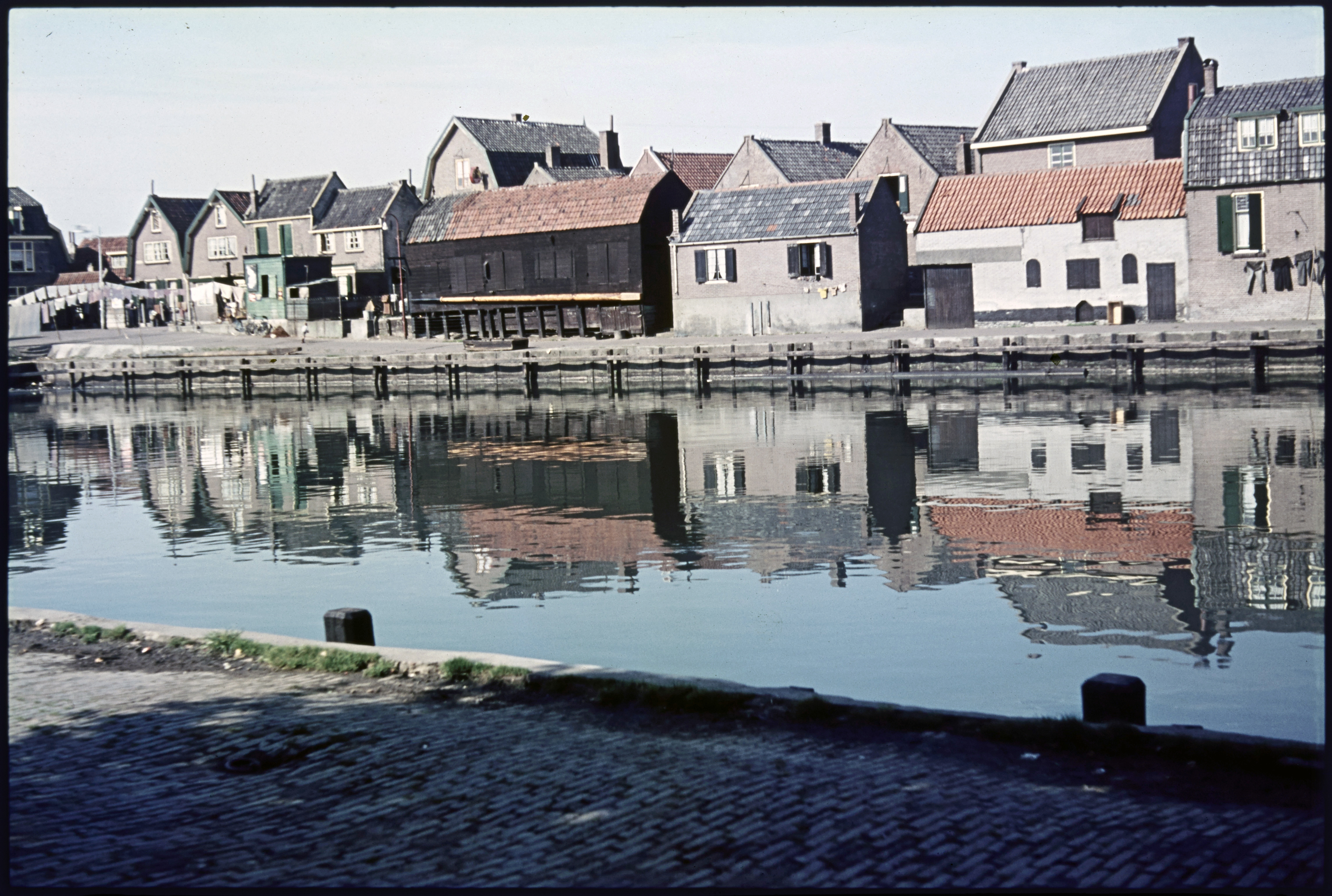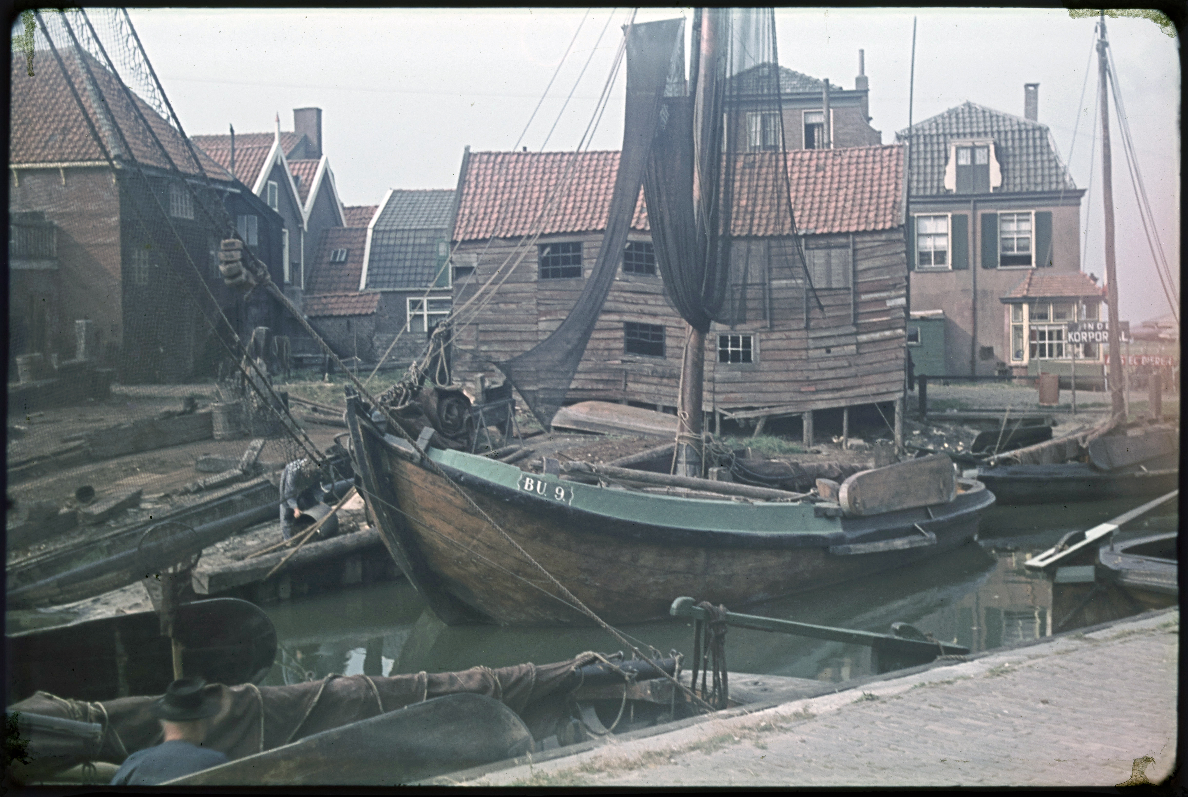 Man en vrouw in klederdracht bij de bootleuning tijd...