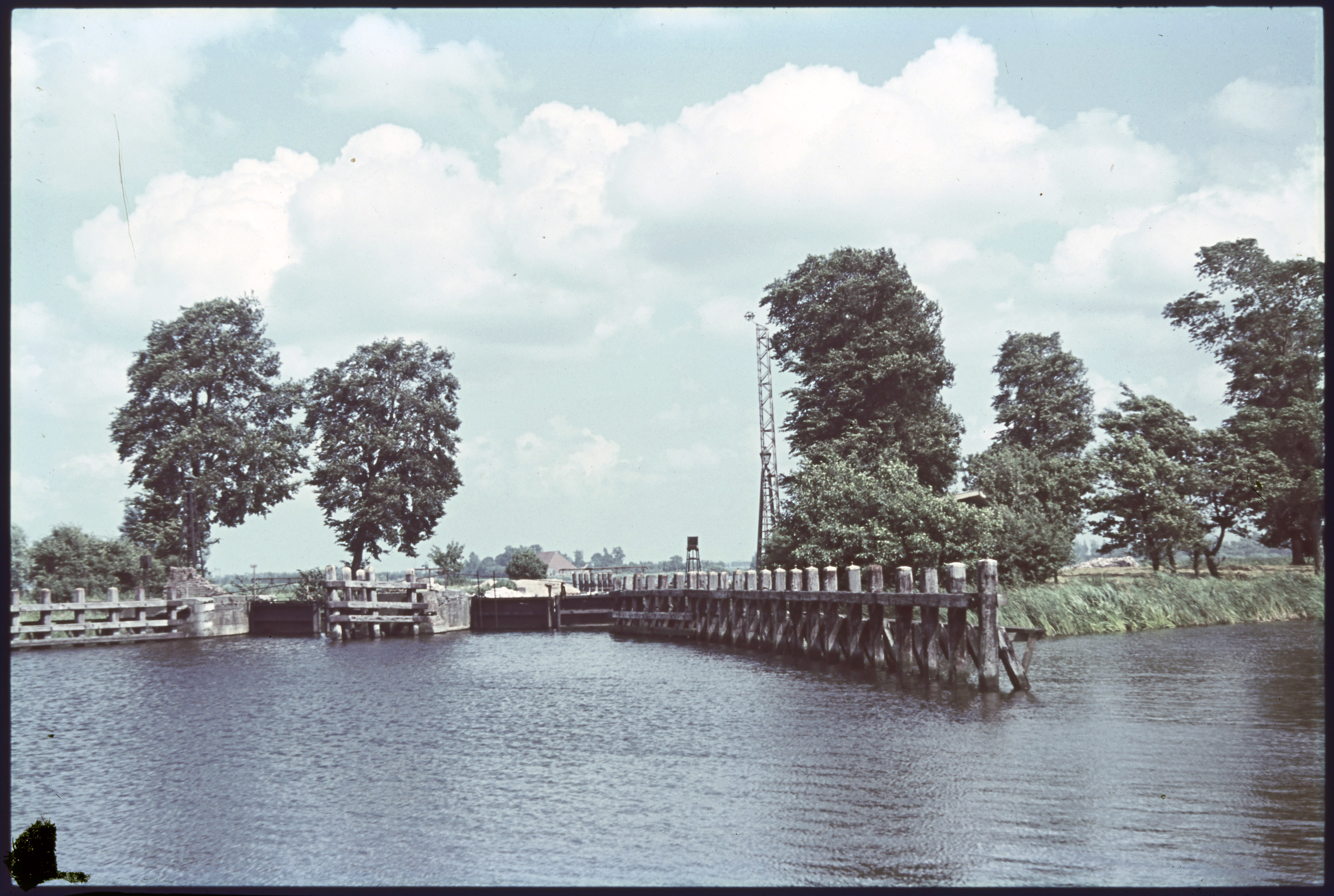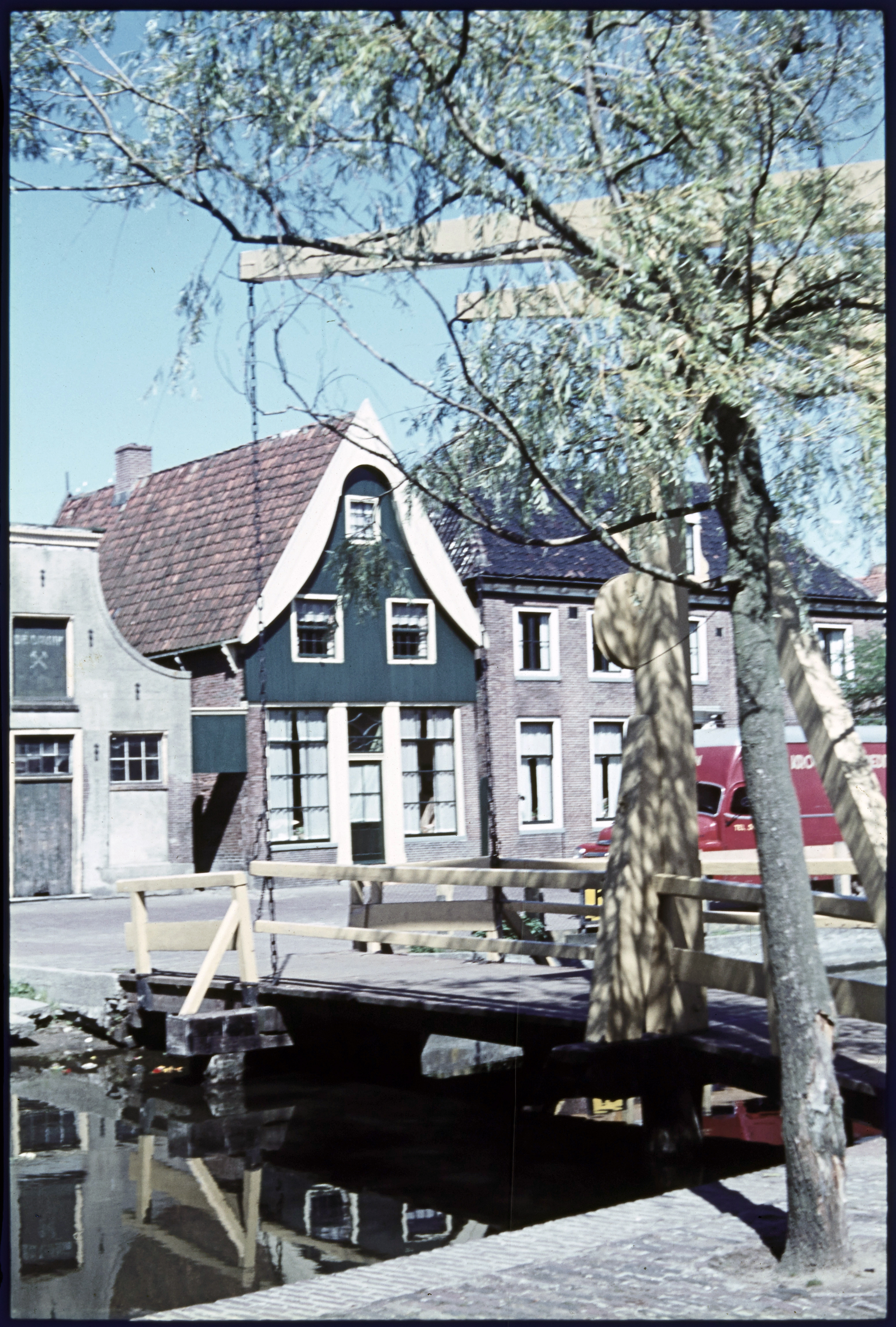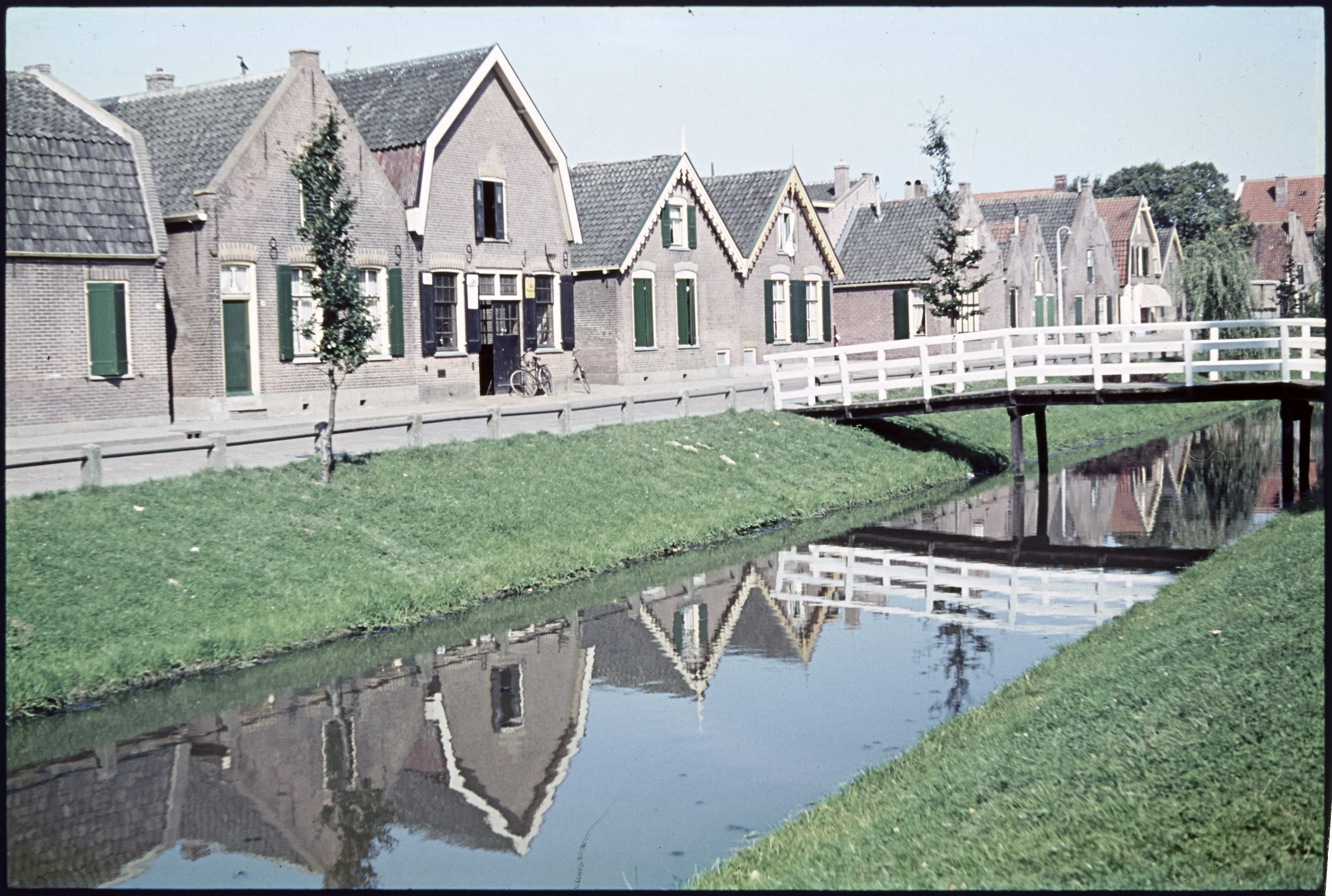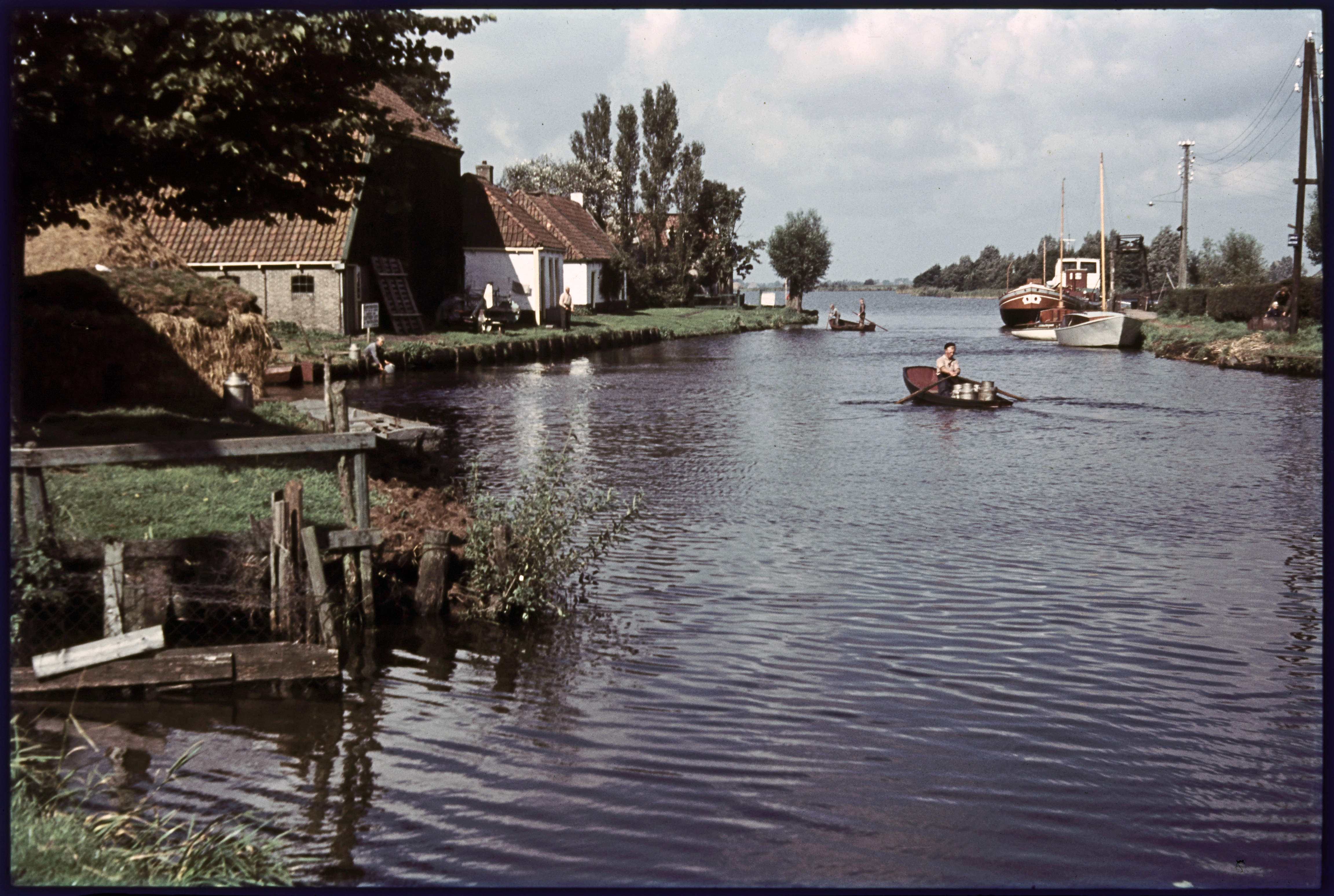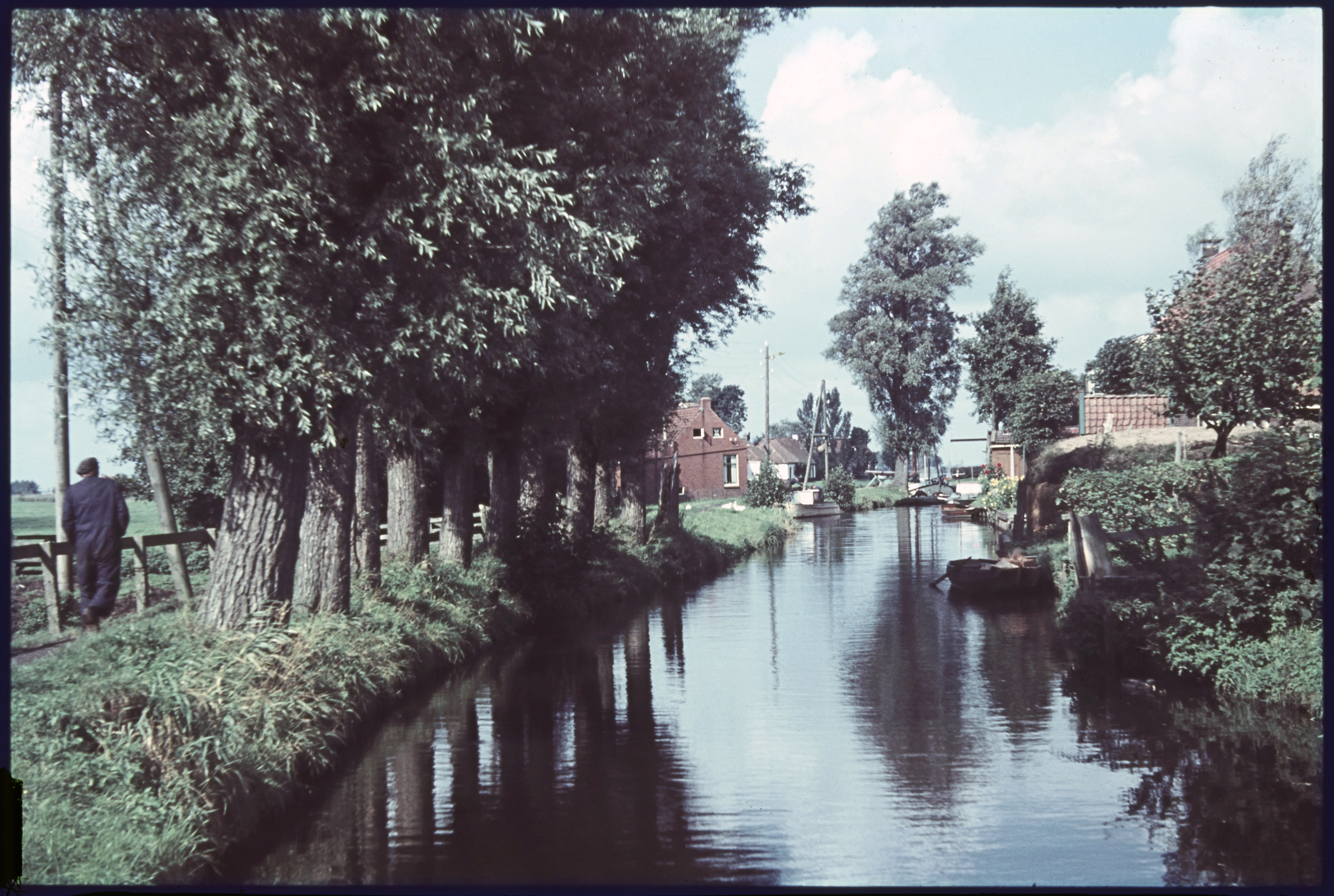 Lege vaart met huizen en boerderijen aan weerszijden...