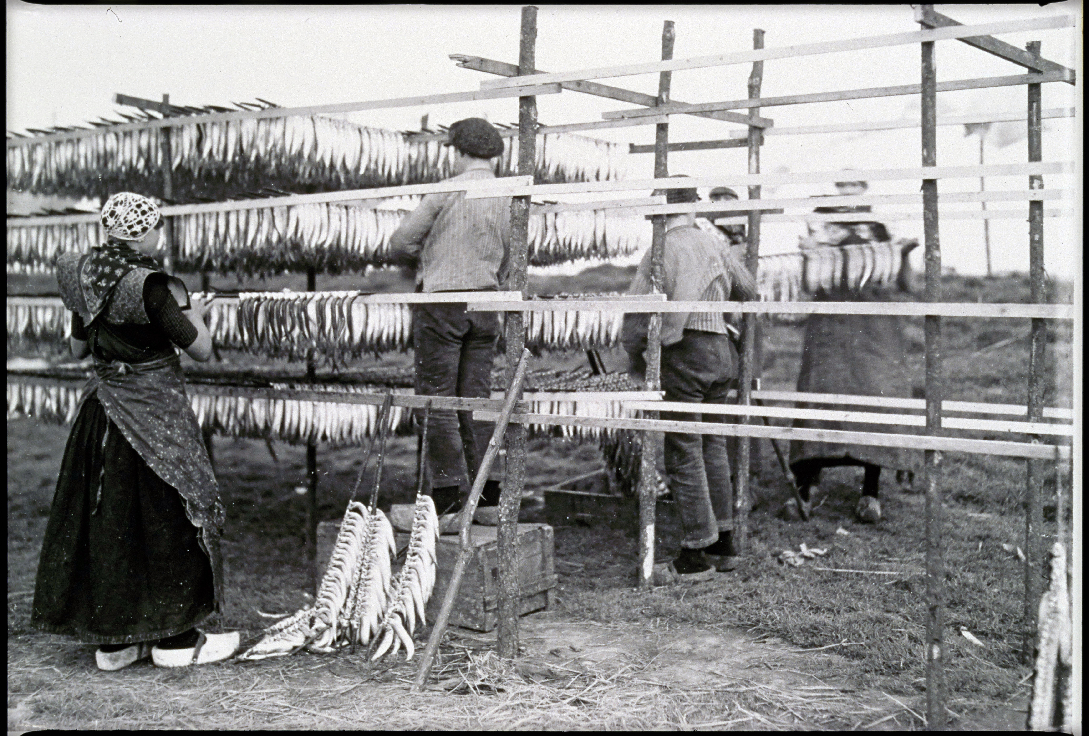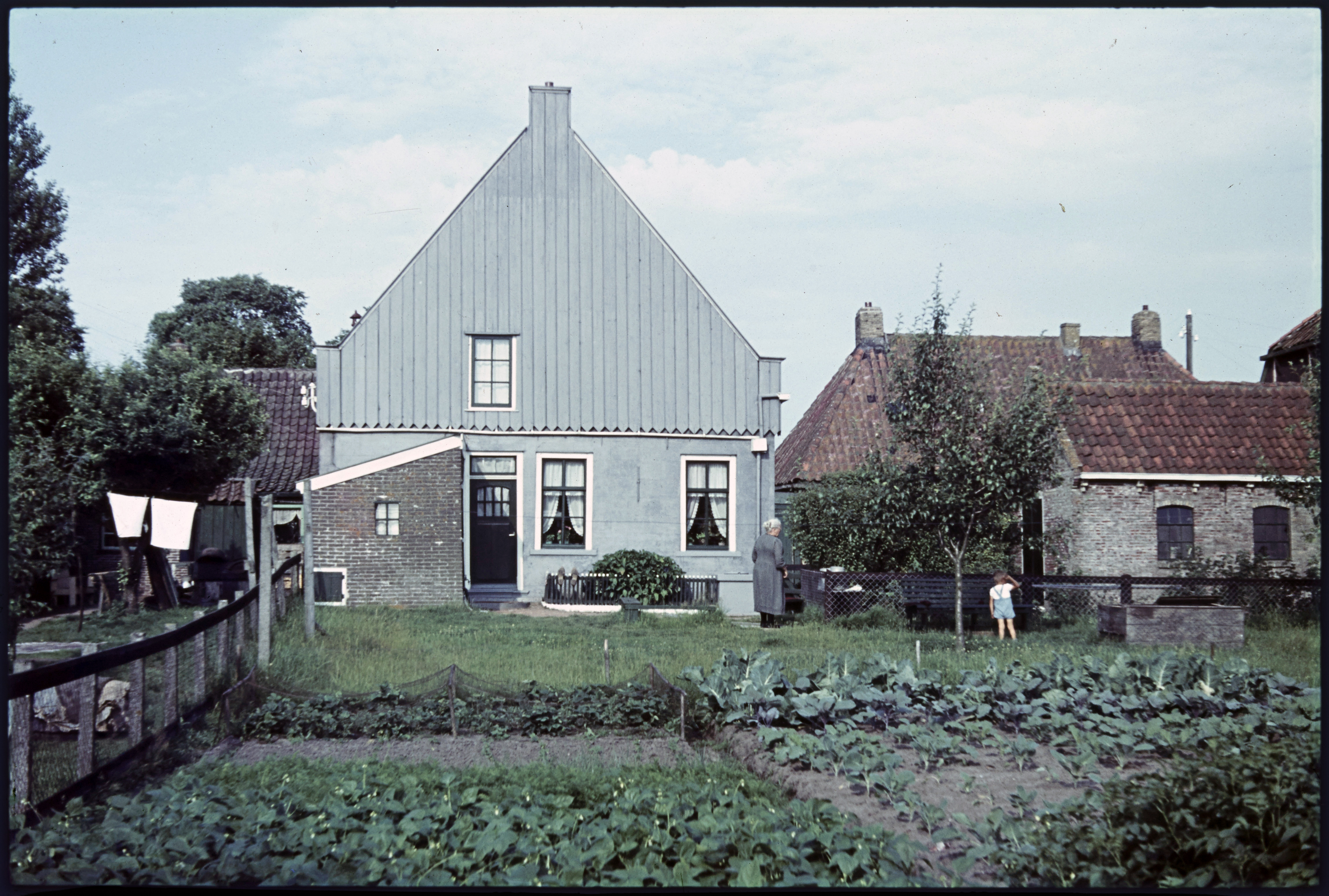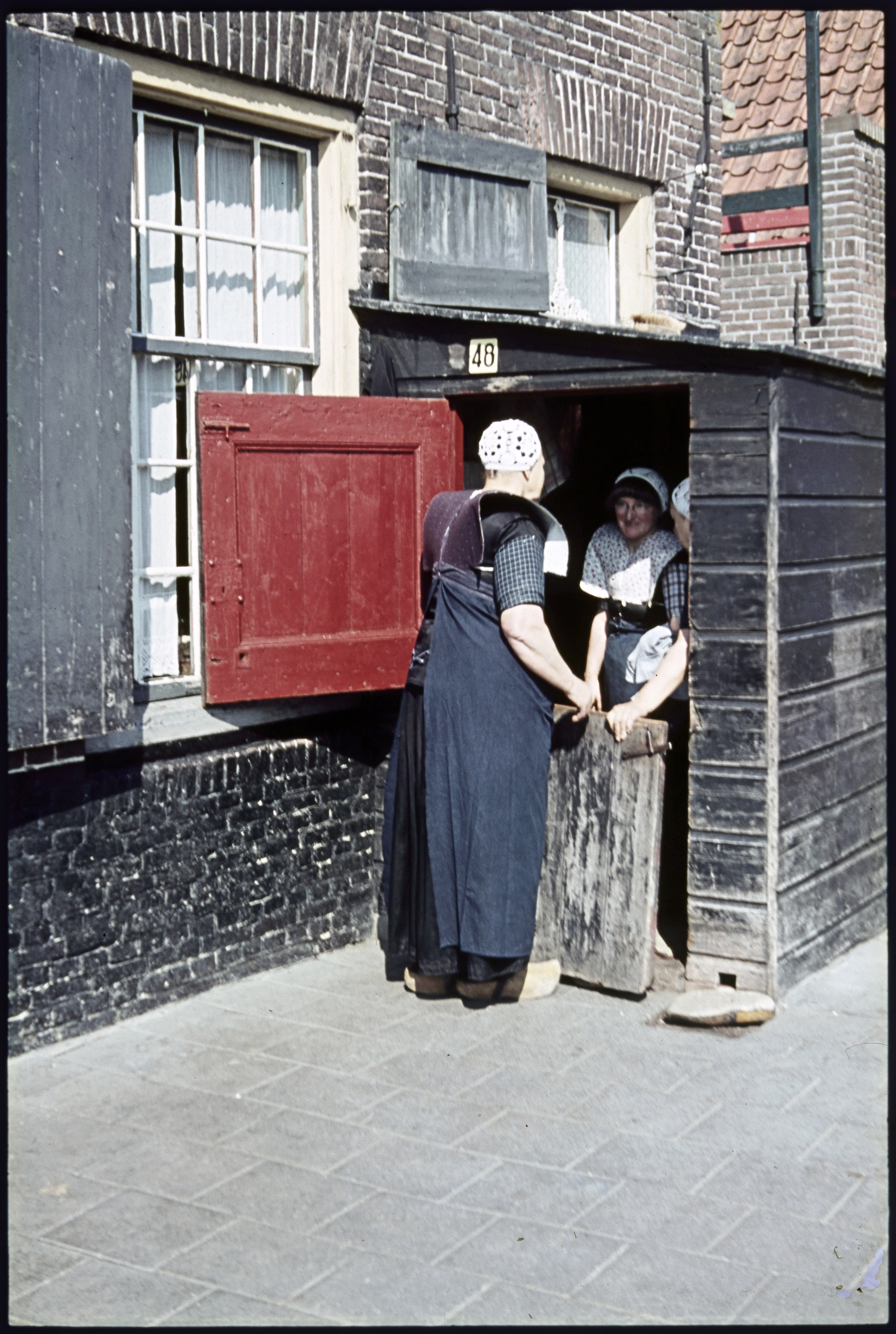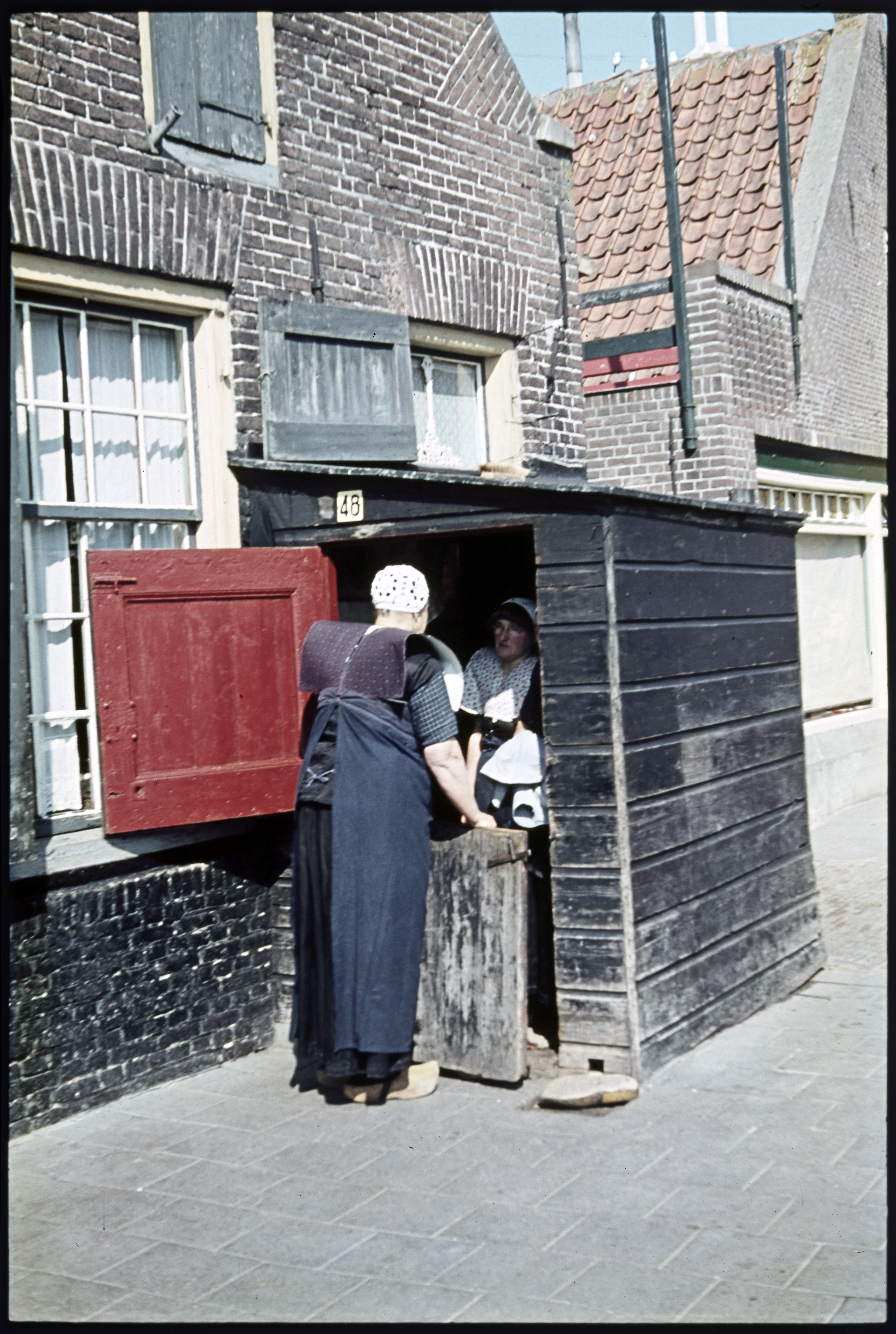 Vrouwen in klederdracht bij schuurtje met geopende h...