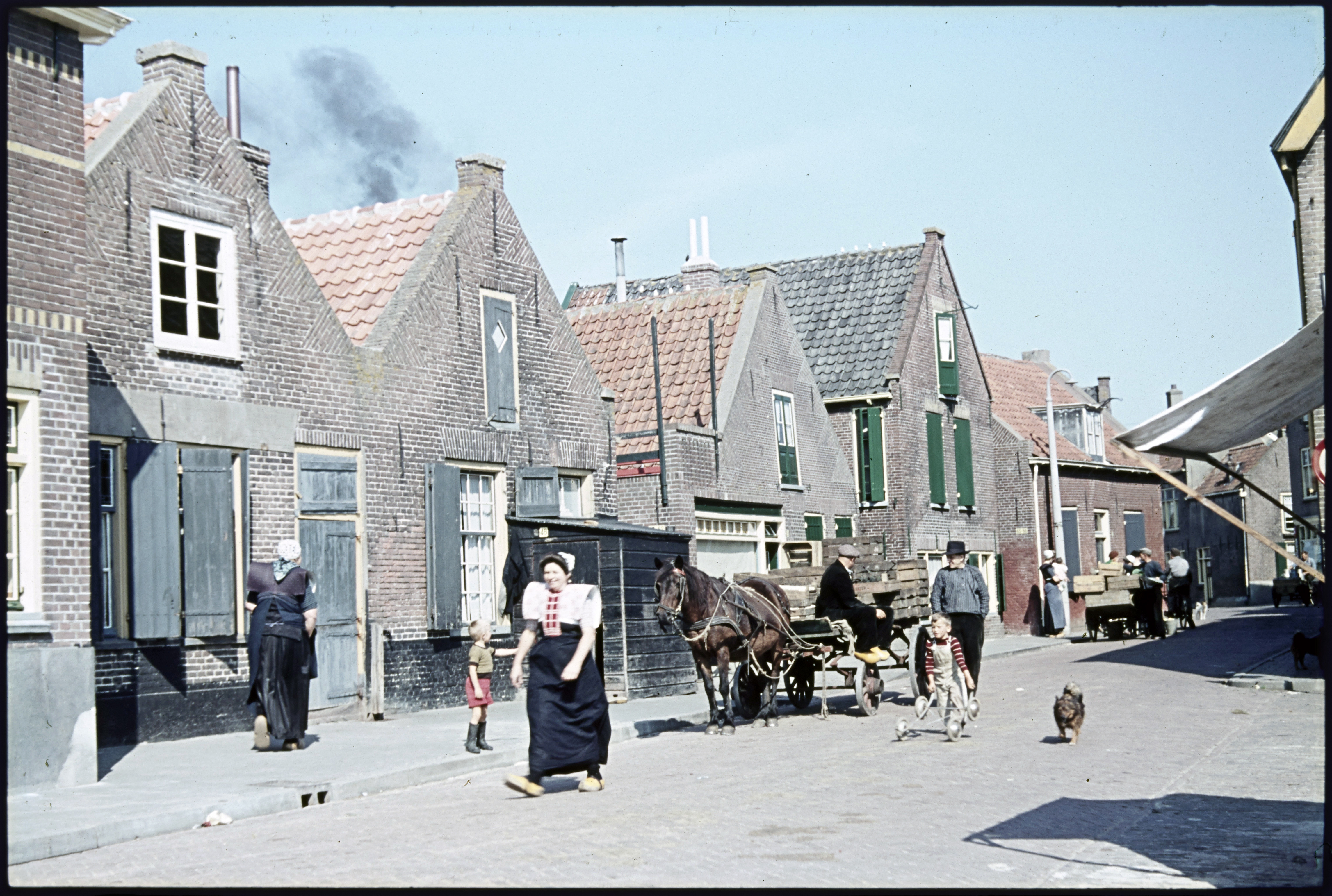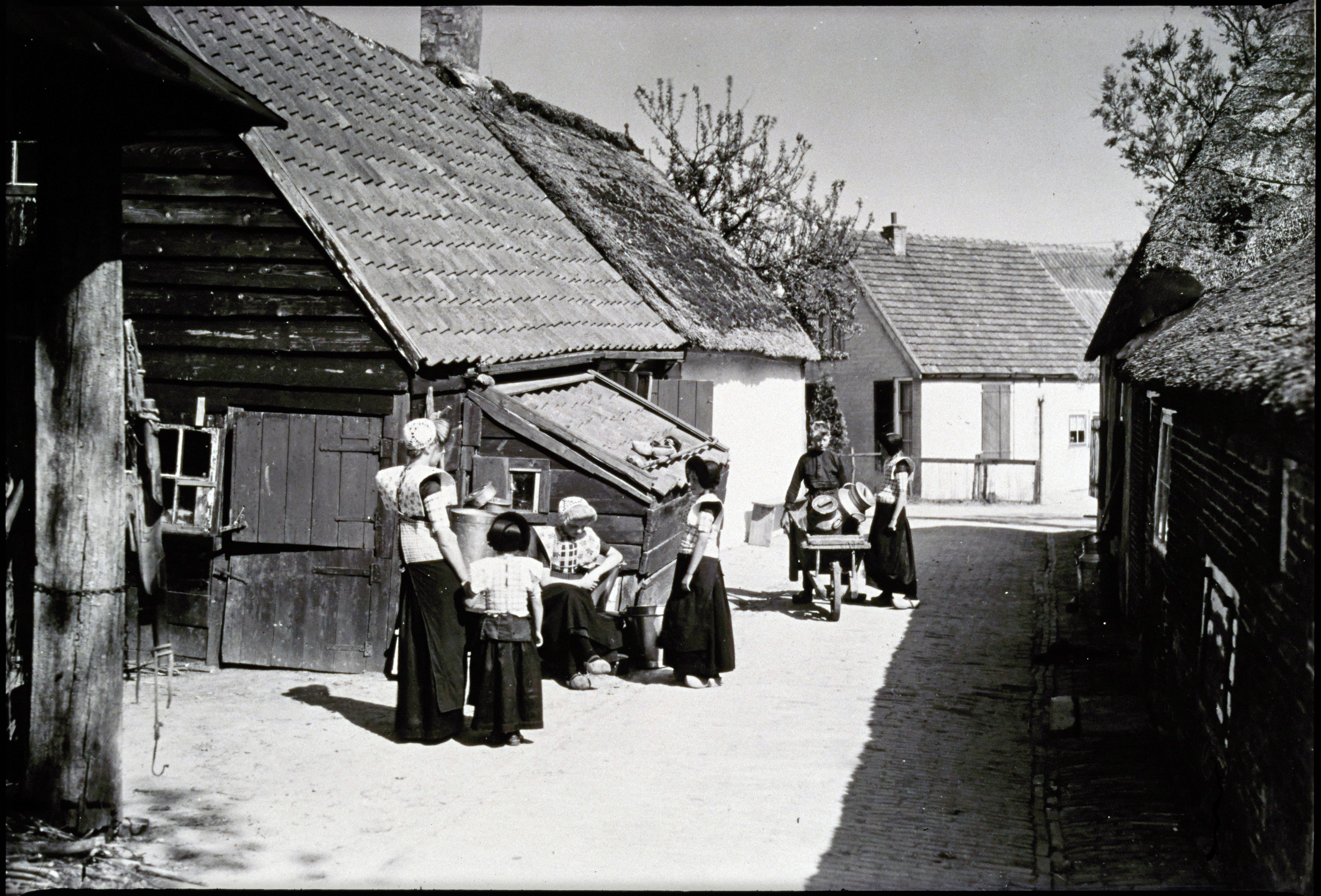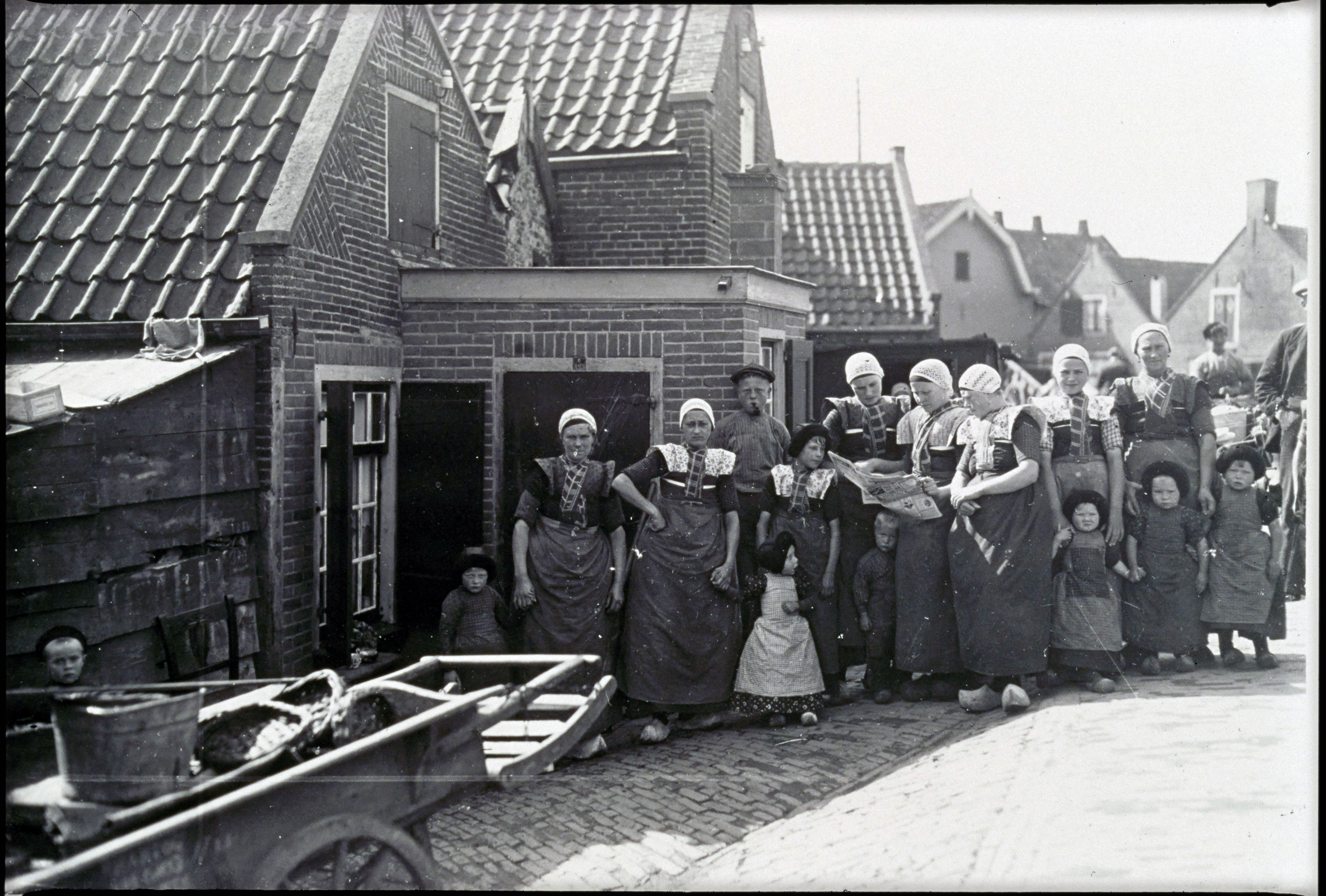 Straatbeeld met een groep vrouwen in klederdracht en...