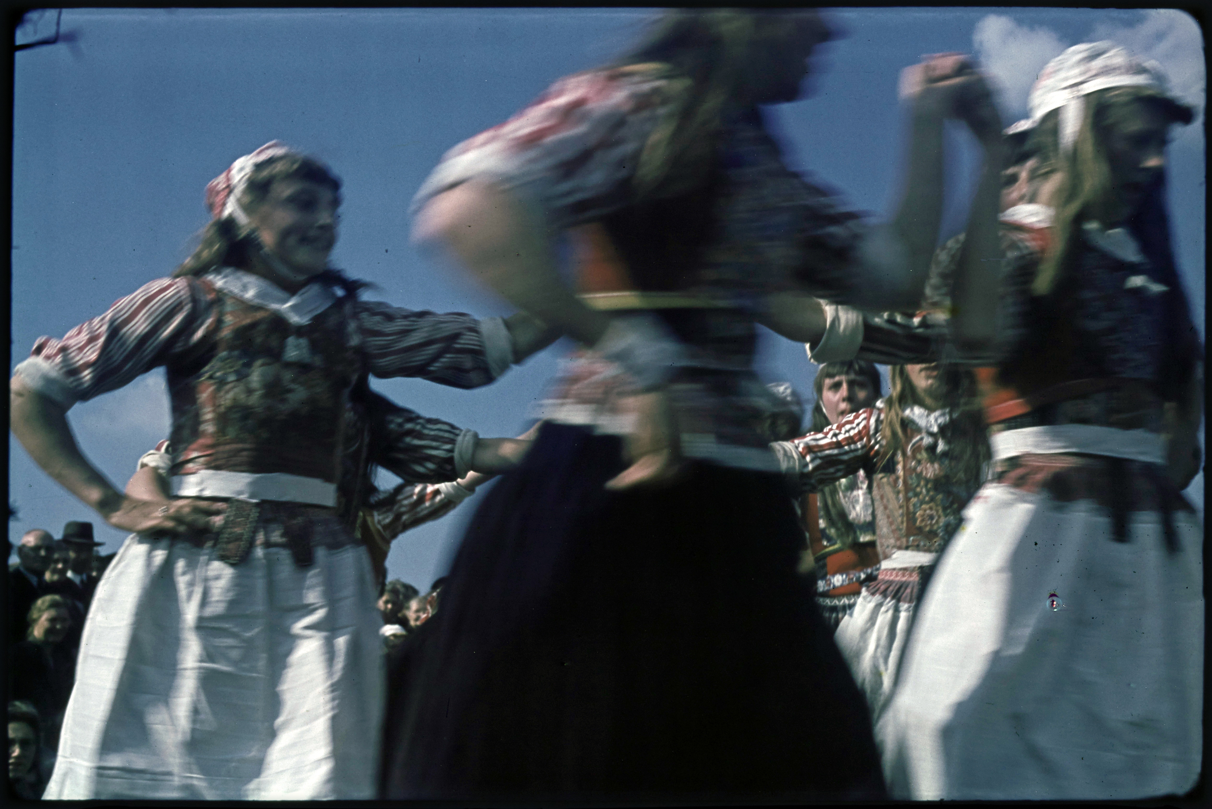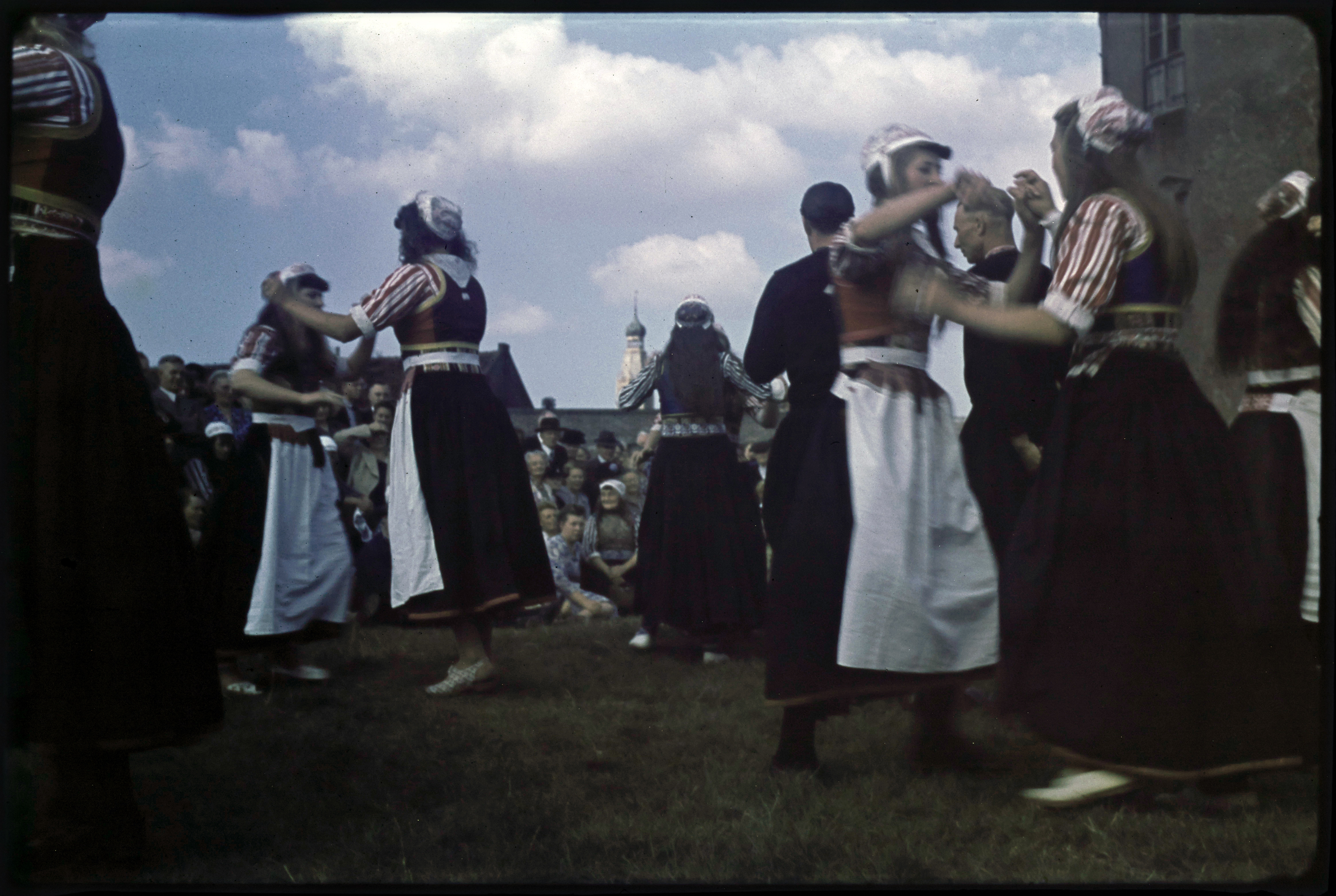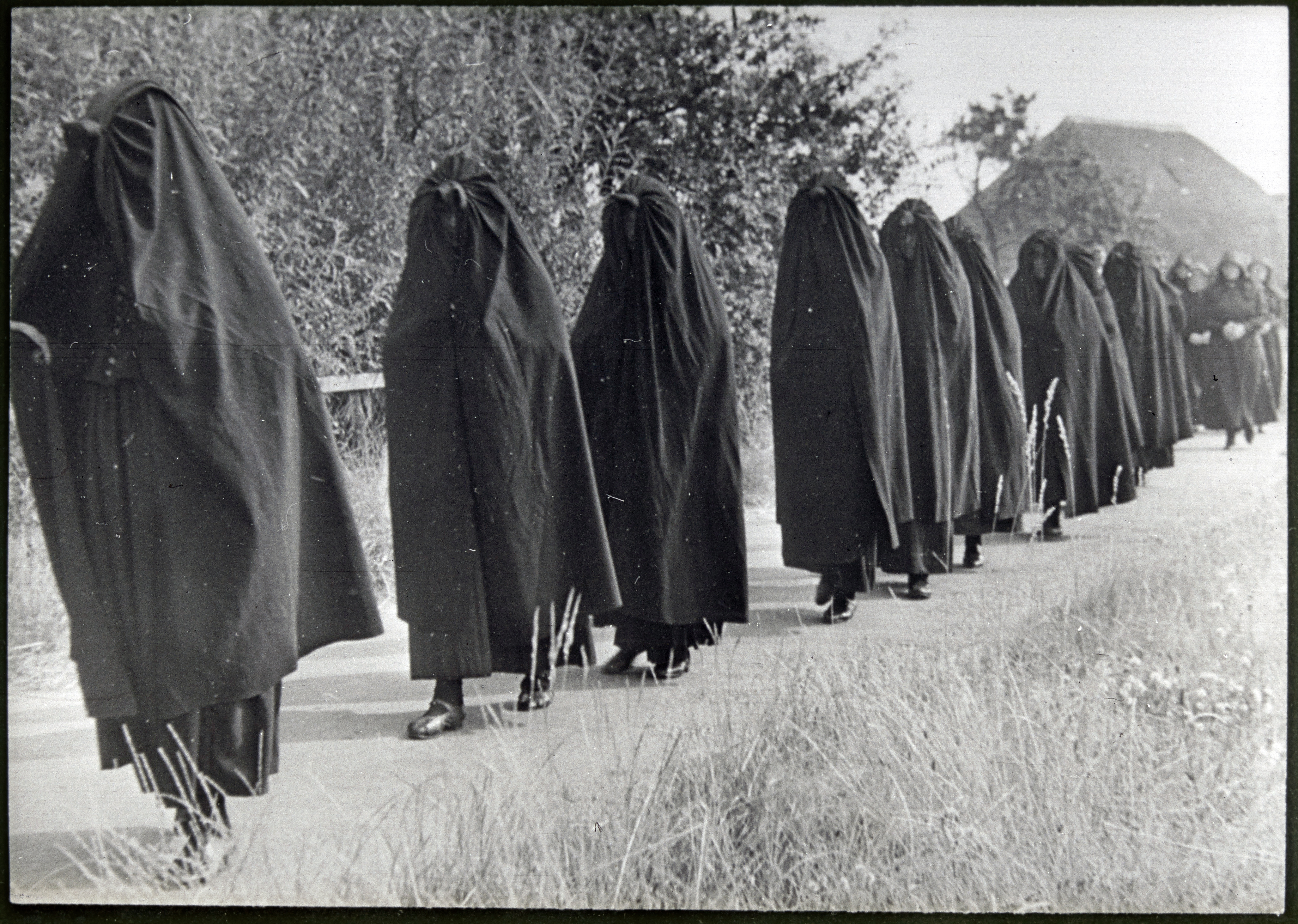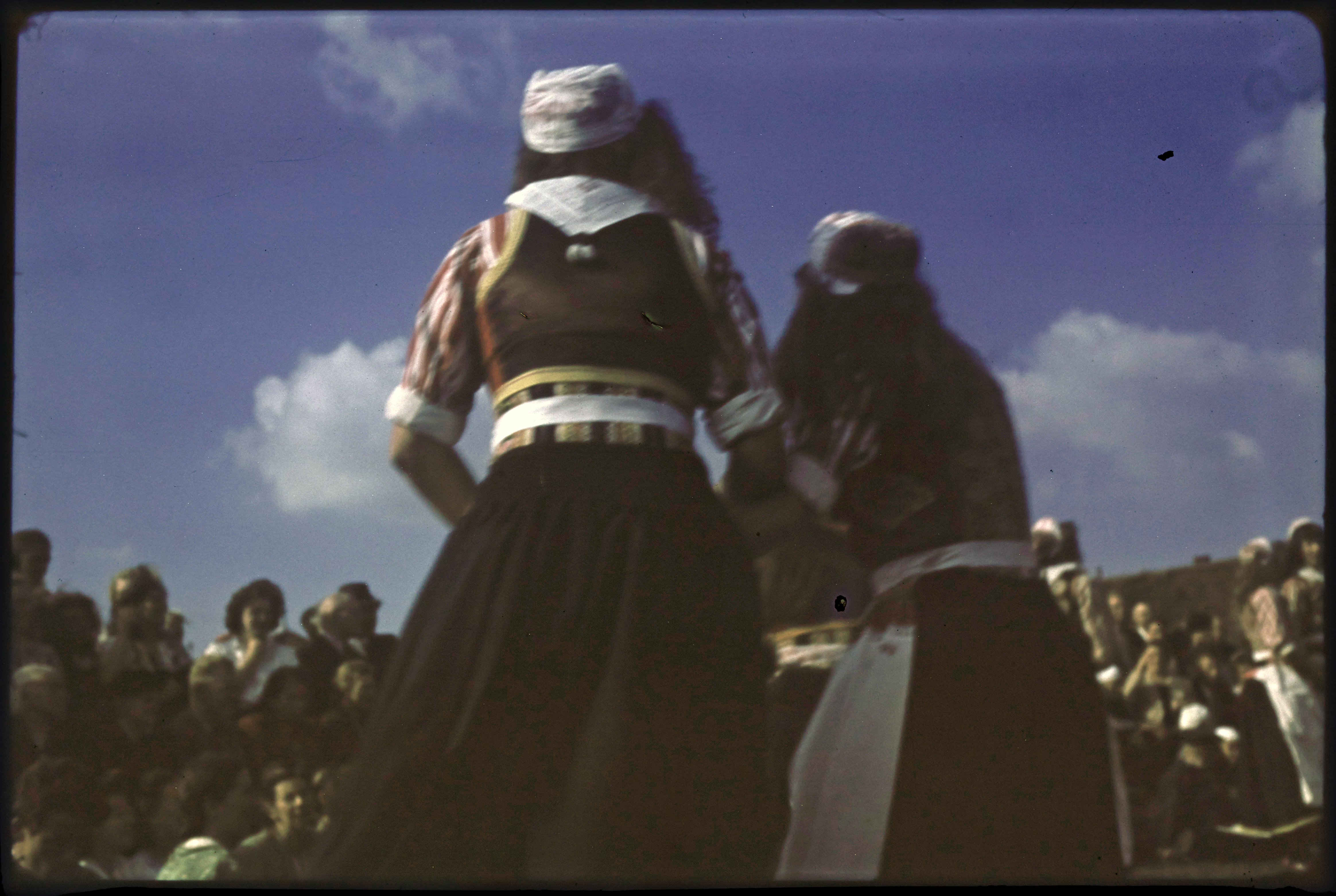 Straatbeeld met een groep vrouwen in klederdracht en...