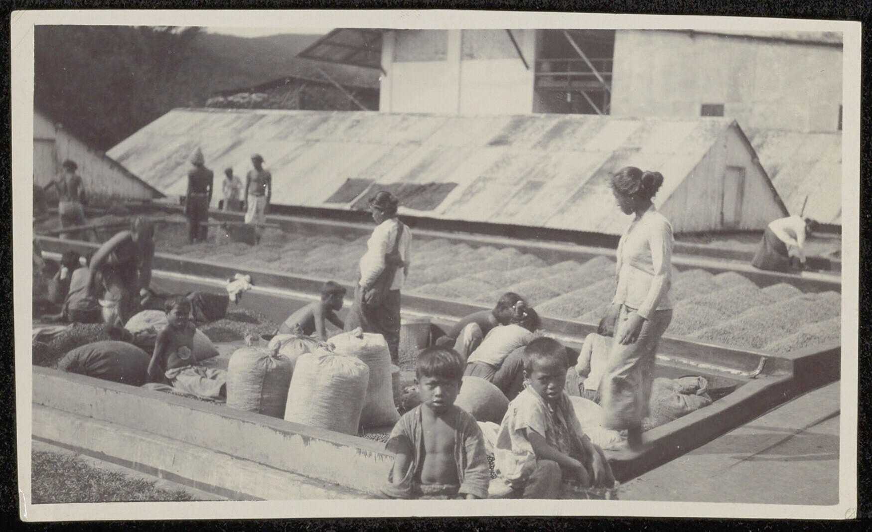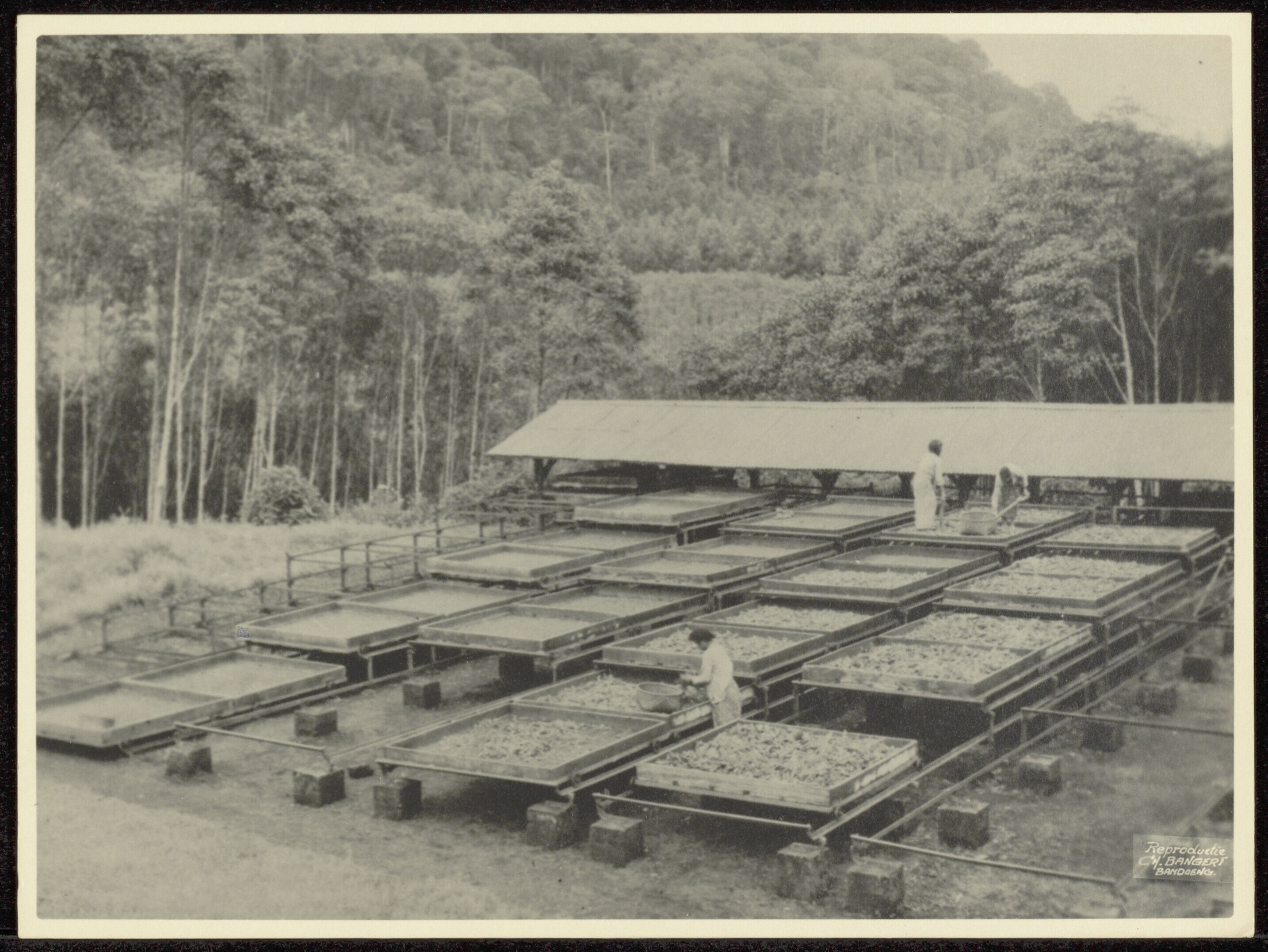 Het sorteren (?) van koffiebonen in een droogbak op ...