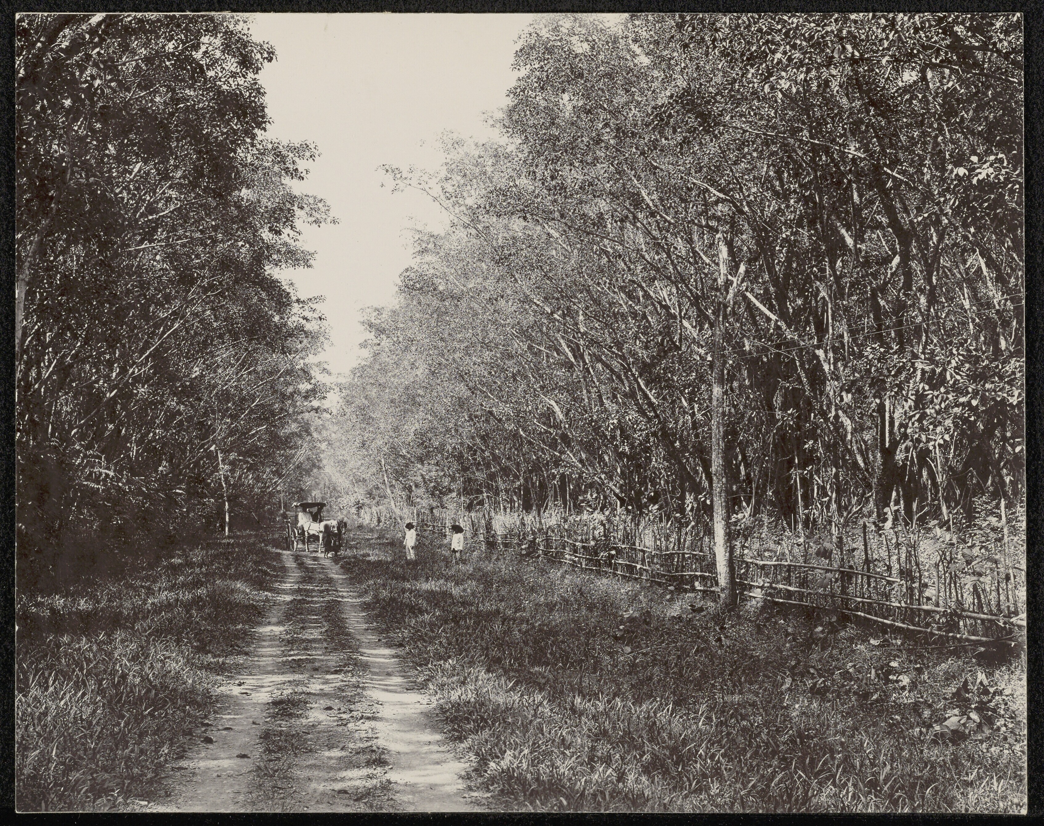 Een rijtuig op een weg omgeven door de rubberbomen v...