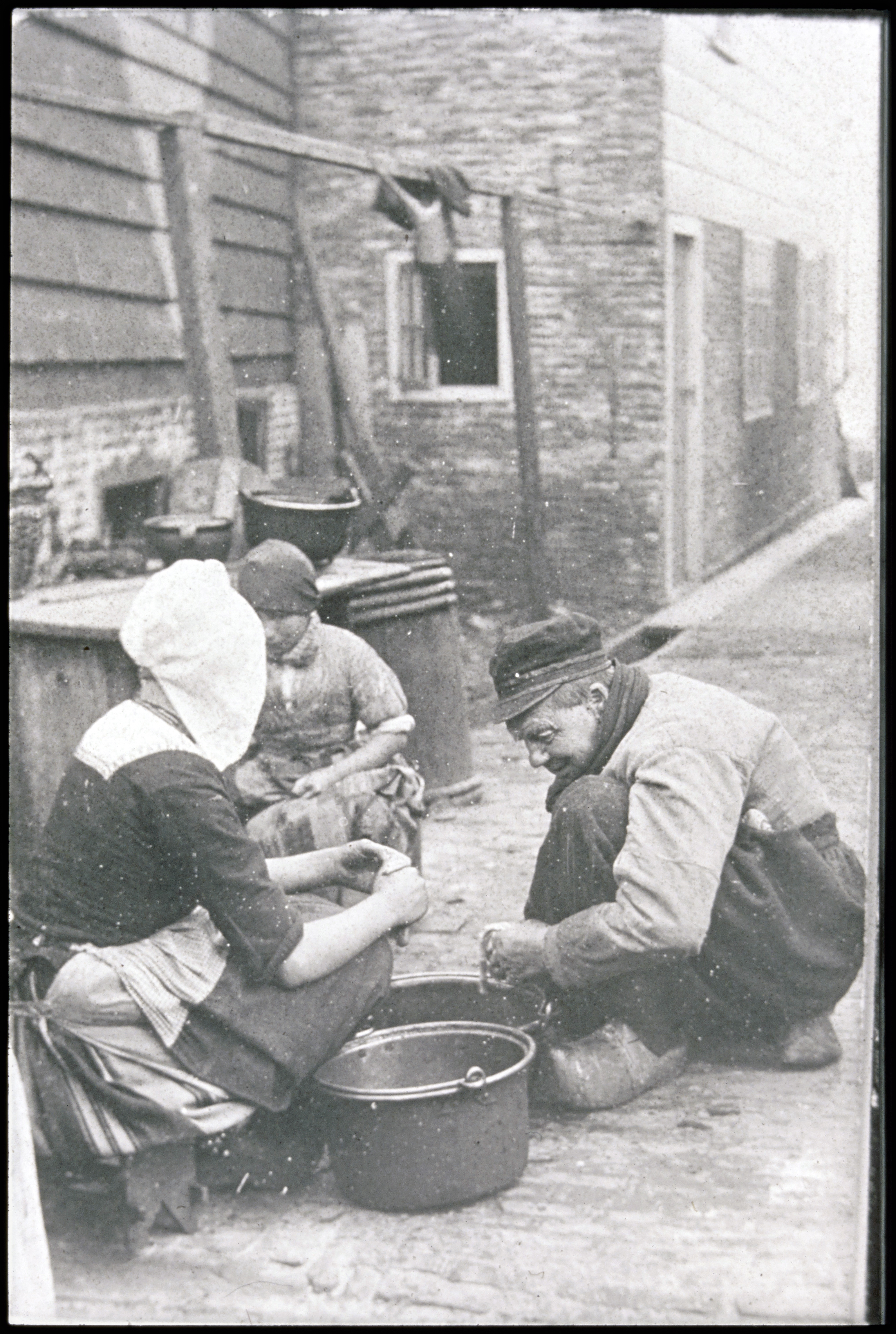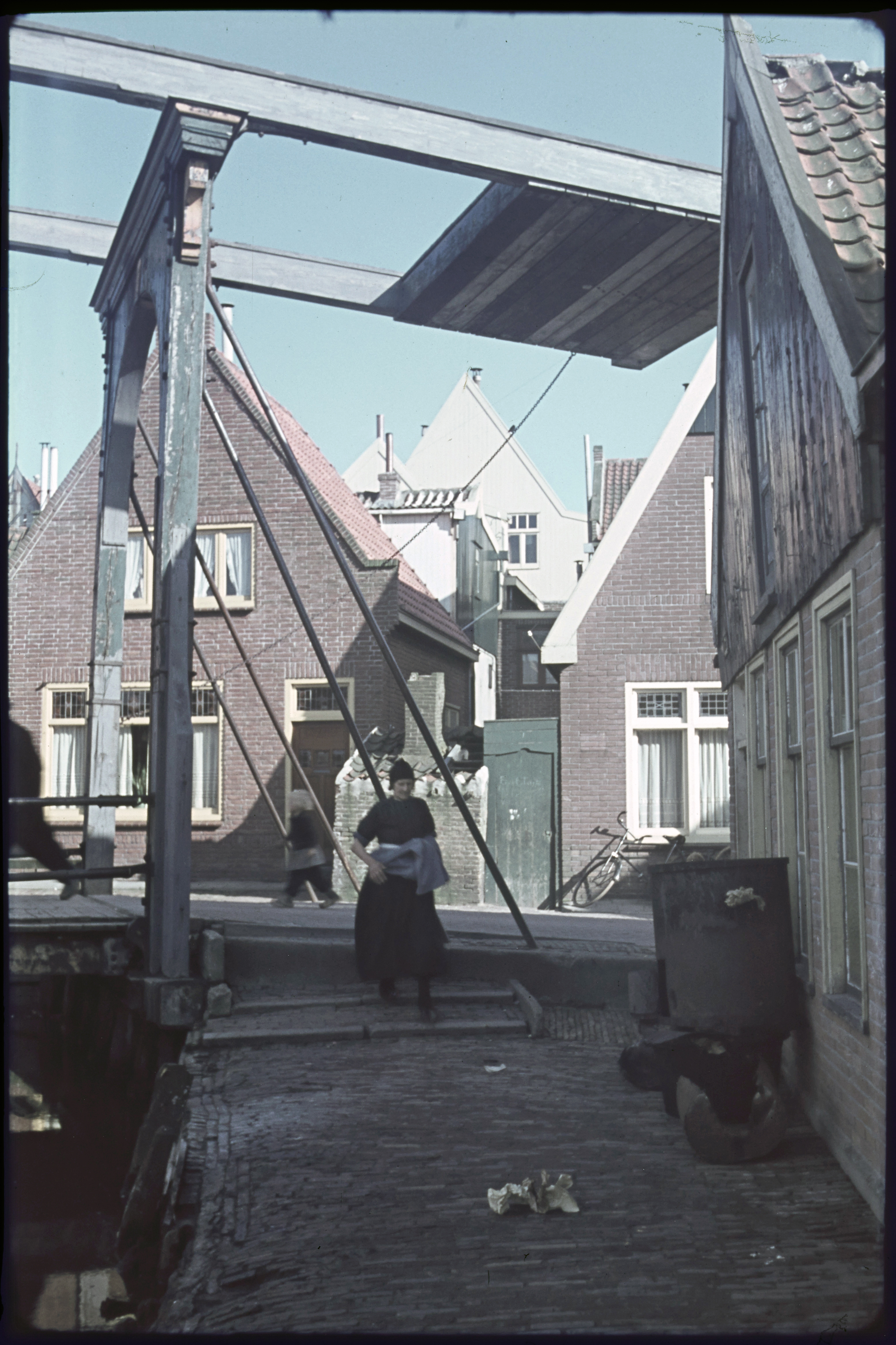 Straatbeeld met Volendammers en emmer in dracht