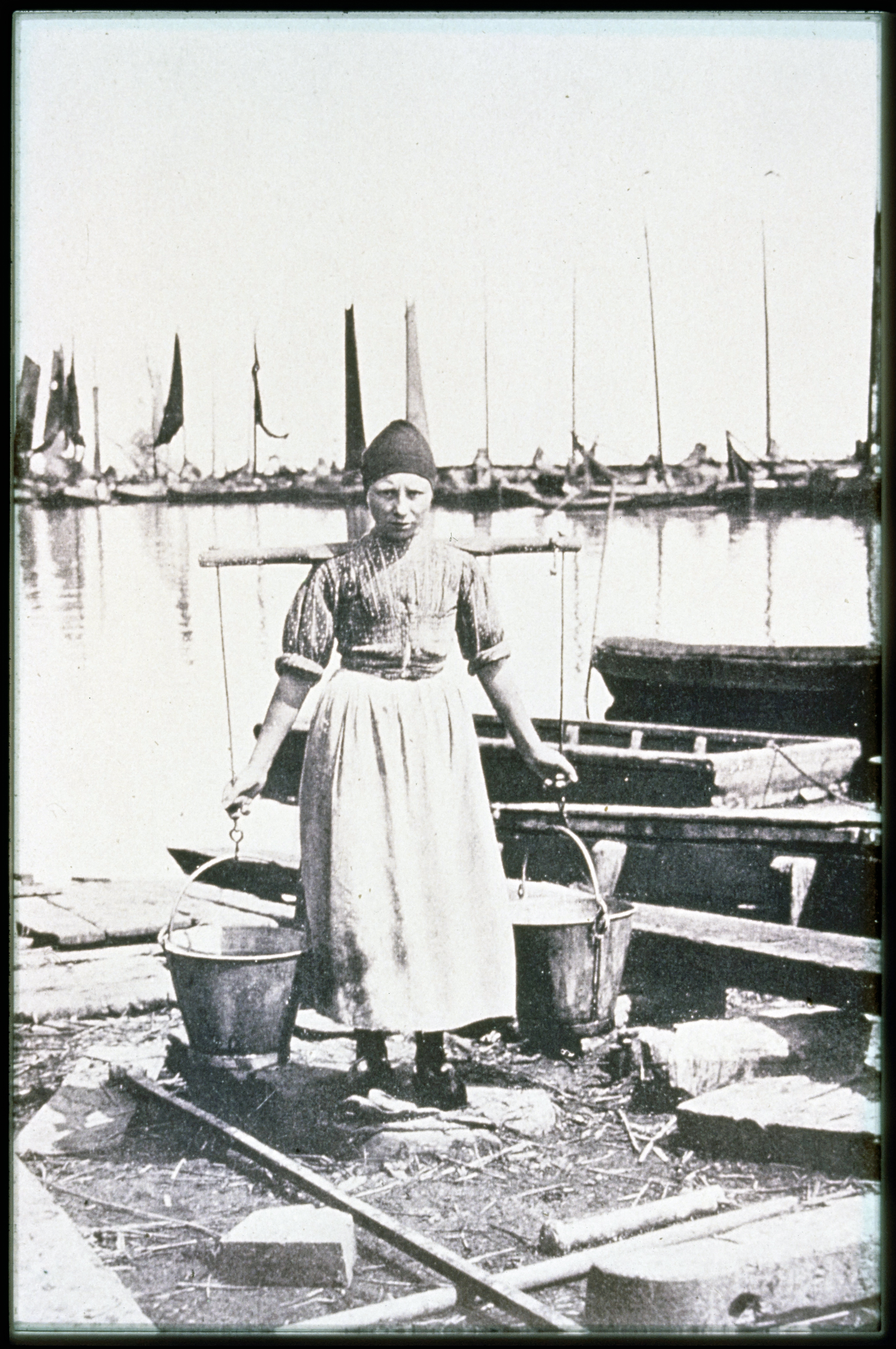 Vrouw in dracht met emmers in de haven van Volendam
