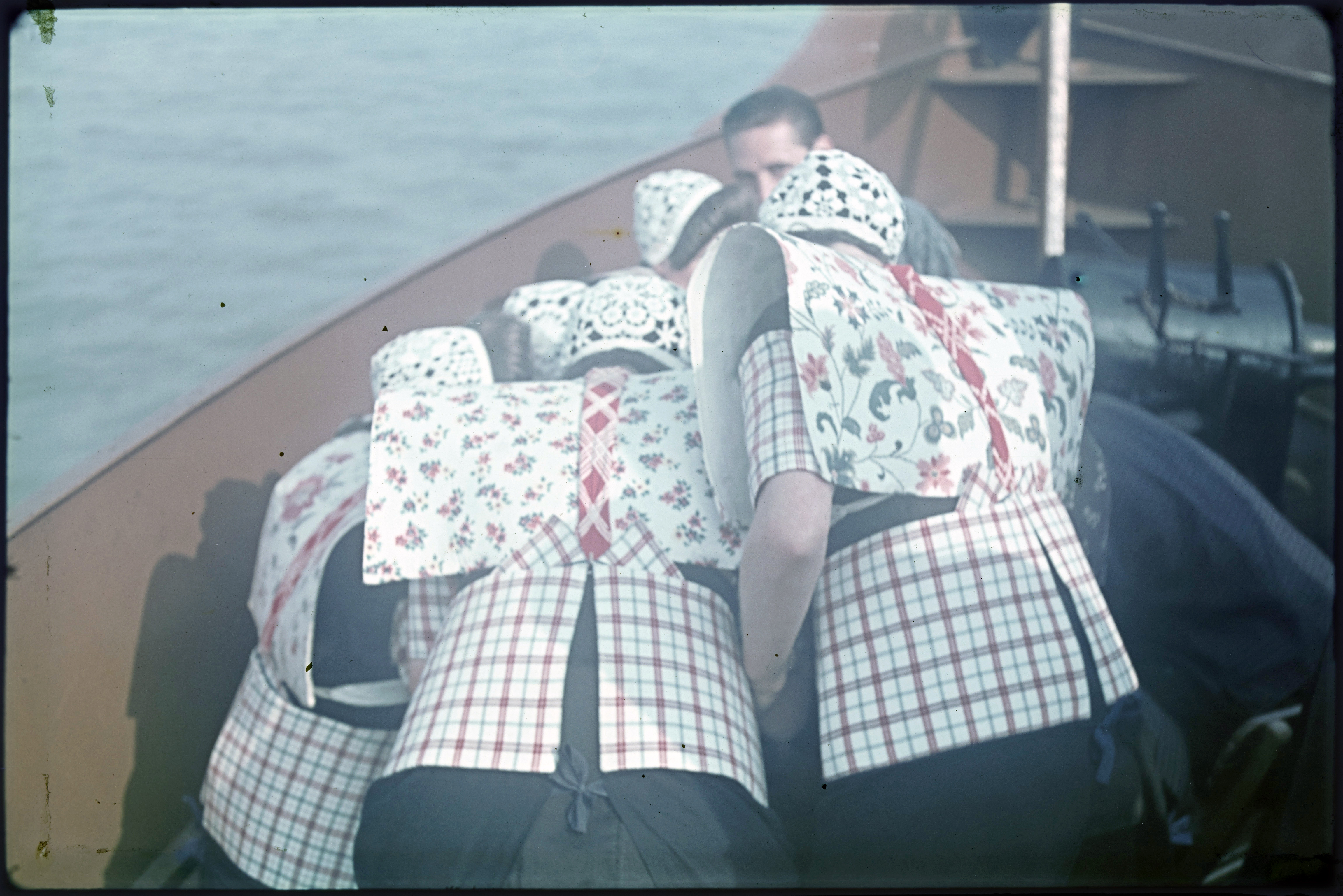 Spakenburger vrouwen in klederdracht van achter gezien