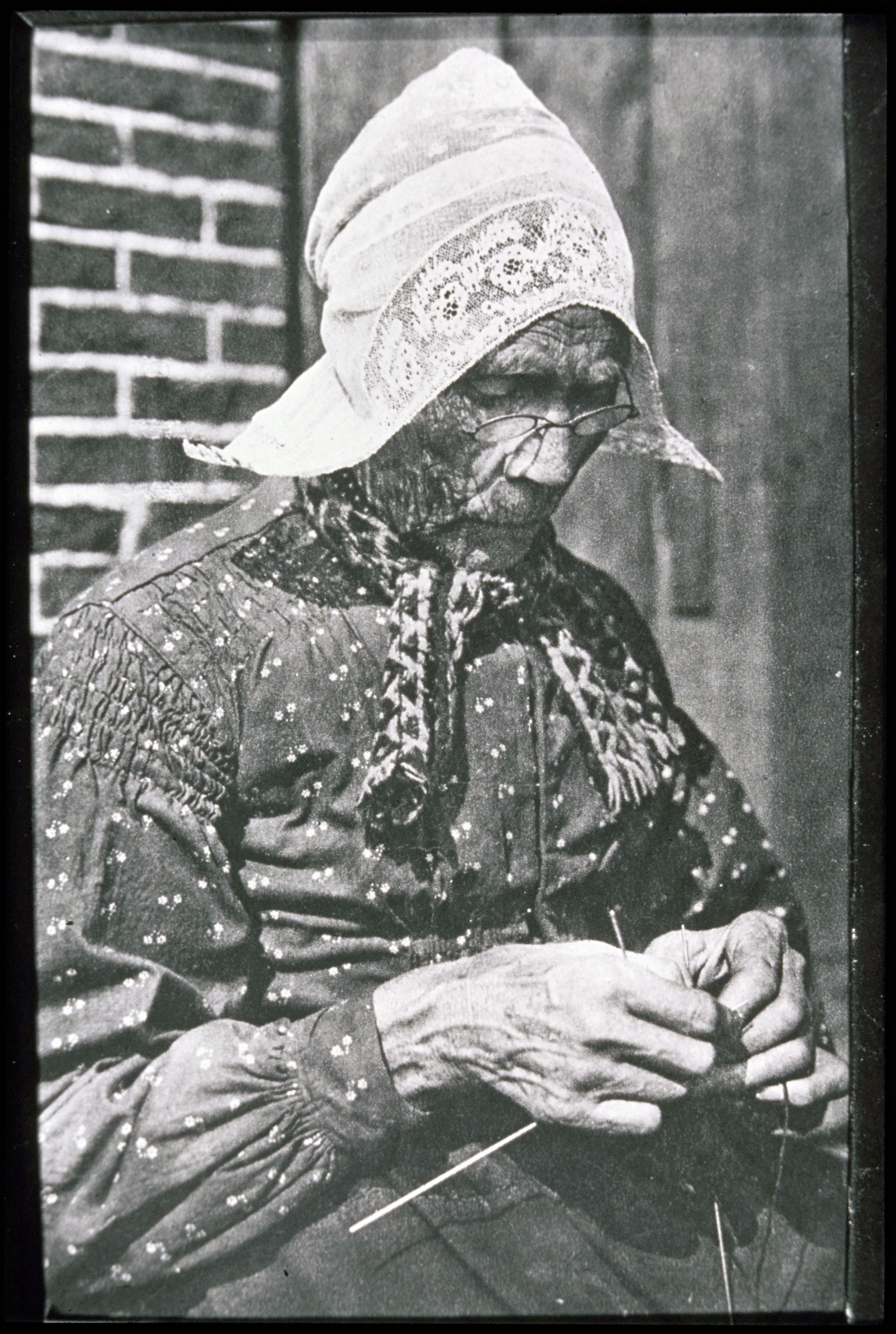 Volendammer vrouw in dracht met bril aan het breien