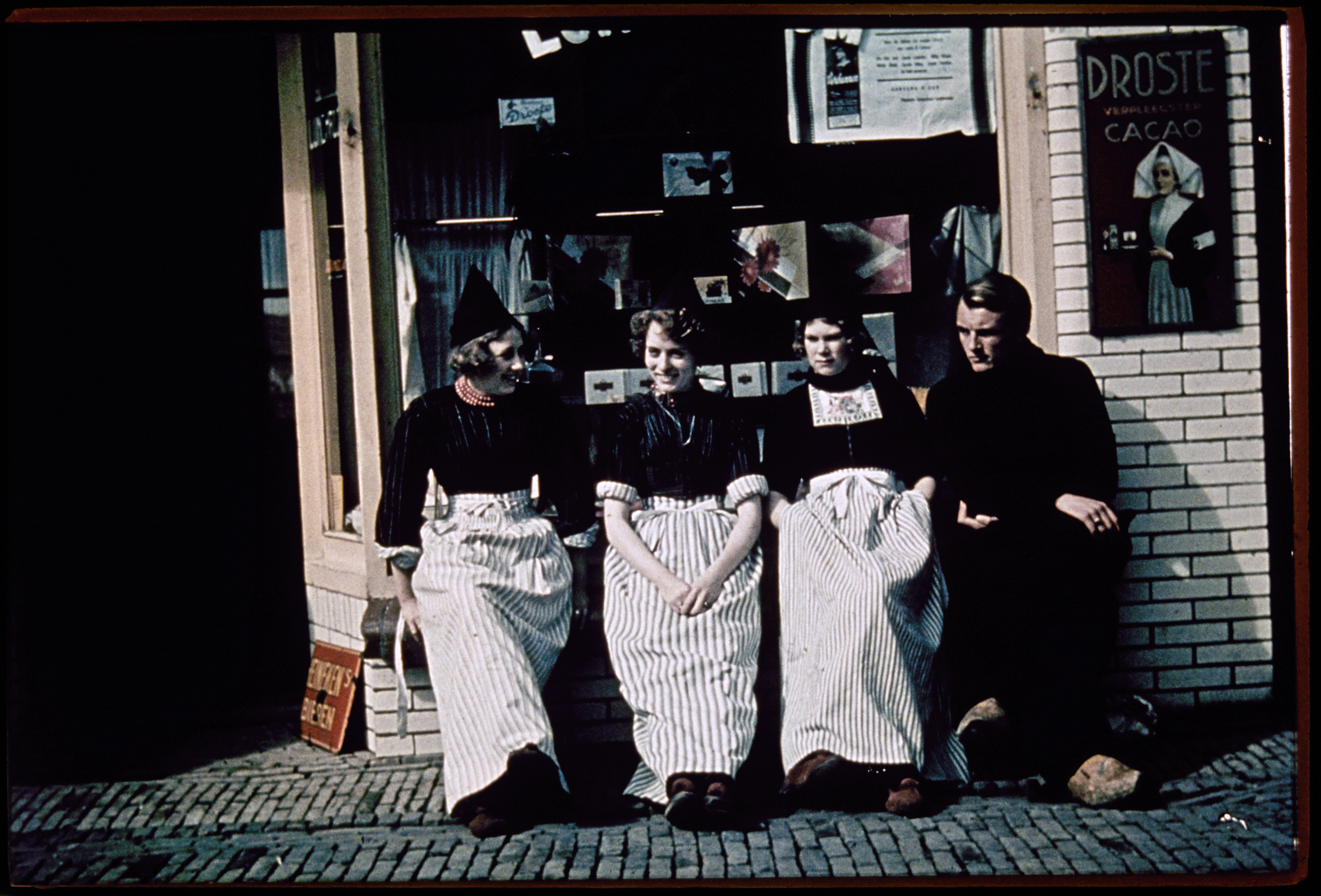 Volendammer vrouwen in dracht met toeriste vóór winkel