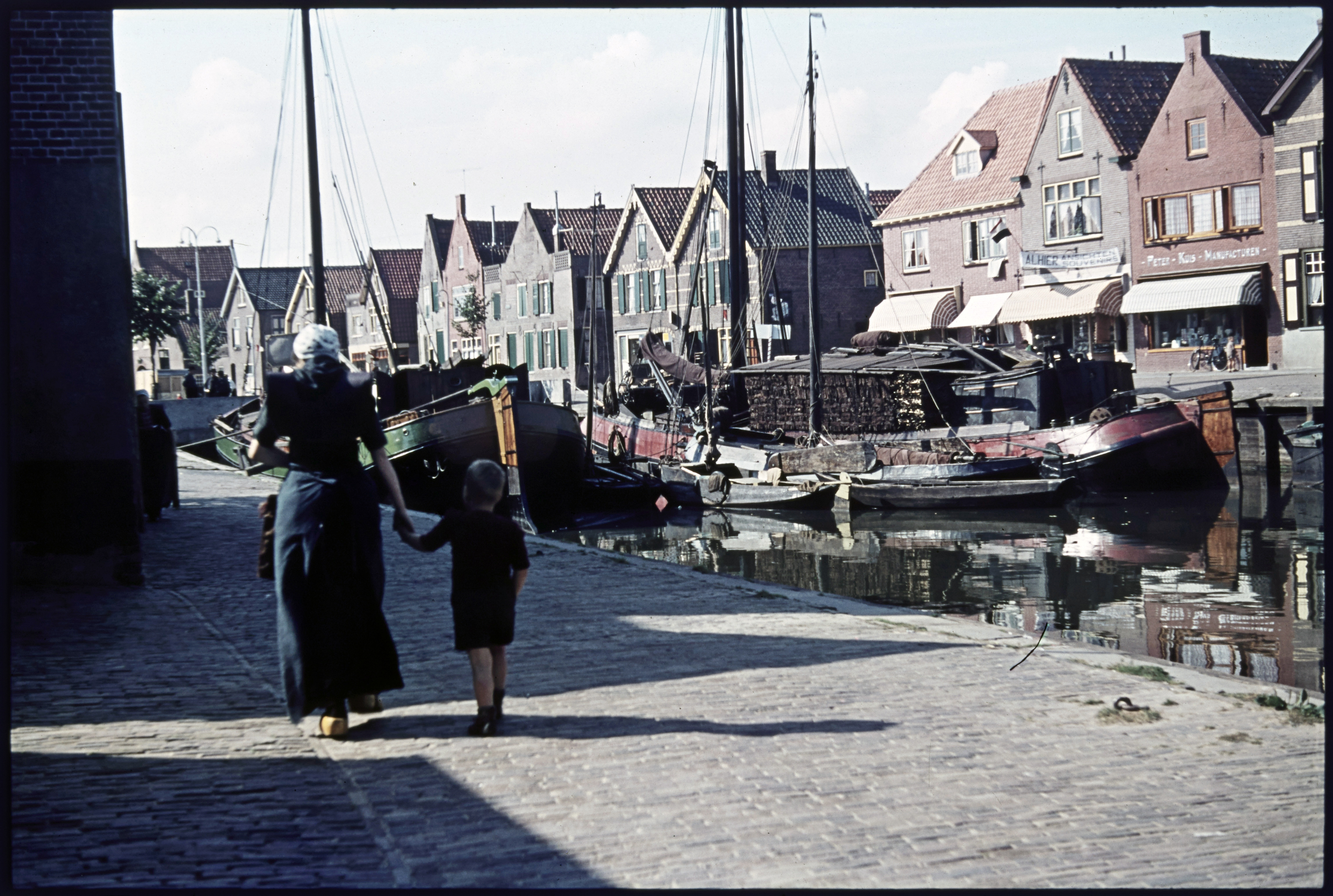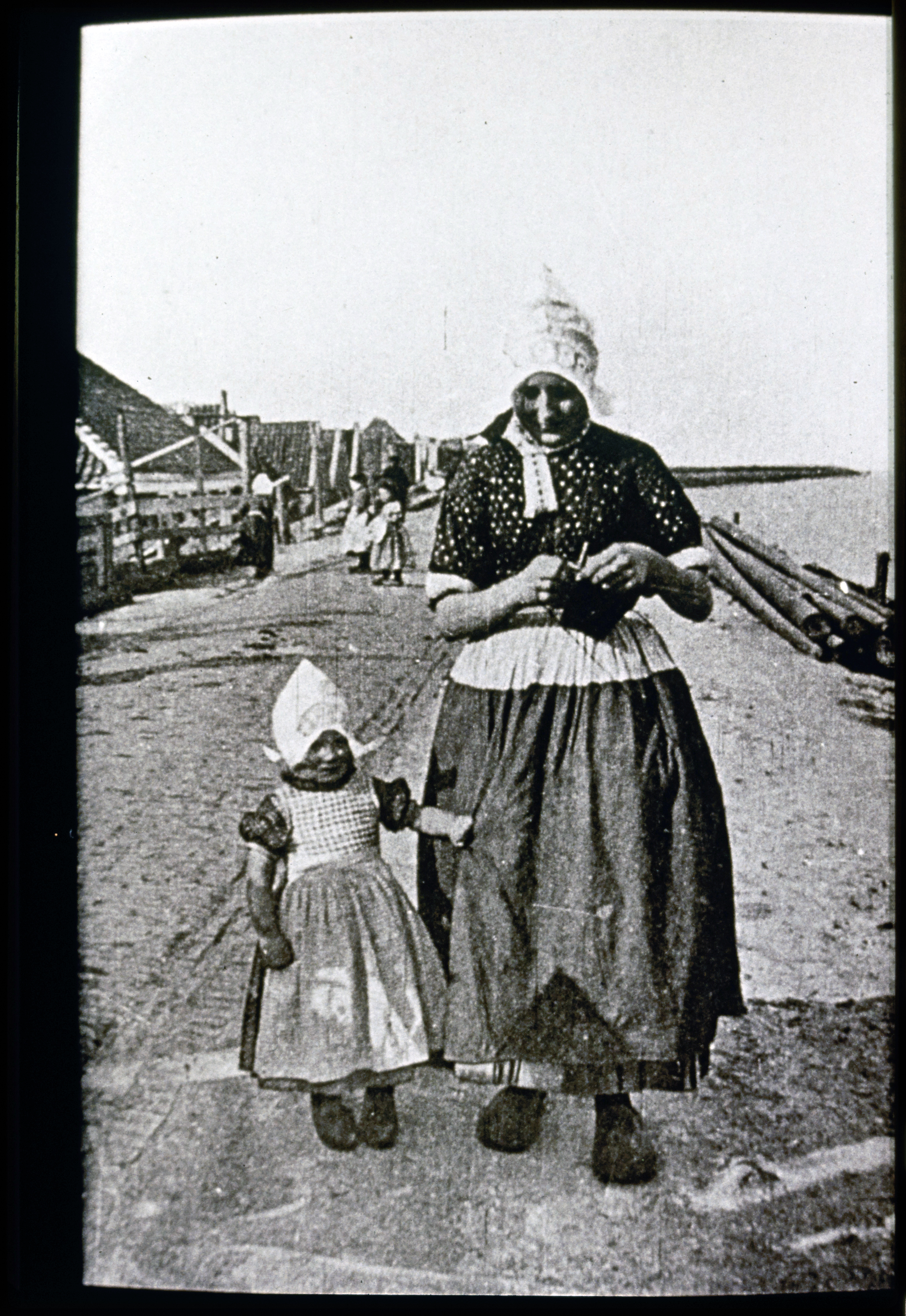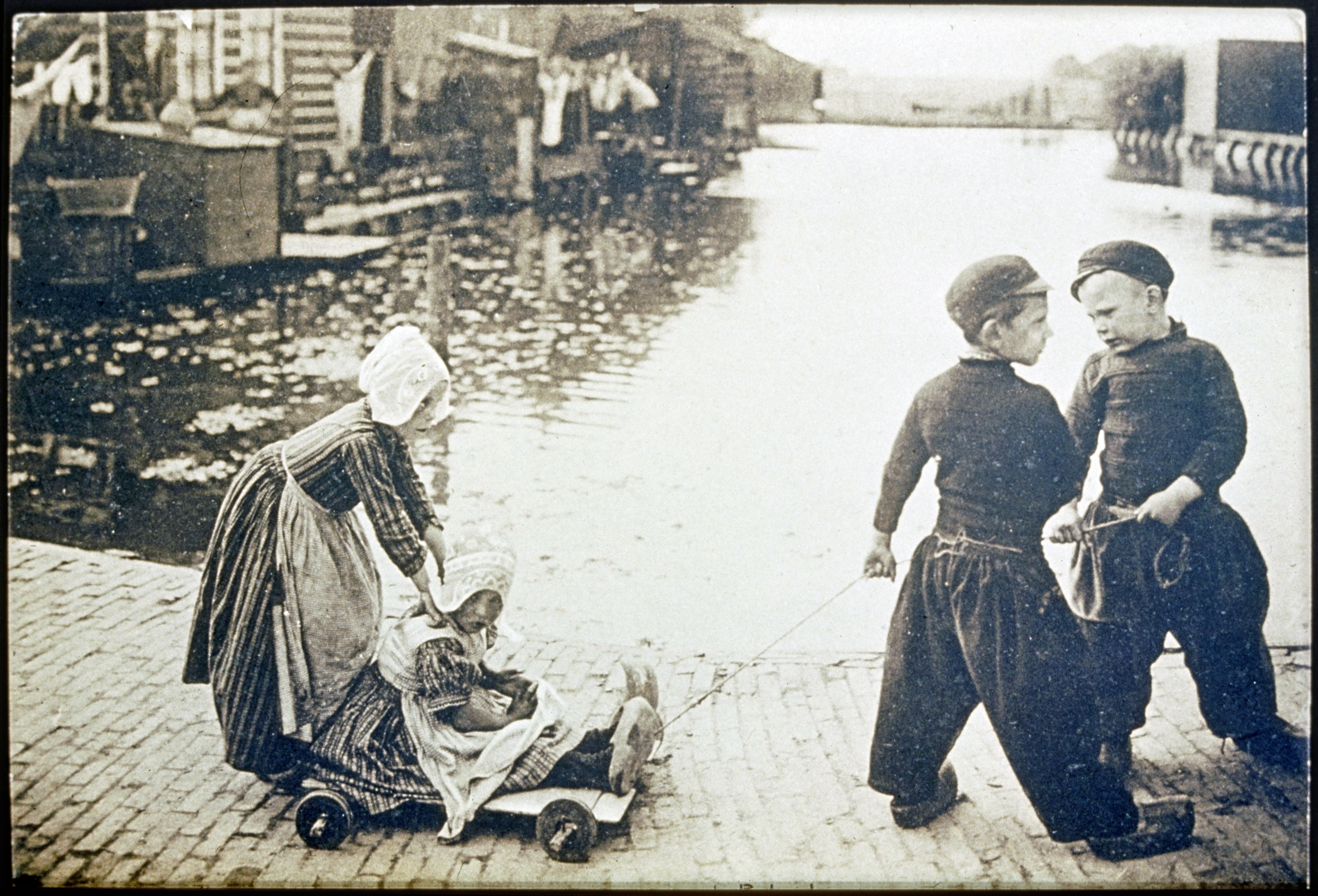 Vrouw met twee meisjes in klederdracht bij de haven