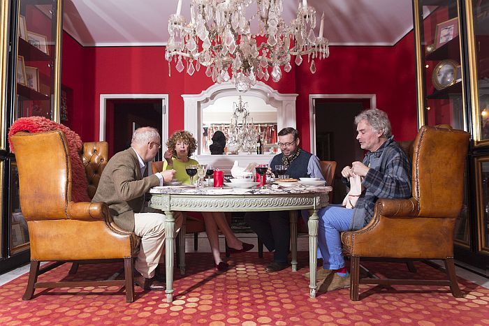 Portret van Flos met haar vriendenkring op vrijdagav...