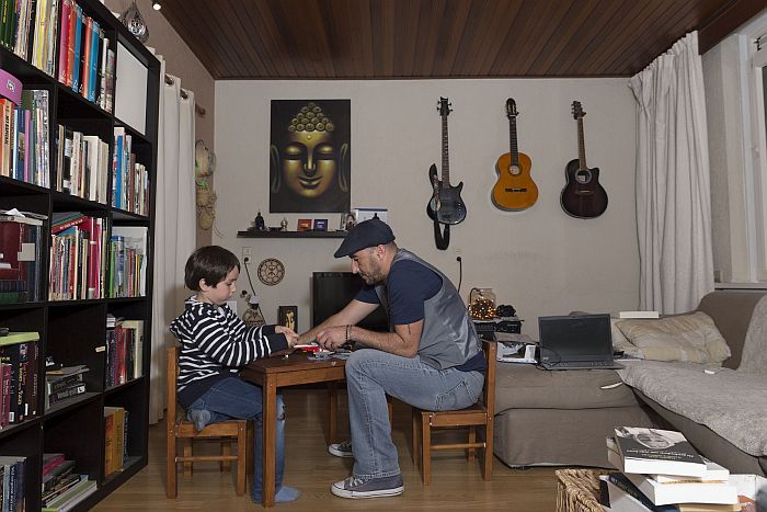 Portret van Rachid met zijn zoontje Salvador in hun ...