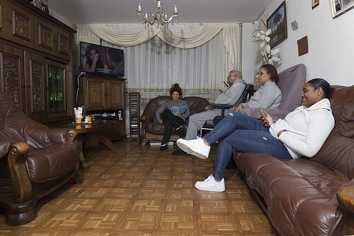 Portret van de familie Kortsmit in hun woonkamer aan...