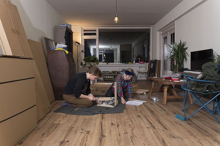 Portret van Isolde en Laura in de woonkamer van hun ...