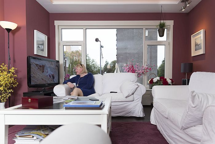Portret van Cisca in haar woonkamer aan de Prof. Poe...