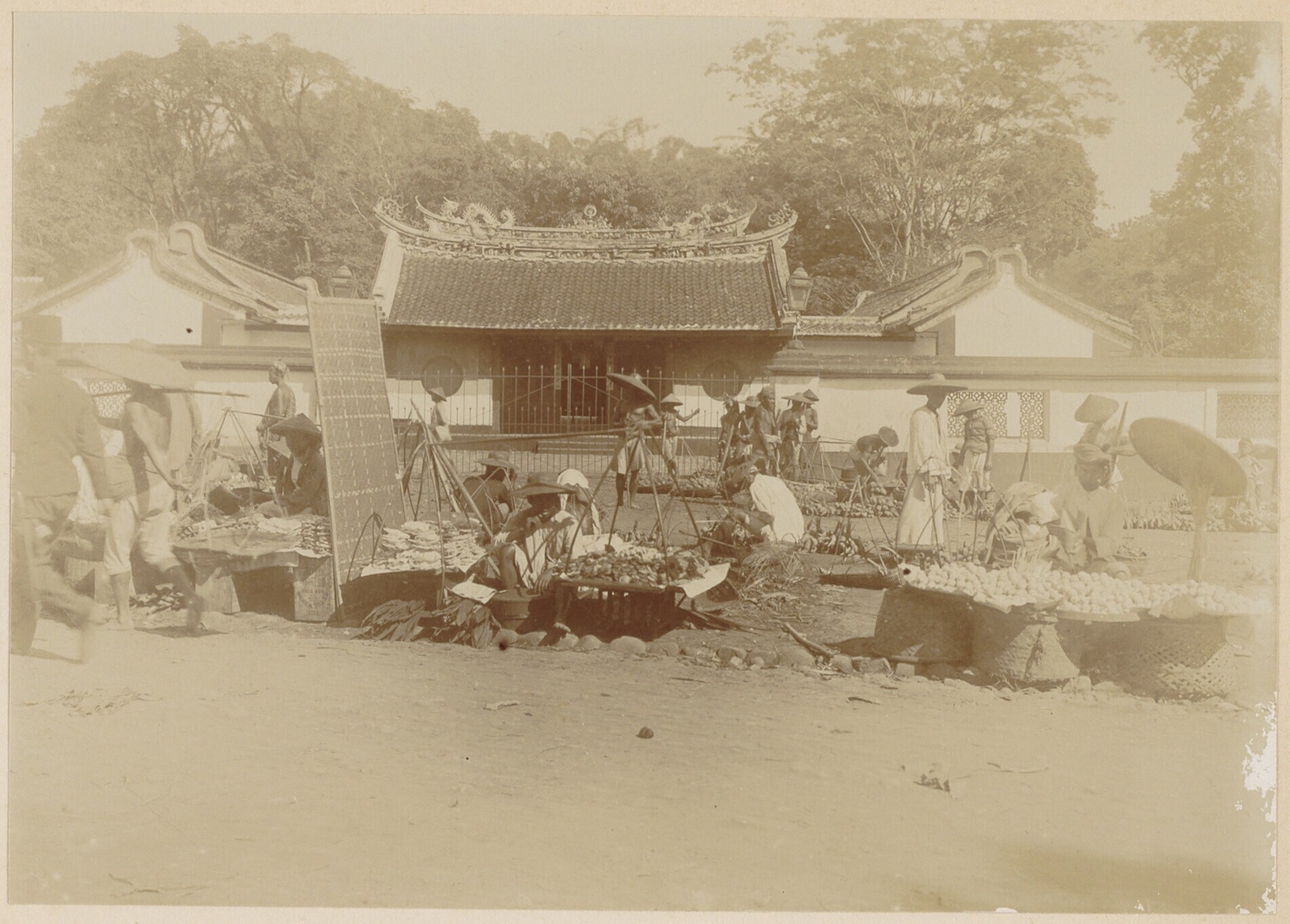 Marktkooplieden verkopen hun waar voor een Chinese t...