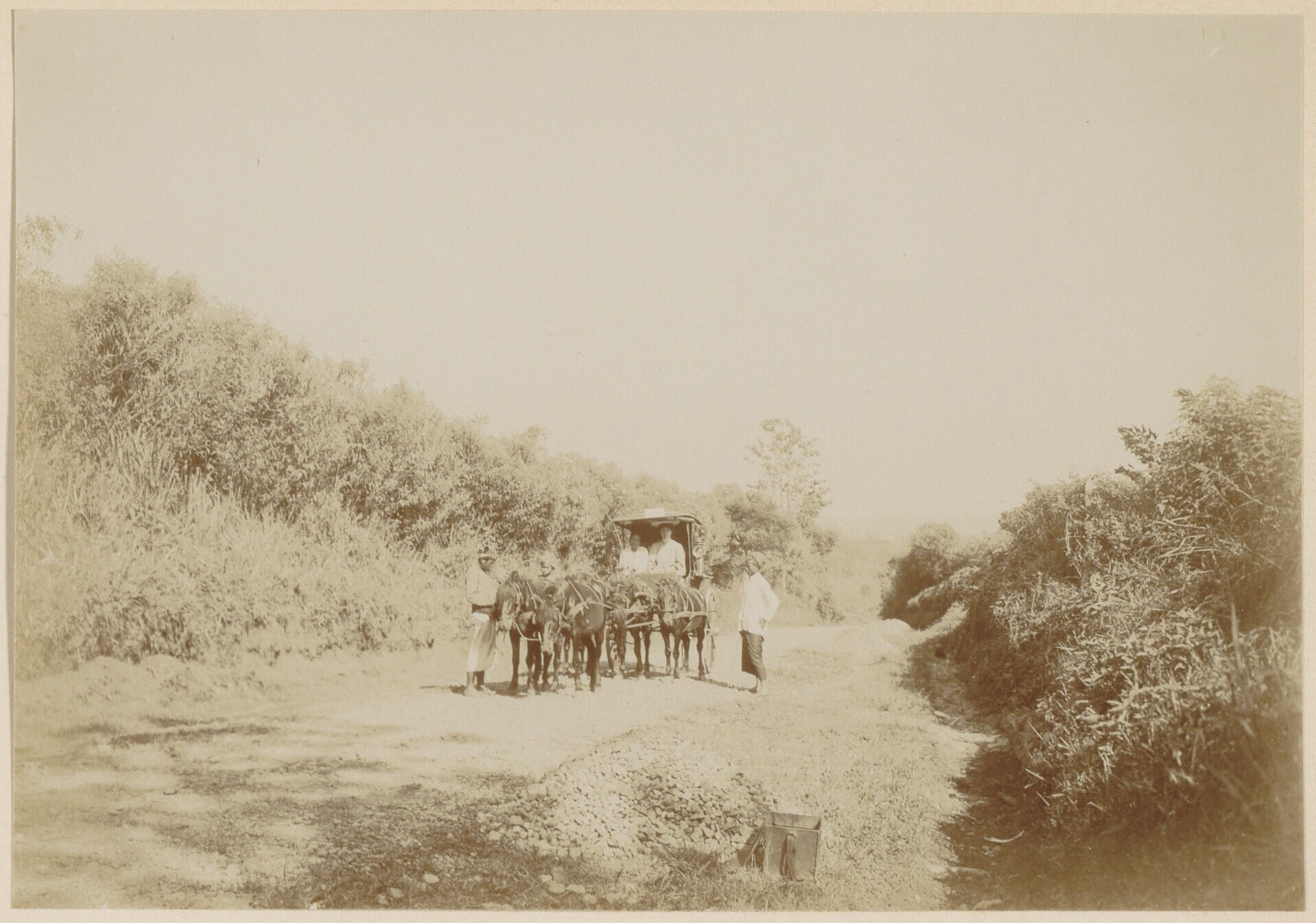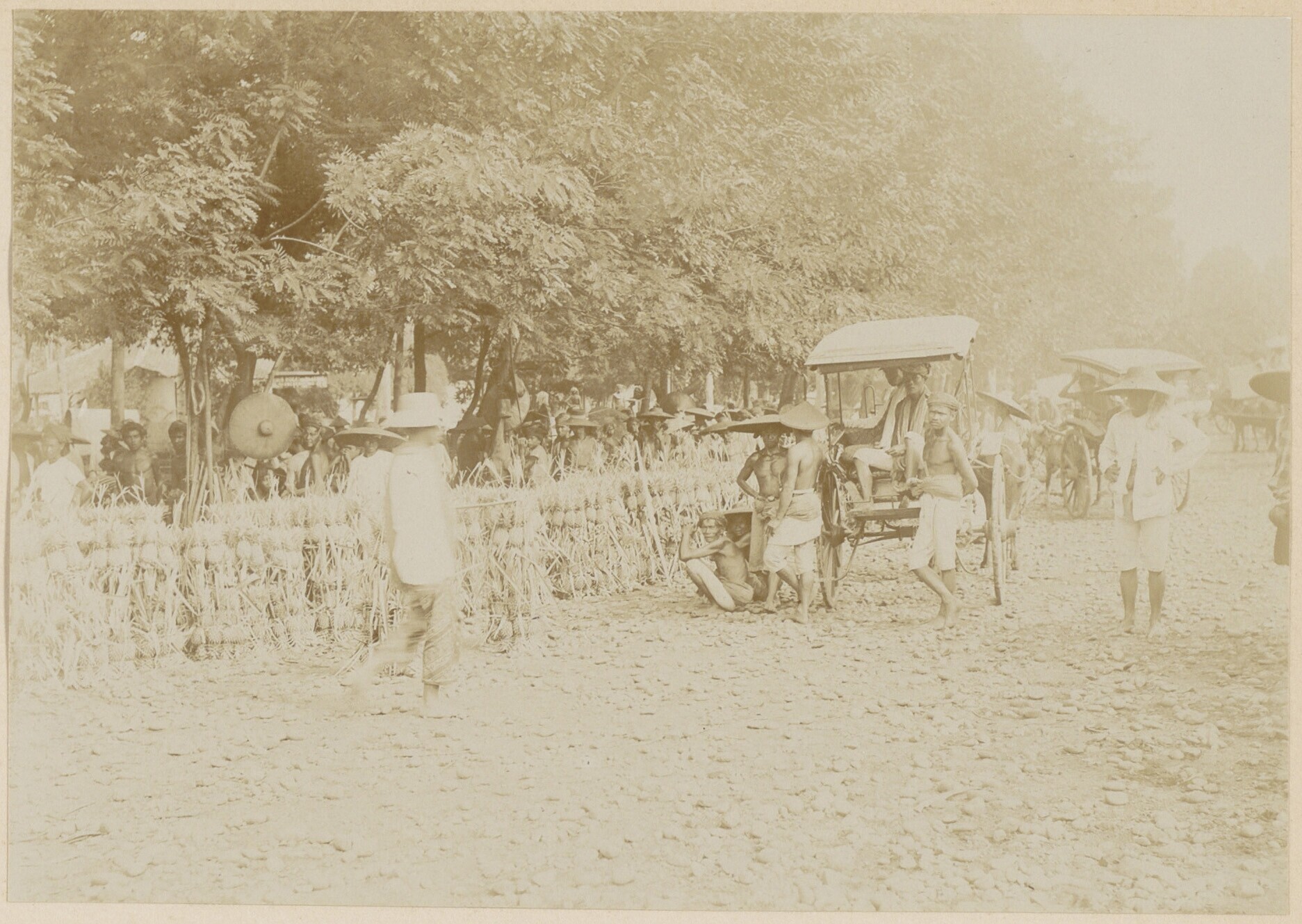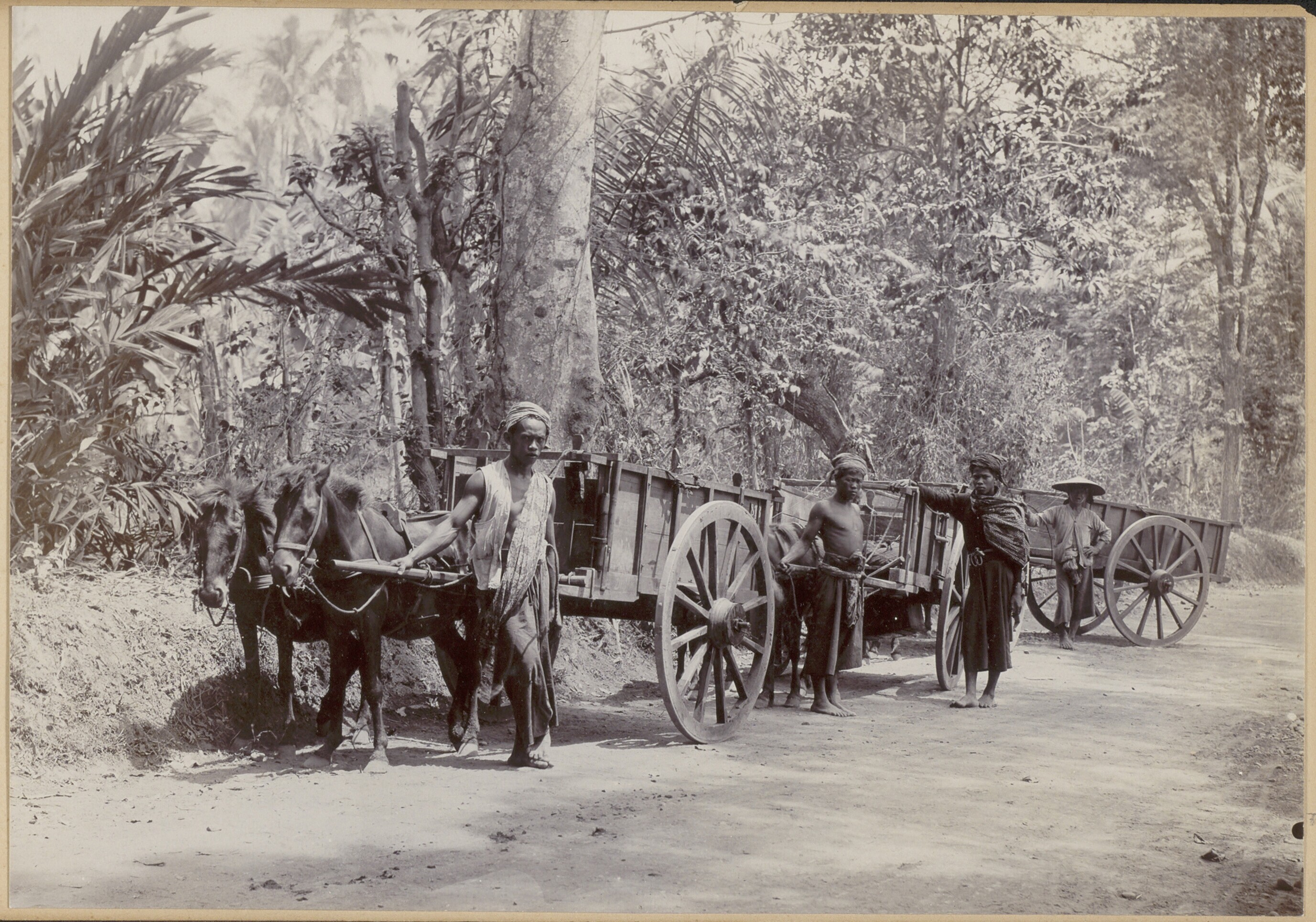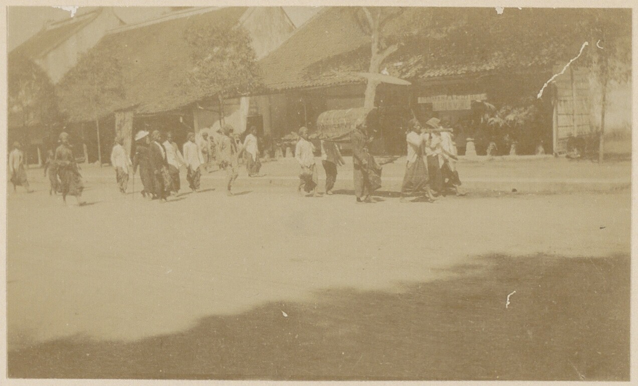 Straatbeeld op Java met een tram rechts op de voorgrond