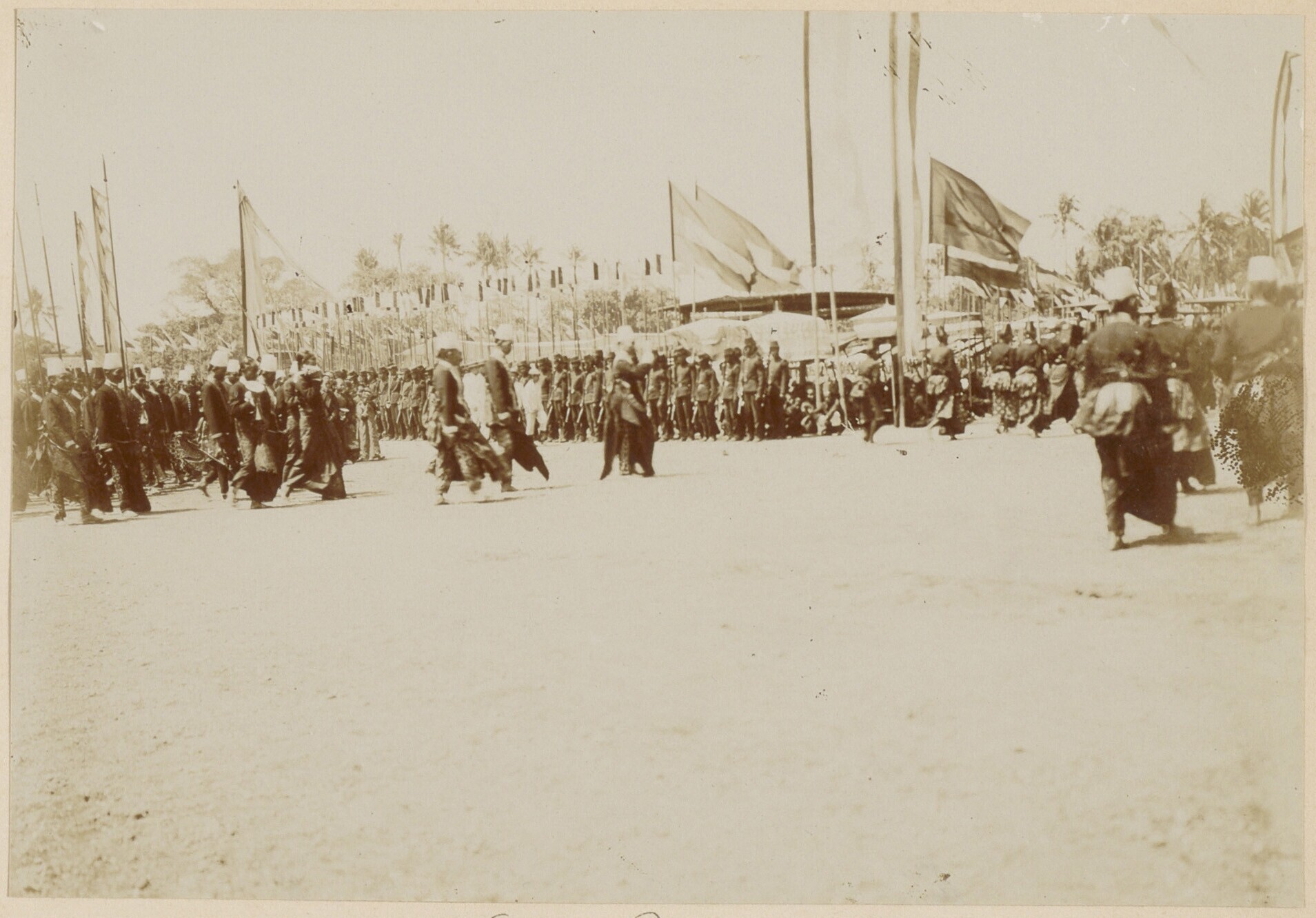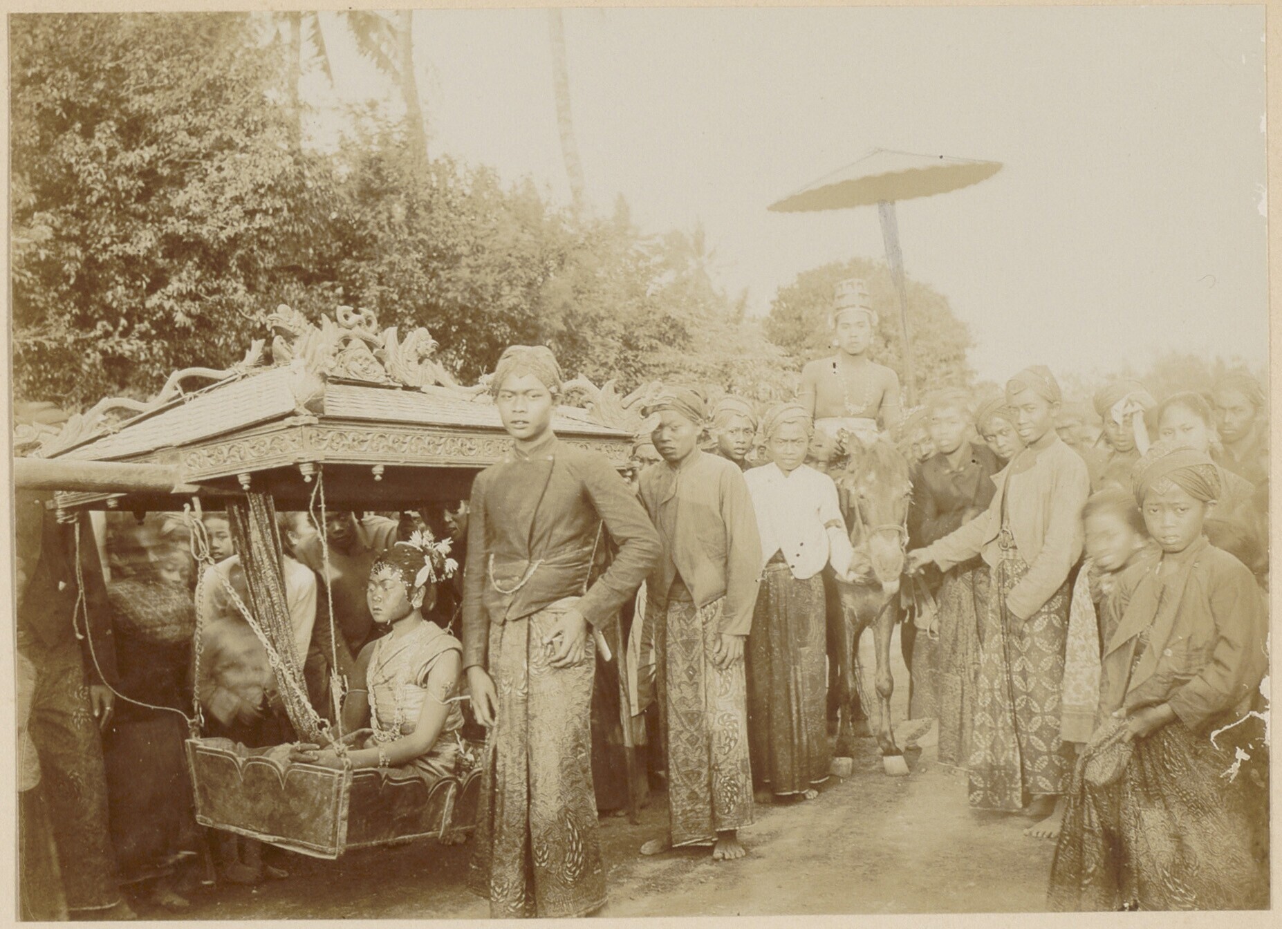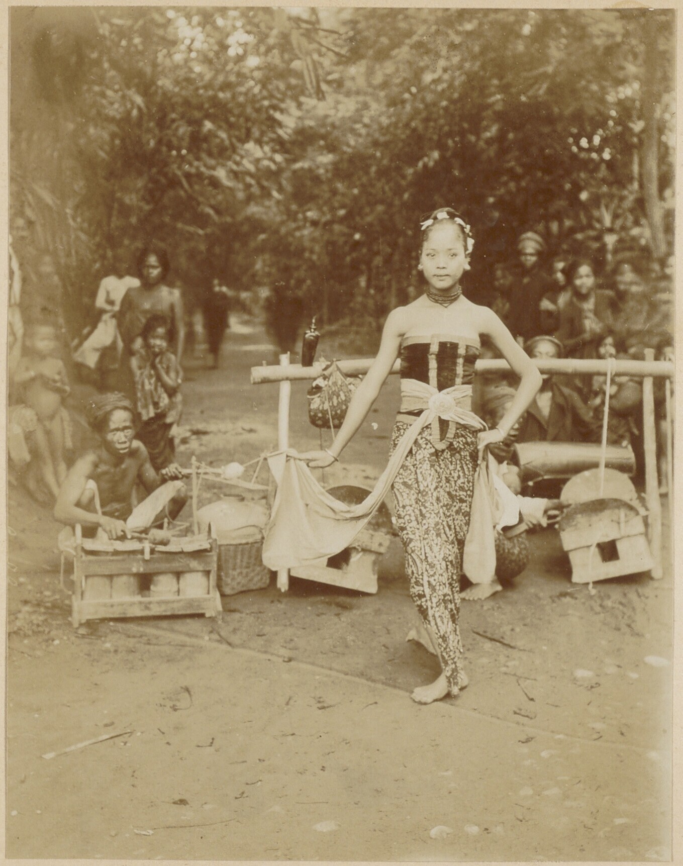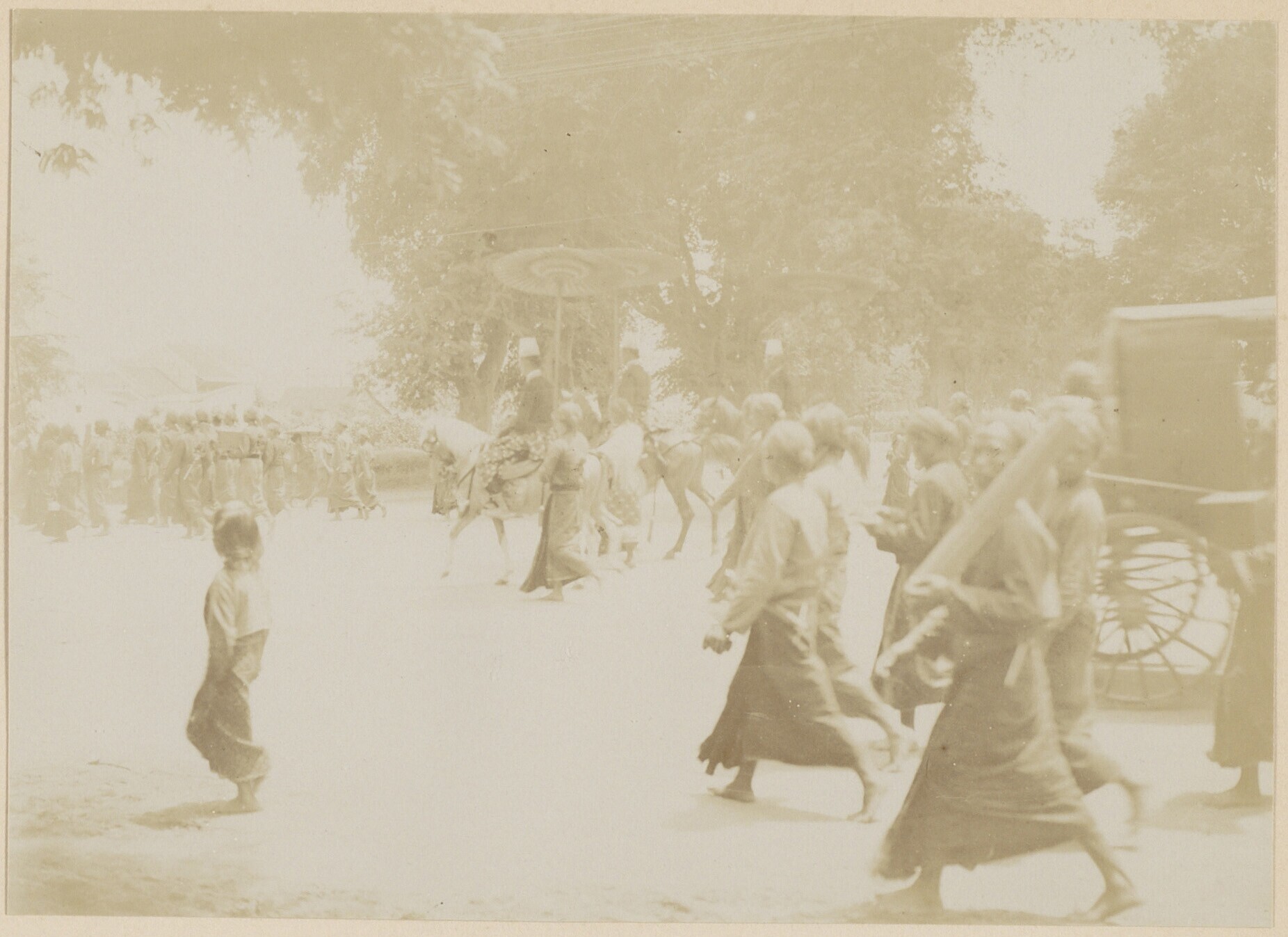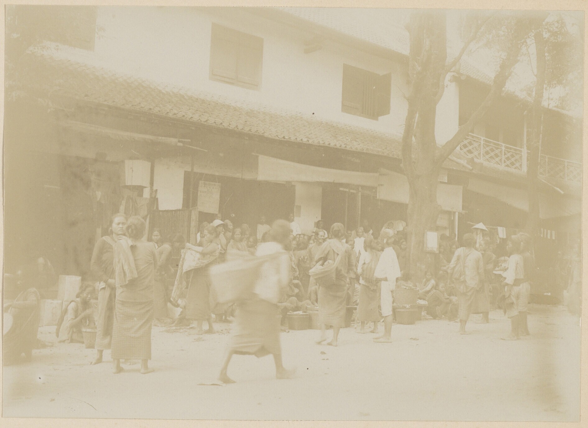 Straatbeeld op Java met een tram rechts op de voorgrond