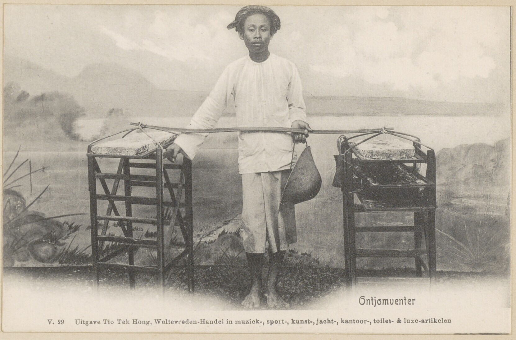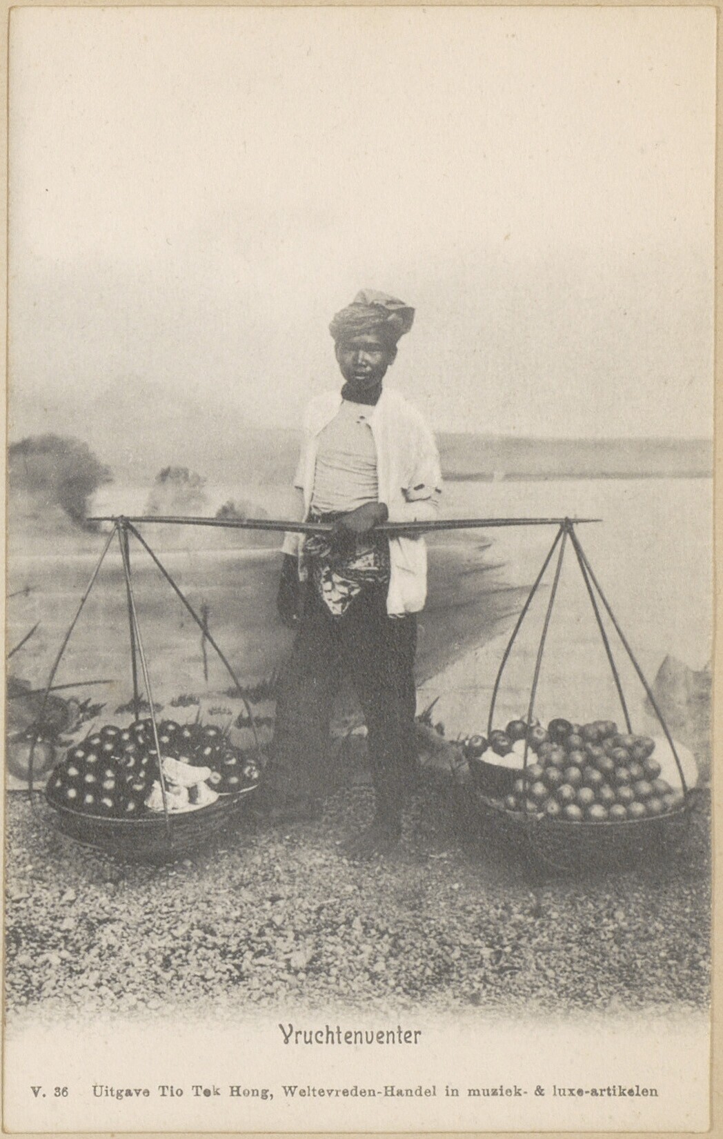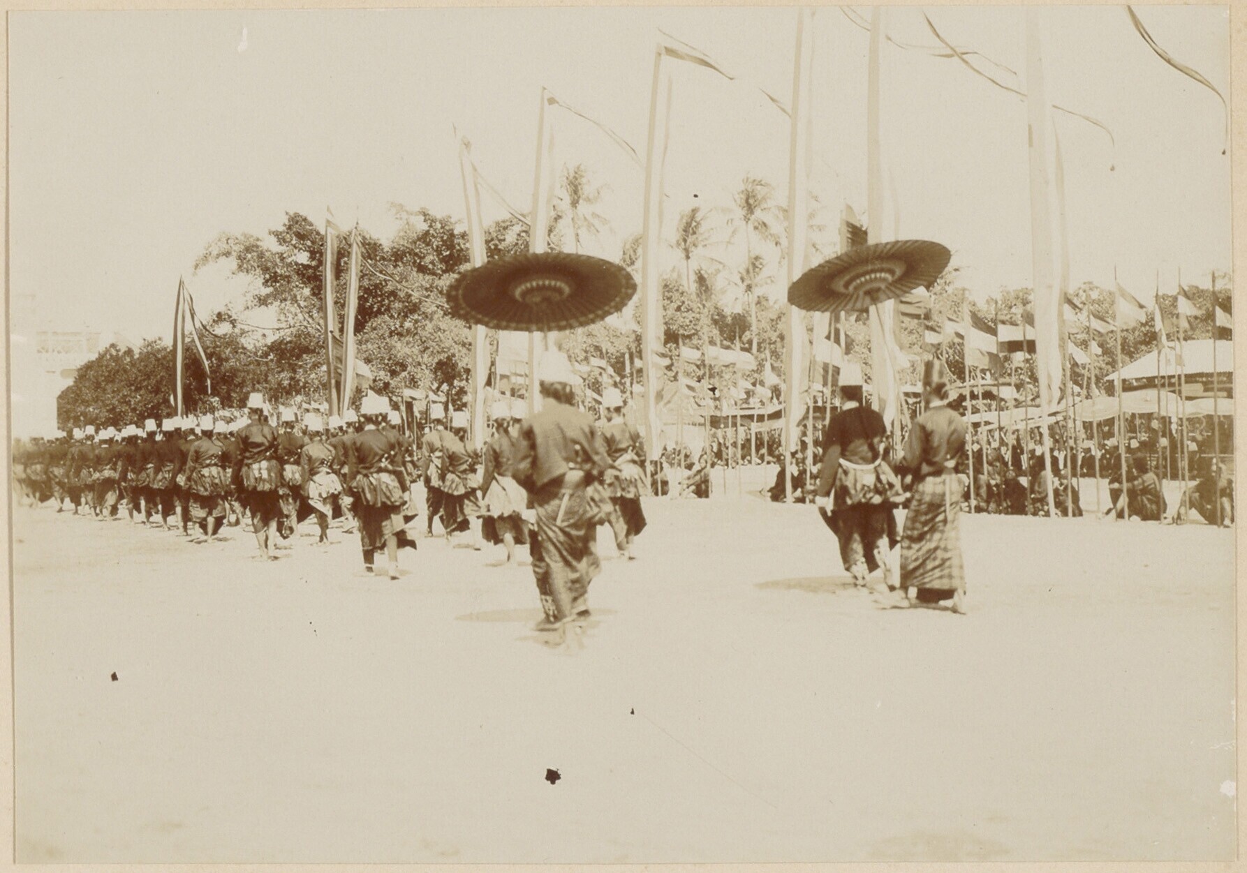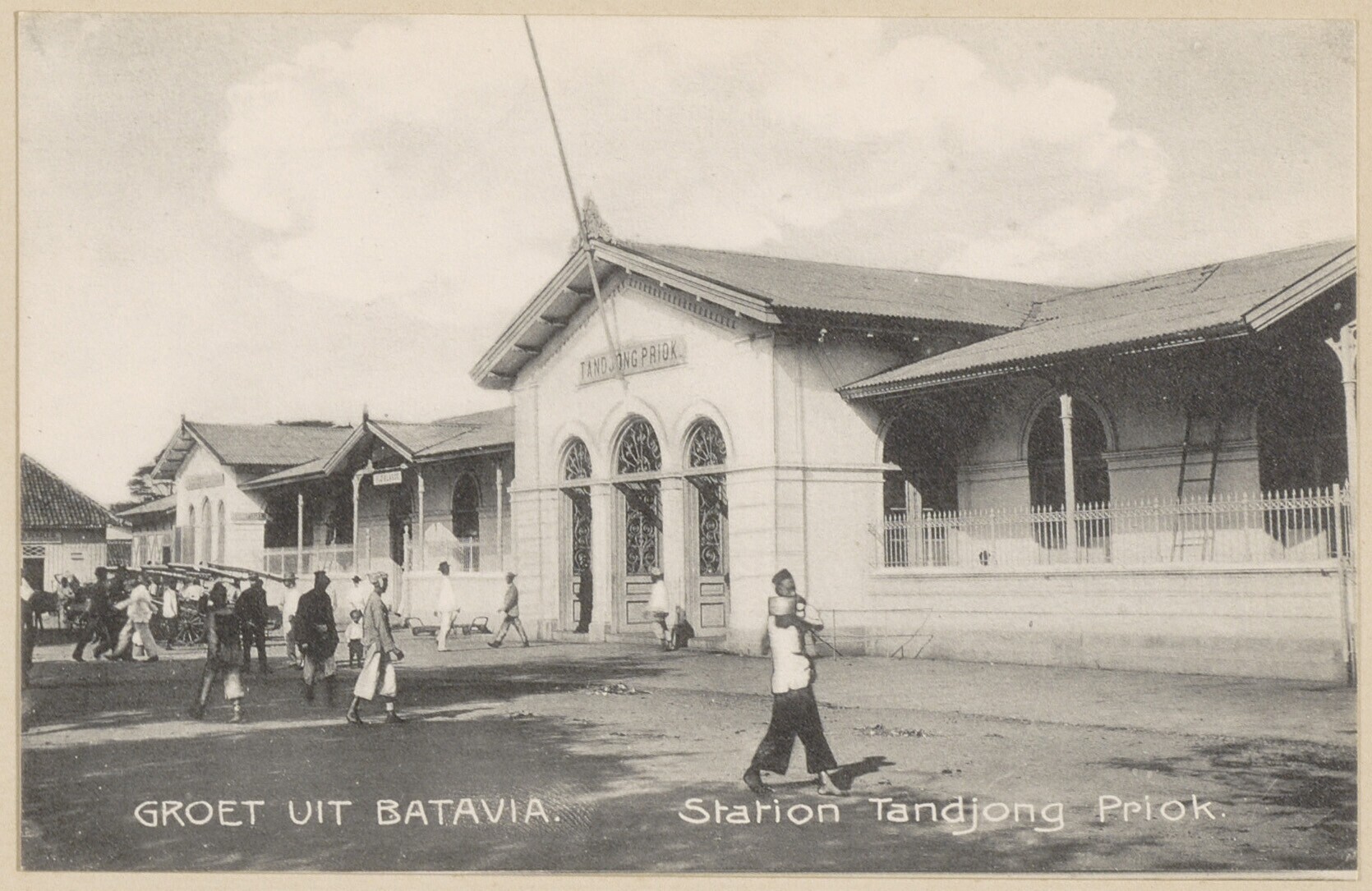 Straatbeeld op Java met een tram rechts op de voorgrond