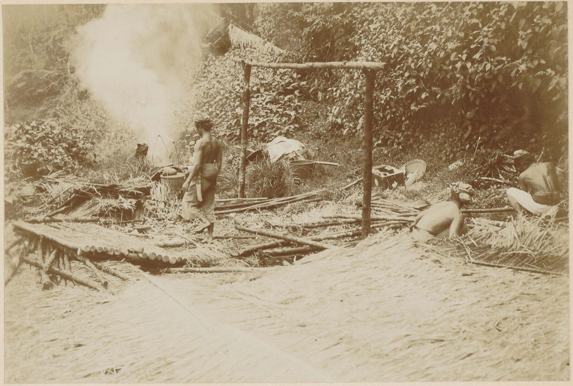Mannen bouwen een onderkomen met rieten daken en mak...
