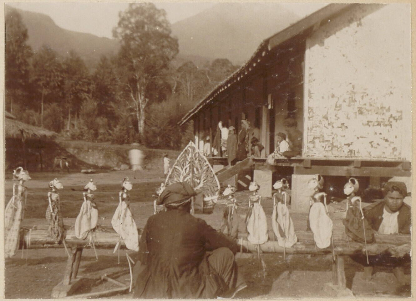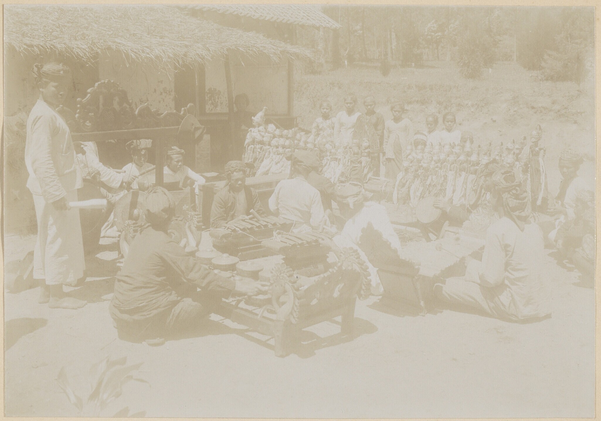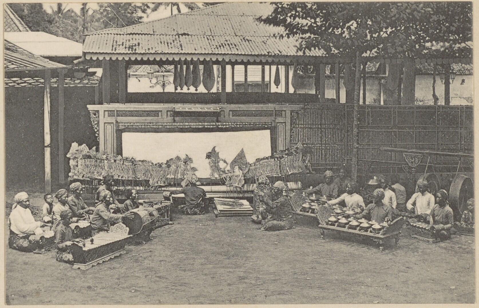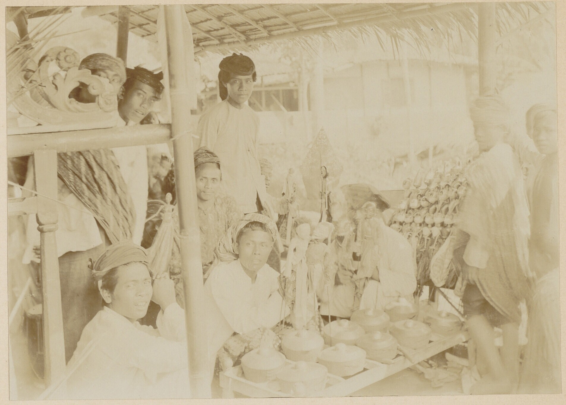 Groepsfoto van muziekanten en wajangpoppenspelers