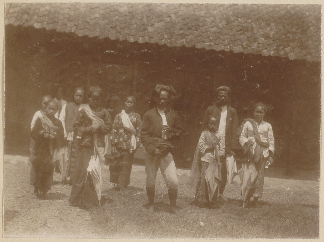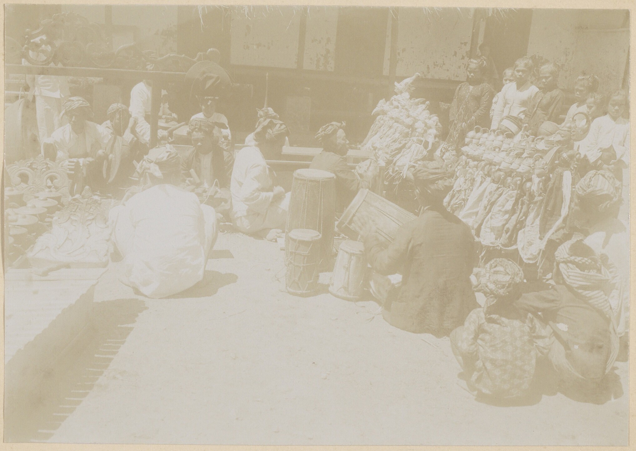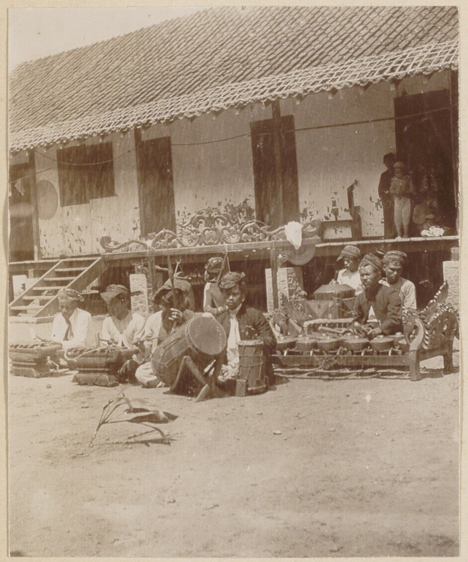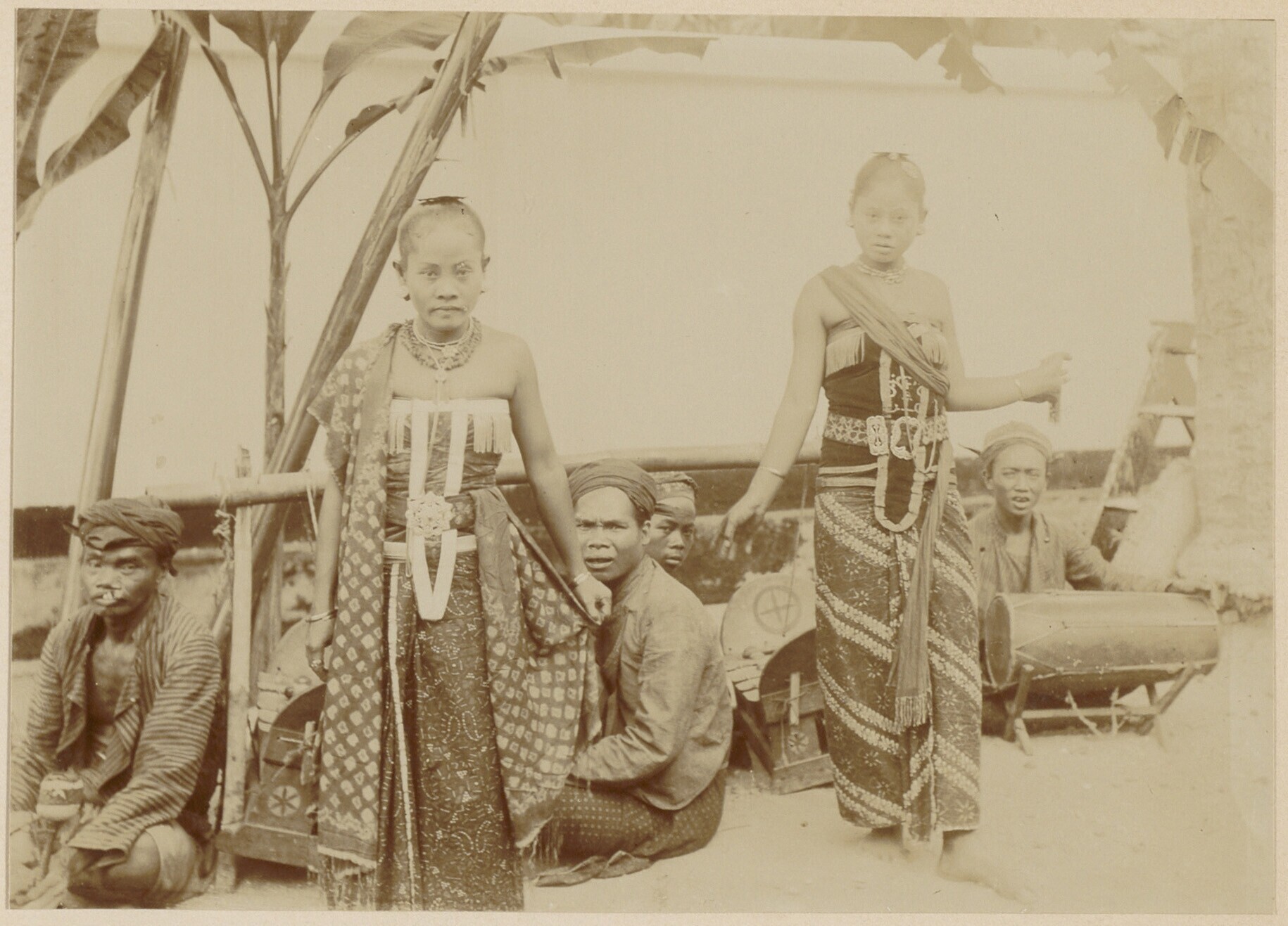 Groepsfoto van muziekanten en wajangpoppenspelers