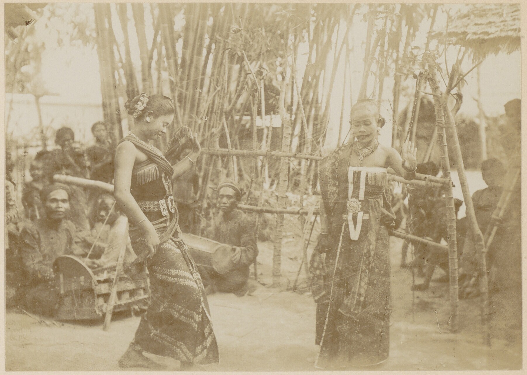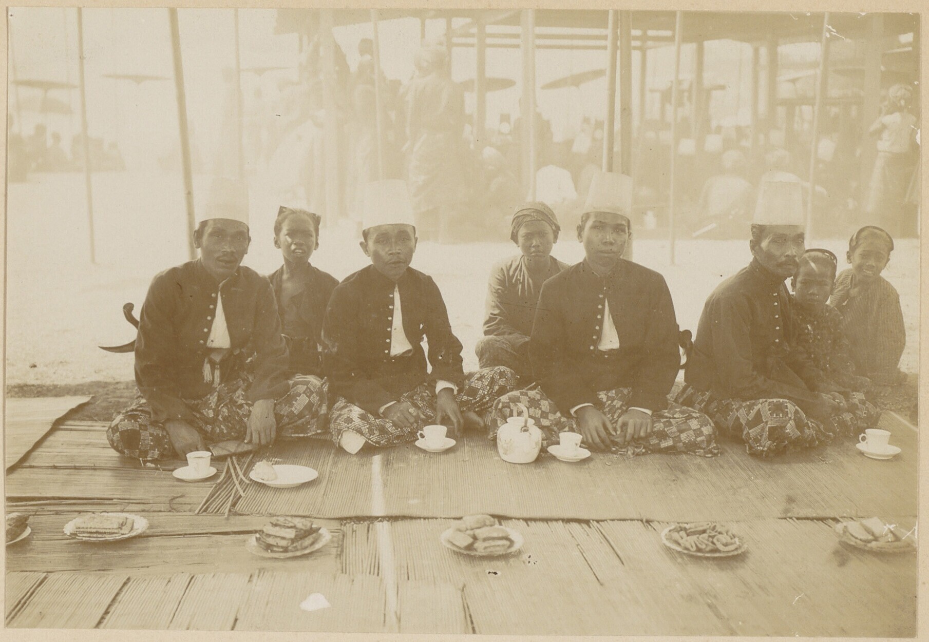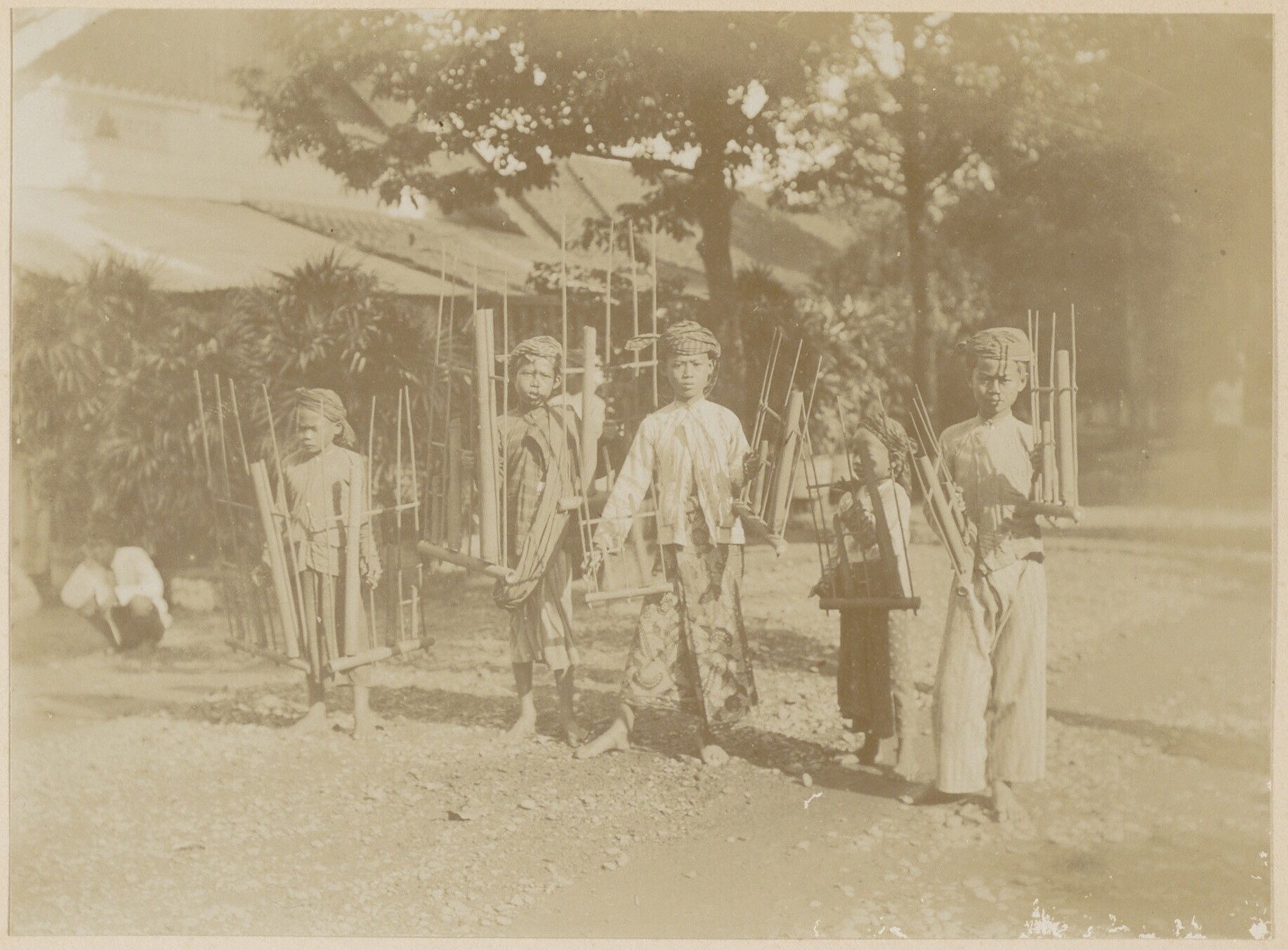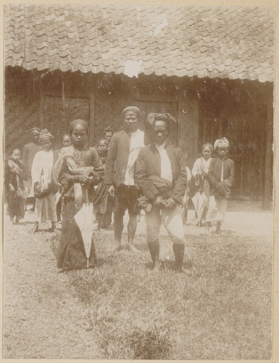 Groepsfoto van muziekanten en wajangpoppenspelers
