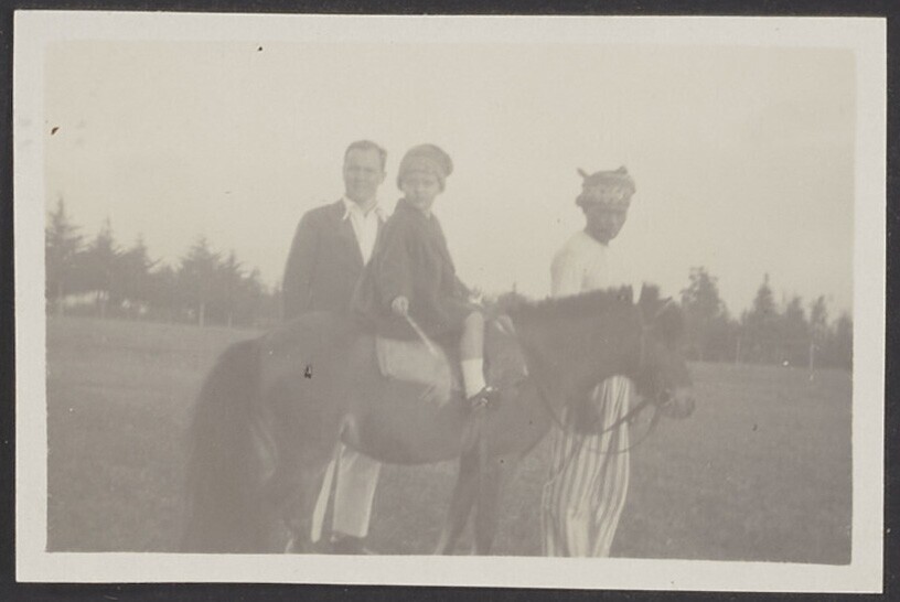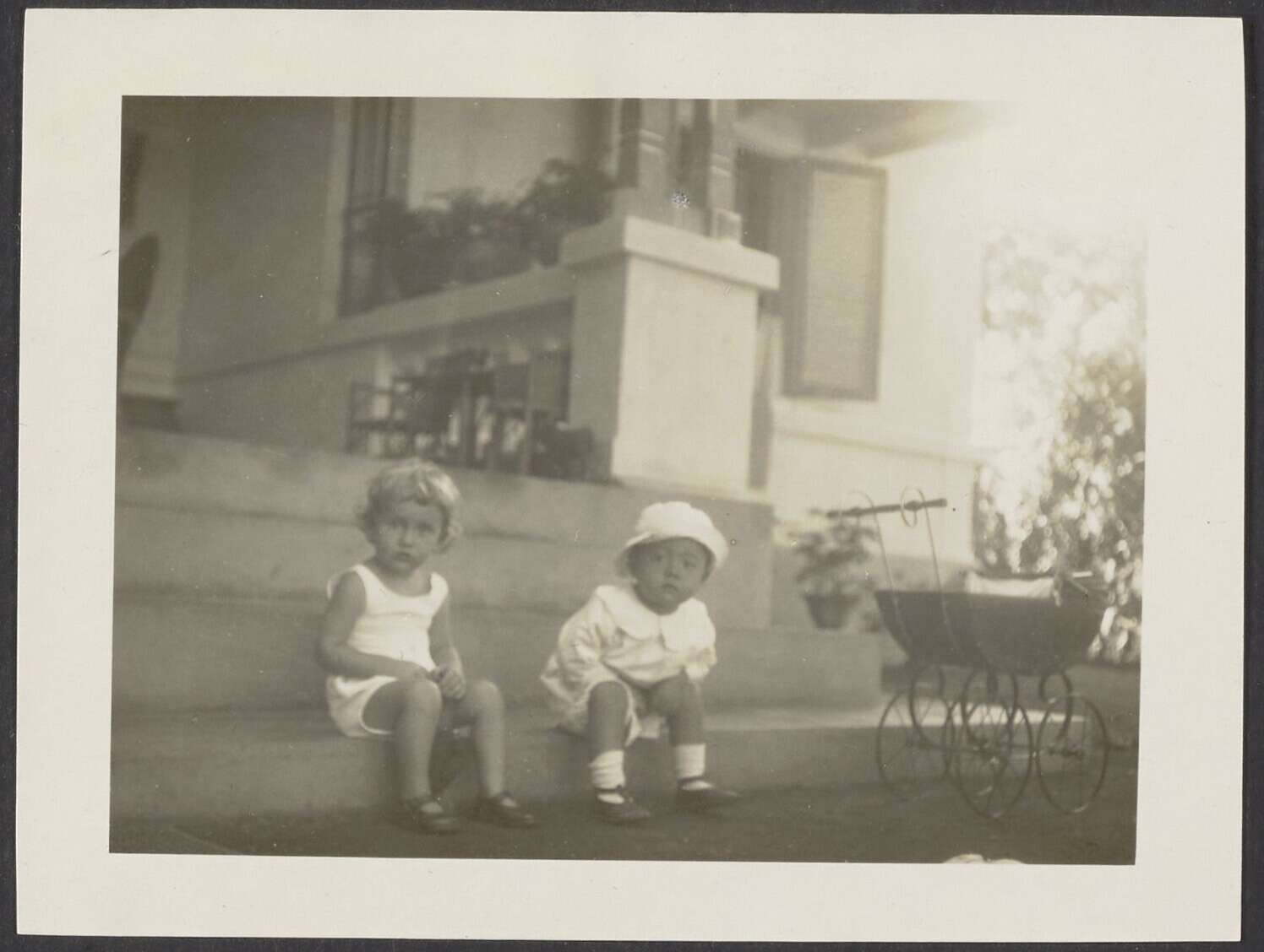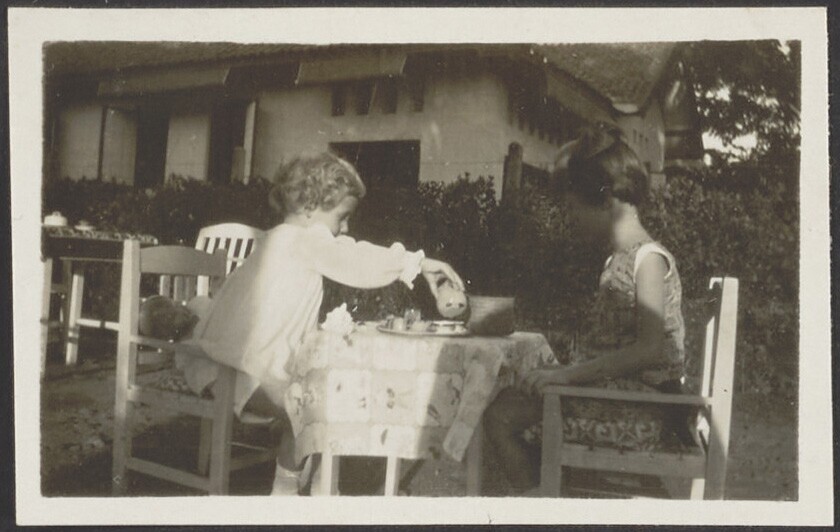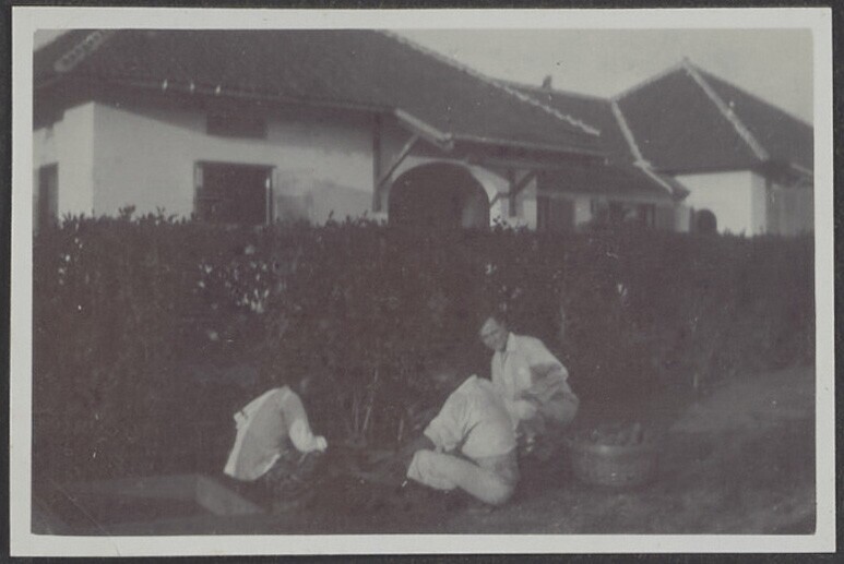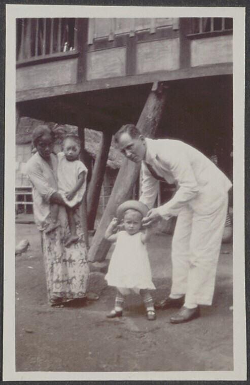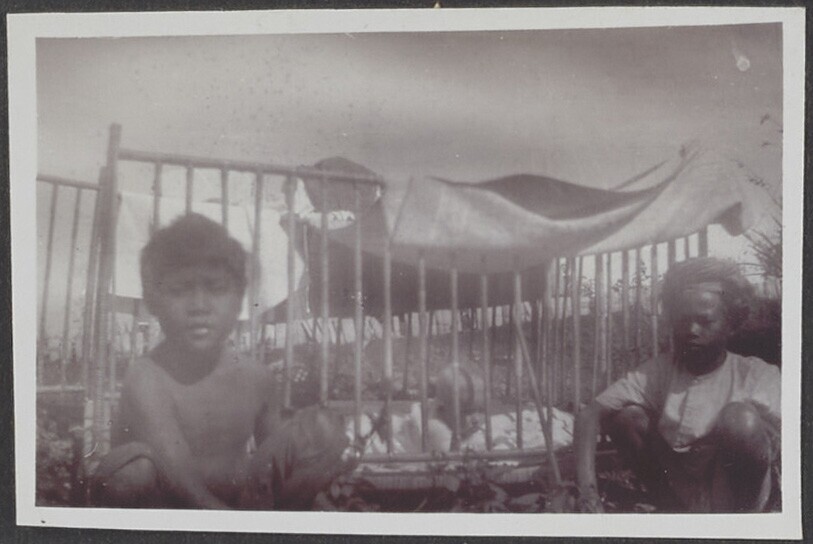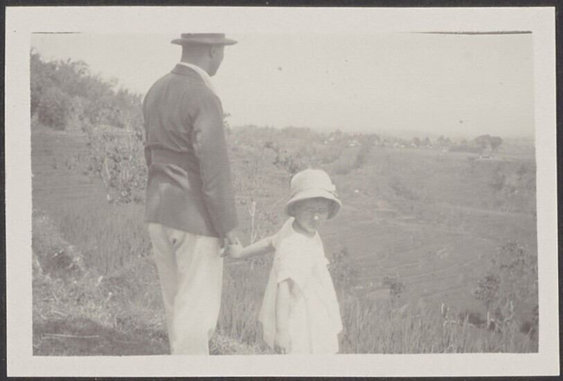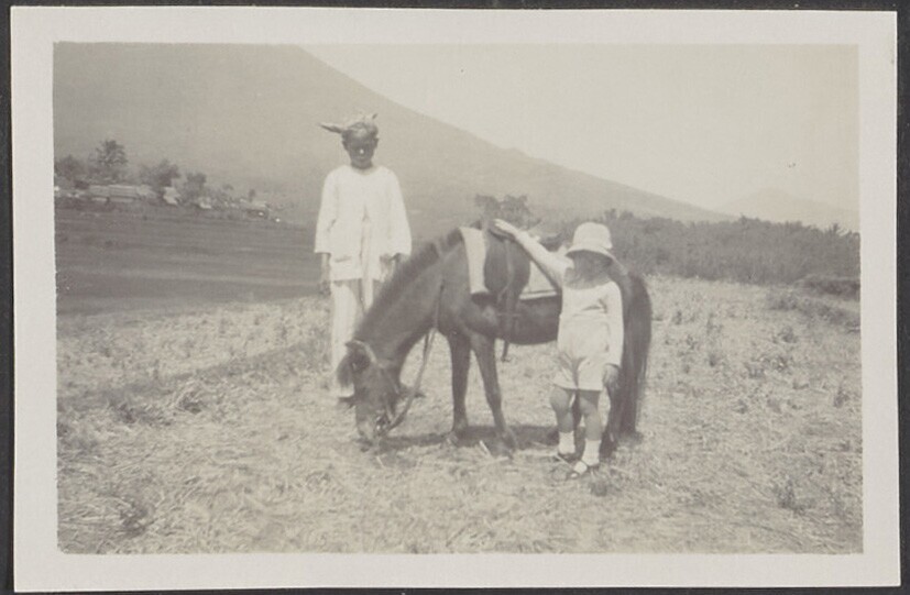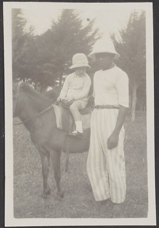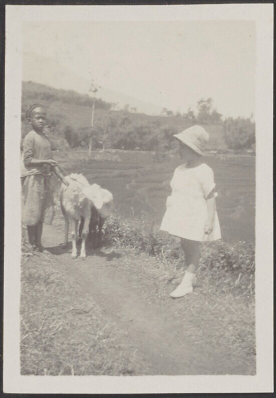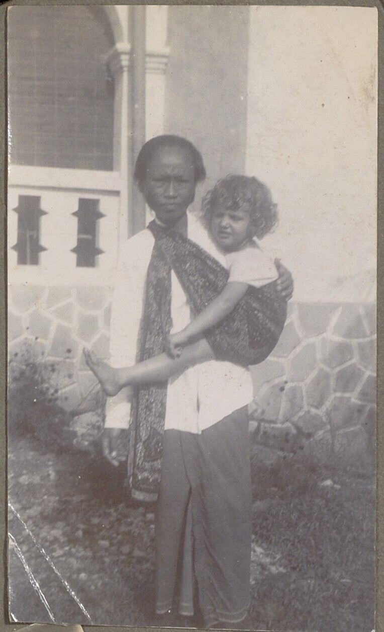 Europees kind met Javaanse kinderverzorgster in de tuin