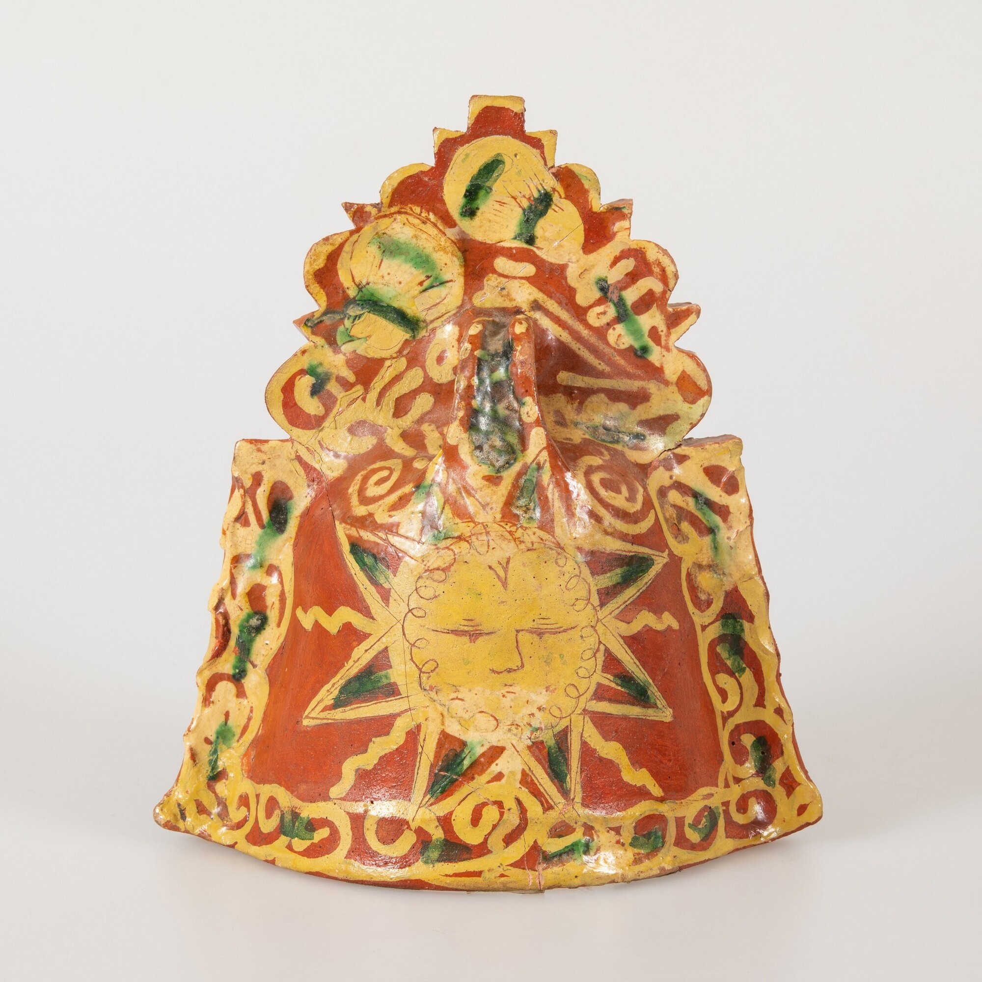 Vuurstolp van rood, geglazuurd aardewerk met decoratie