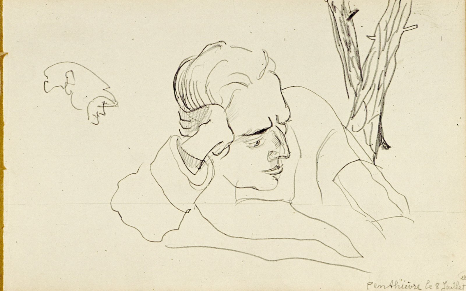 Liggende man, het hoofd leunend op een elleboog