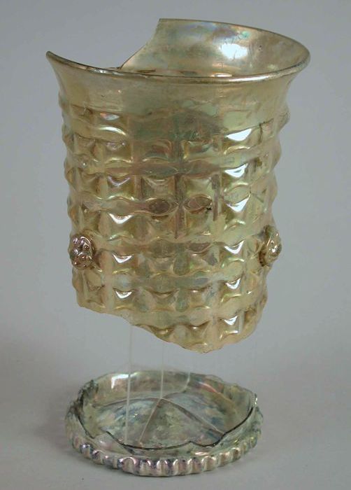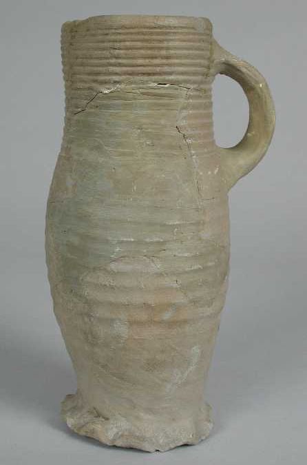 Steengoed drinkkan op geknepen voet, ovale doorsnede